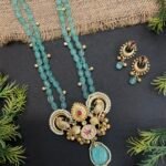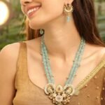 This elegant golden necklace set is designed with a graceful blend of soft aqua beads and detailed antique gold elements that create a rich and stylish look. The necklace features multiple strands of smooth aqua-colored beads that give it a refreshing and sophisticated appearance. Small golden bead accents are placed between the strands, adding a delicate shimmer that enhances the overall beauty of the design.