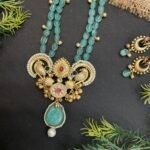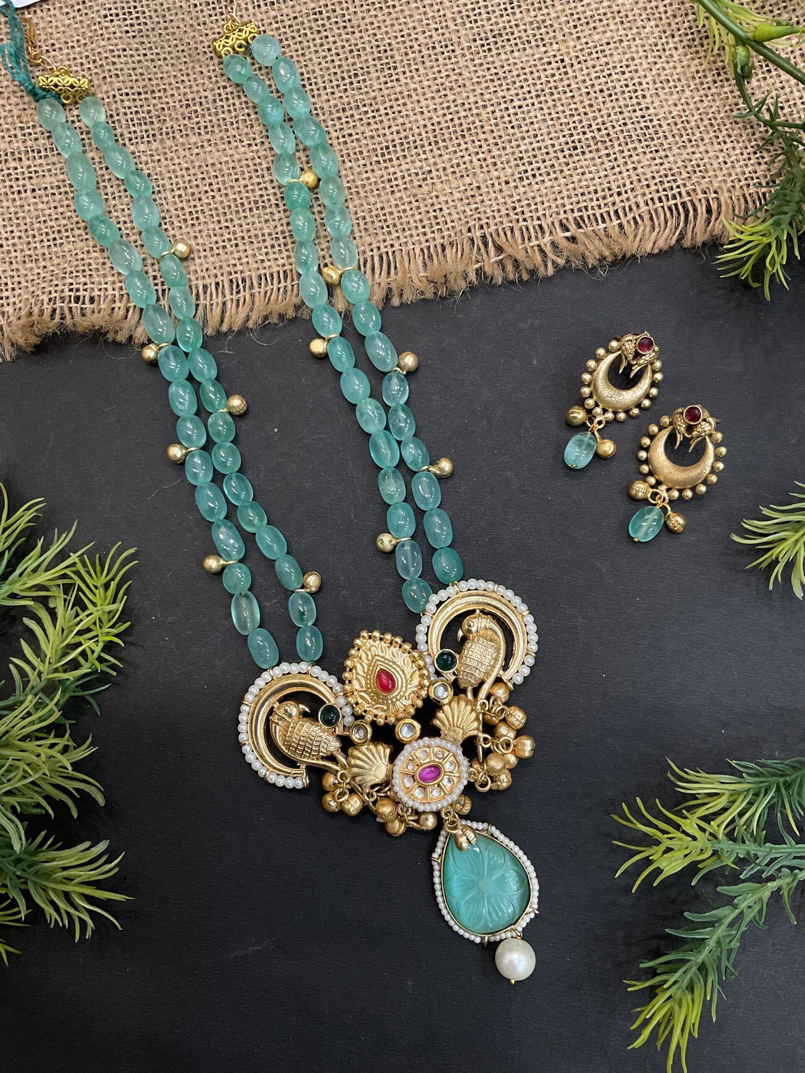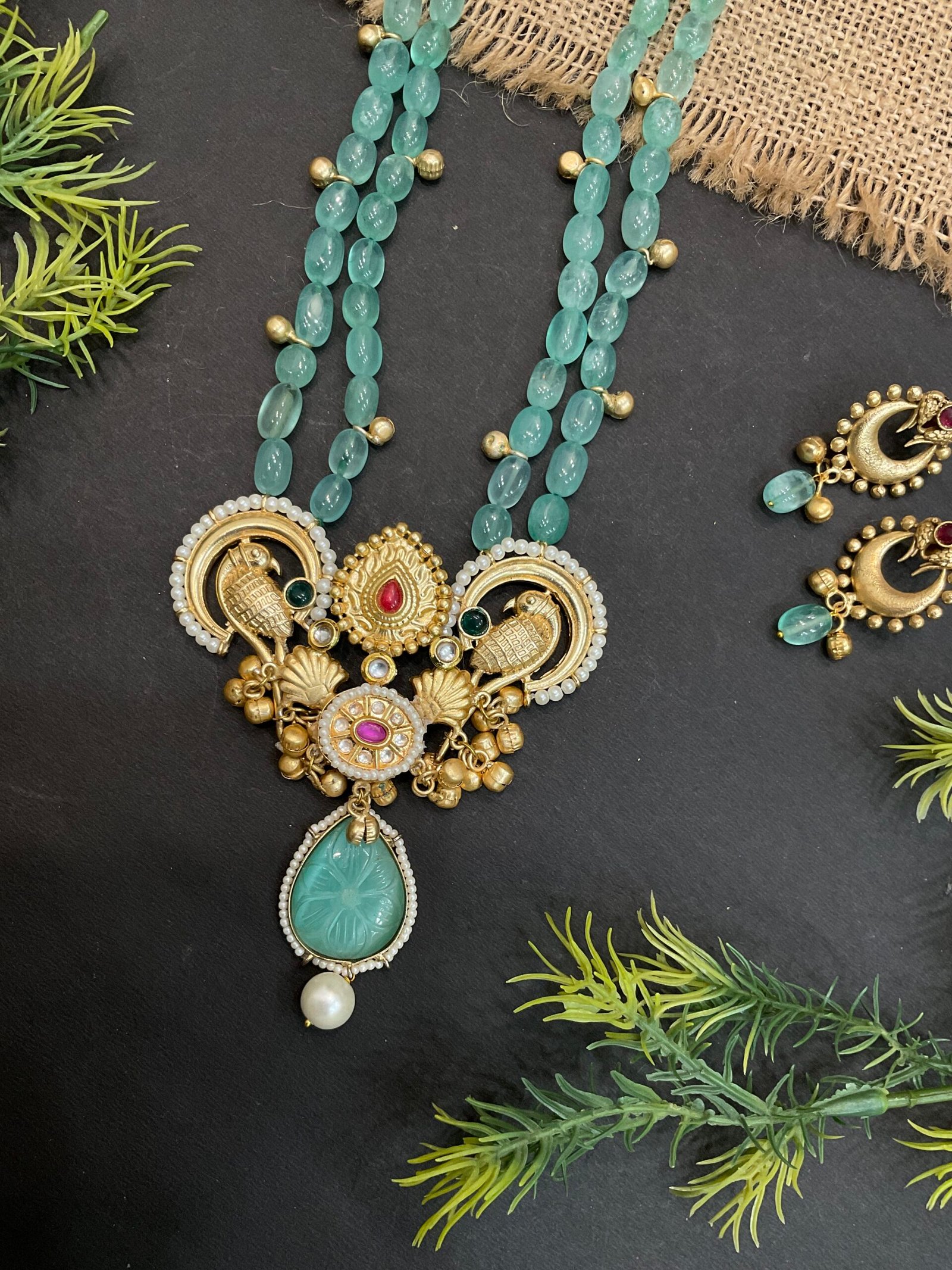 The centerpiece of the necklace is beautifully crafted with intricate golden motifs, including artistic bird designs on both sides that bring a unique traditional touch to the set. Colorful red, green, and white stone details in the center make the necklace more vibrant and eye-catching. At the bottom, a carved aqua stone drop with a pearl hanging below adds movement and elegance, making the design stand out even more.
