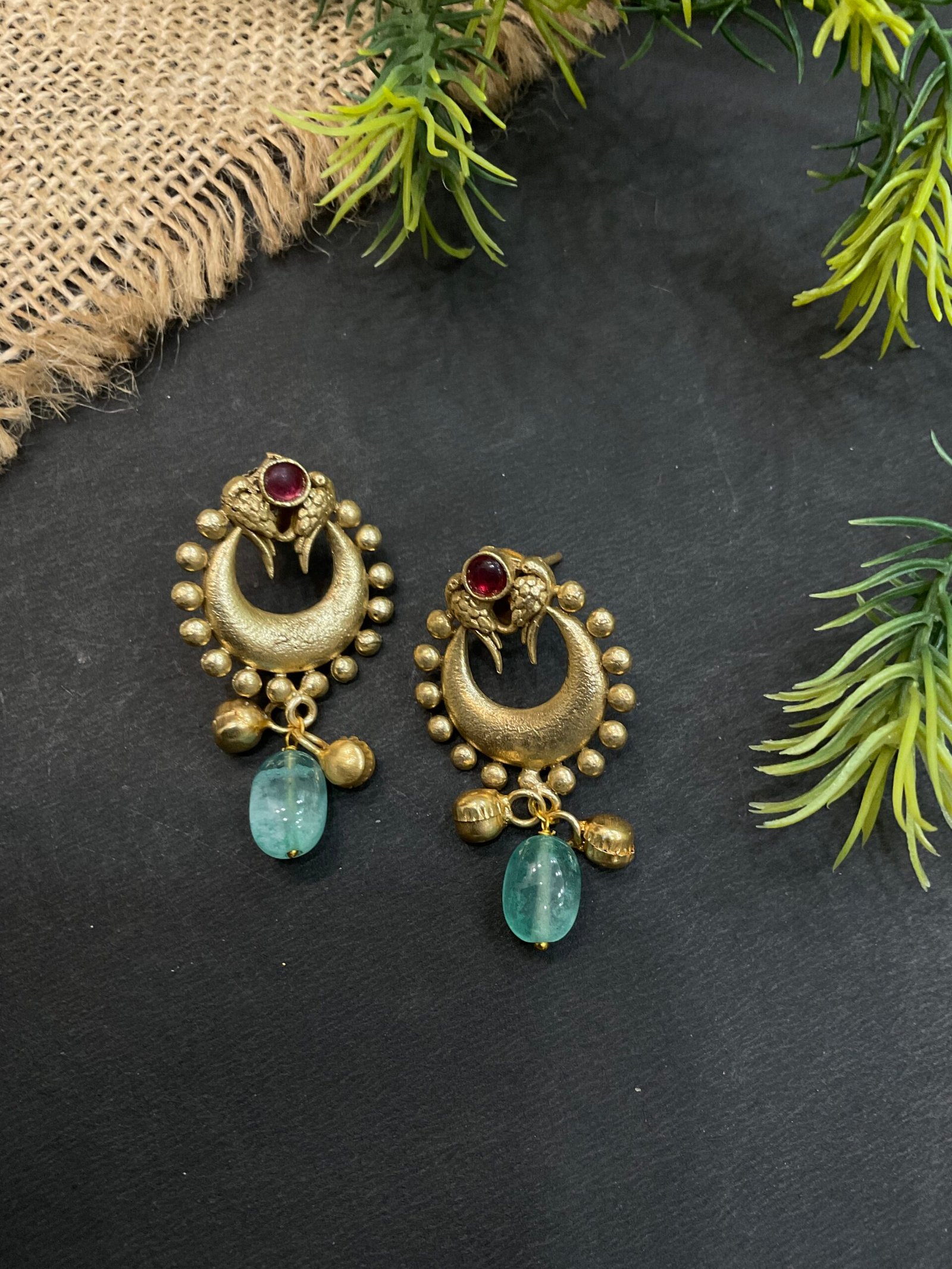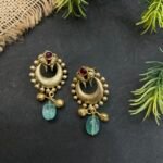The matching earrings are designed in a coordinated style with crescent-shaped golden detailing, small red stone accents, and aqua bead drops that perfectly complement the necklace. The combination of aqua beads, antique gold finish, and traditional craftsmanship makes this set a beautiful choice for festive occasions, family functions, weddings, and ethnic celebrations.