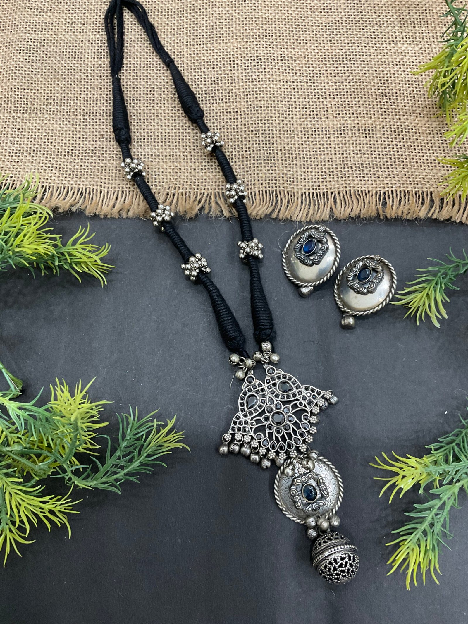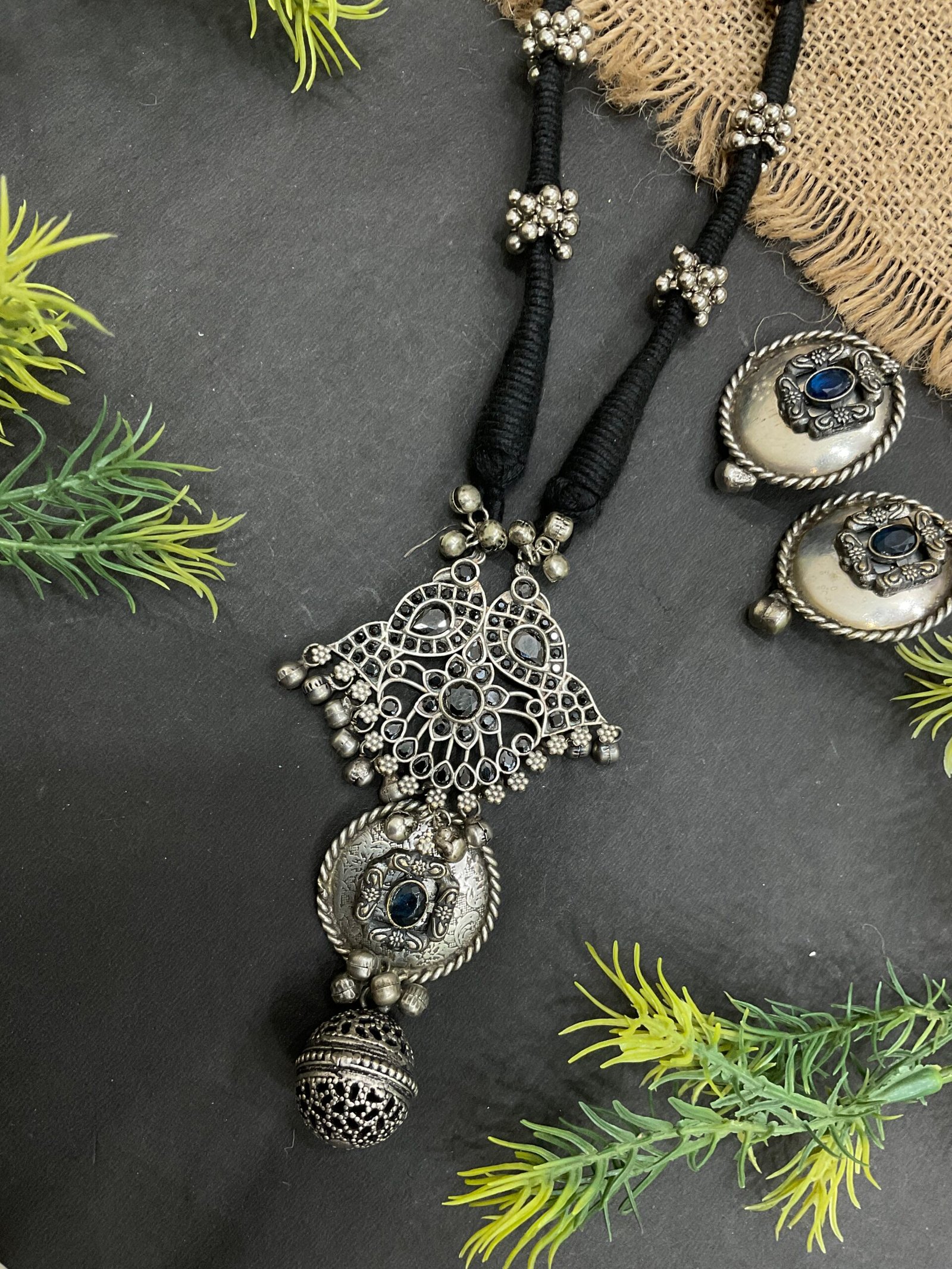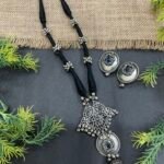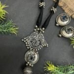 The center pendant is the main attraction of this set. It has an intricate silver-toned design with fine openwork patterns that create a handcrafted look. Black stone accents are placed throughout the pendant, giving the necklace a stylish contrast against the antique silver finish. Tiny silver ghungroo-style beads hang below the pendant, adding gentle movement and a traditional touch. The lower dome-shaped charm completes the design and gives the necklace a unique ethnic beauty.