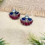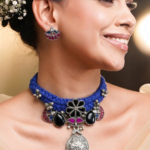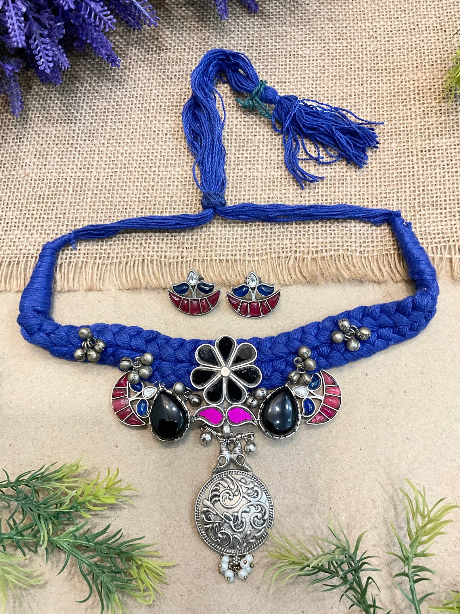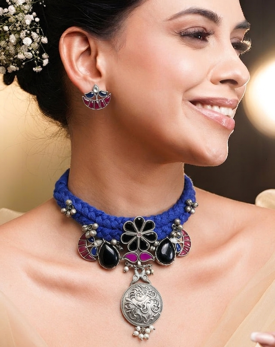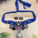 This elegant blue thread choker set beautifully blends bold color with traditional charm. Crafted with a thick braided blue thread base, the choker highlights a striking black floral motif at the center, creating a graceful focal point. On both sides, sleek black tilak-shaped stones add a modern yet ethnic touch, perfectly balancing the design. The highlight of the piece is the hanging silver-toned traditional circular pendant, intricately carved and finished with delicate pearl drops that enhance its heritage appeal. Paired with matching earrings, this set creates a stunning blue and black combination that stands out effortlessly.