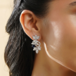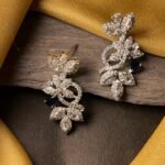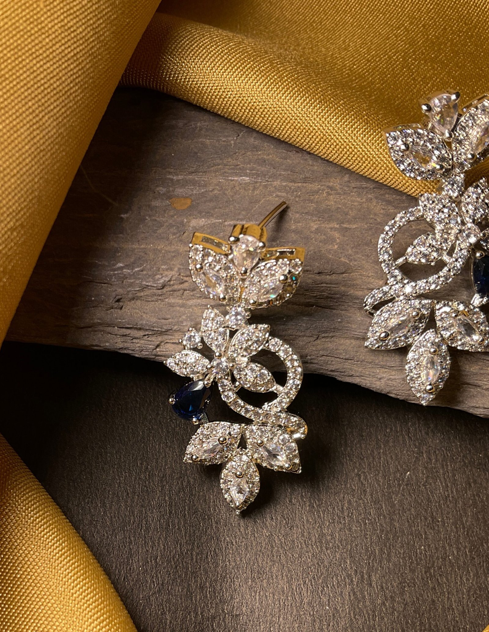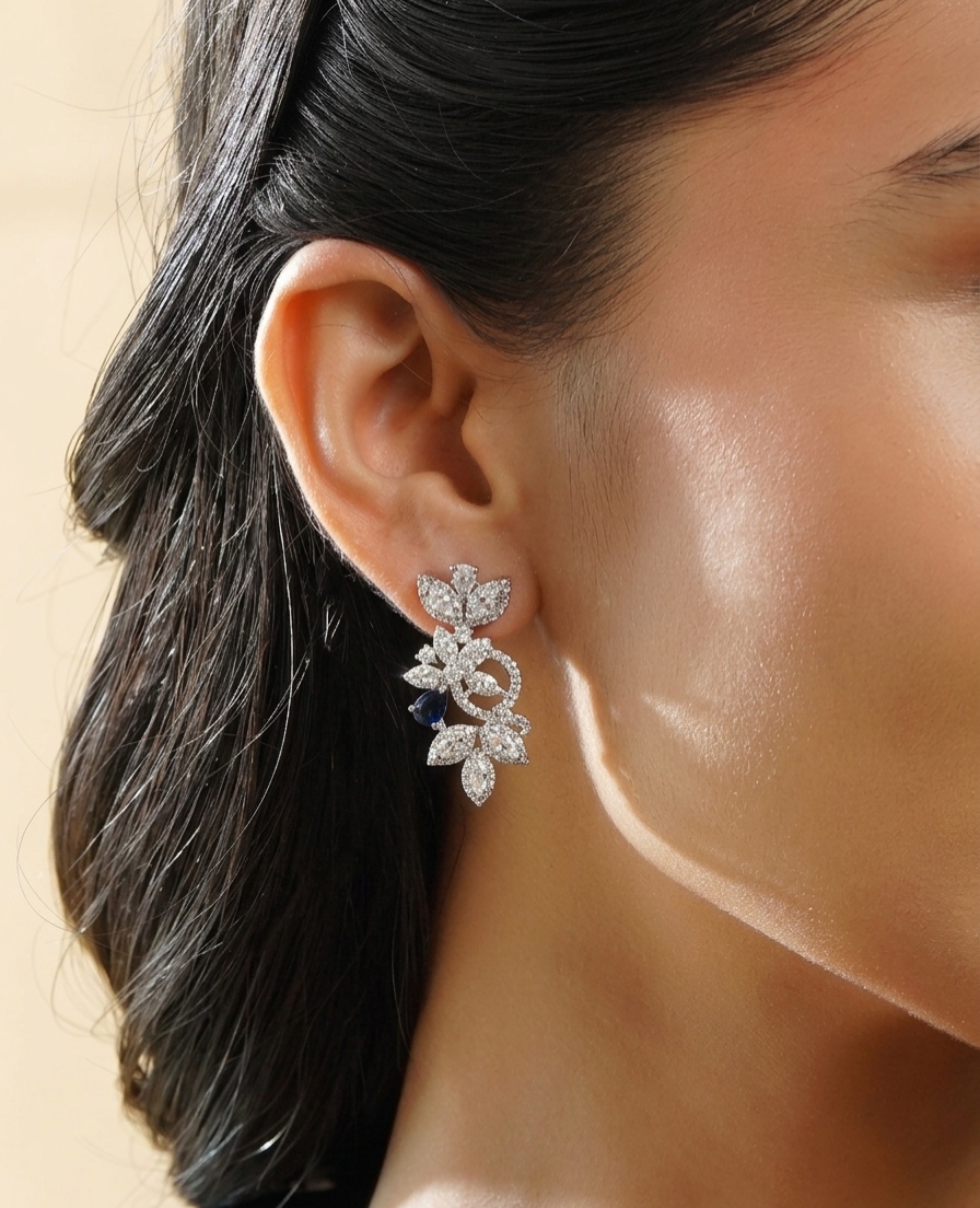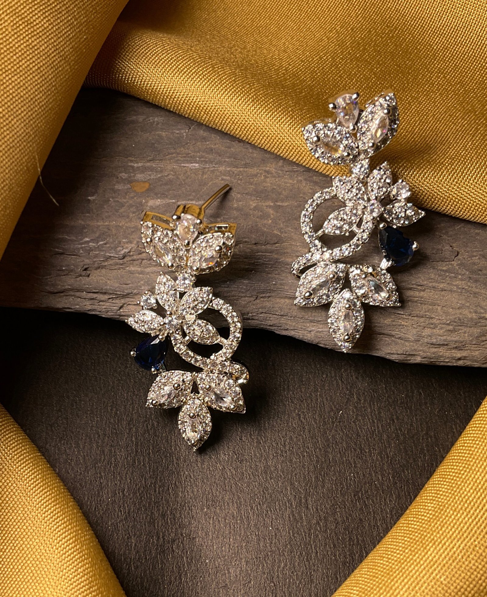 This American diamond earring features an elegant floral design that looks rich and eye-catching. It is crafted with high-quality cubic zirconia stones that shine like real diamonds, giving a beautiful sparkling effect.