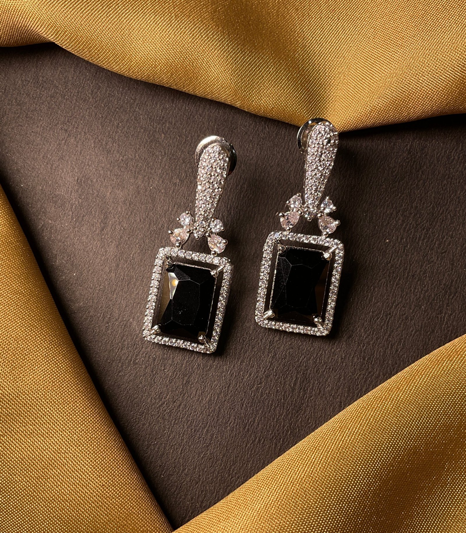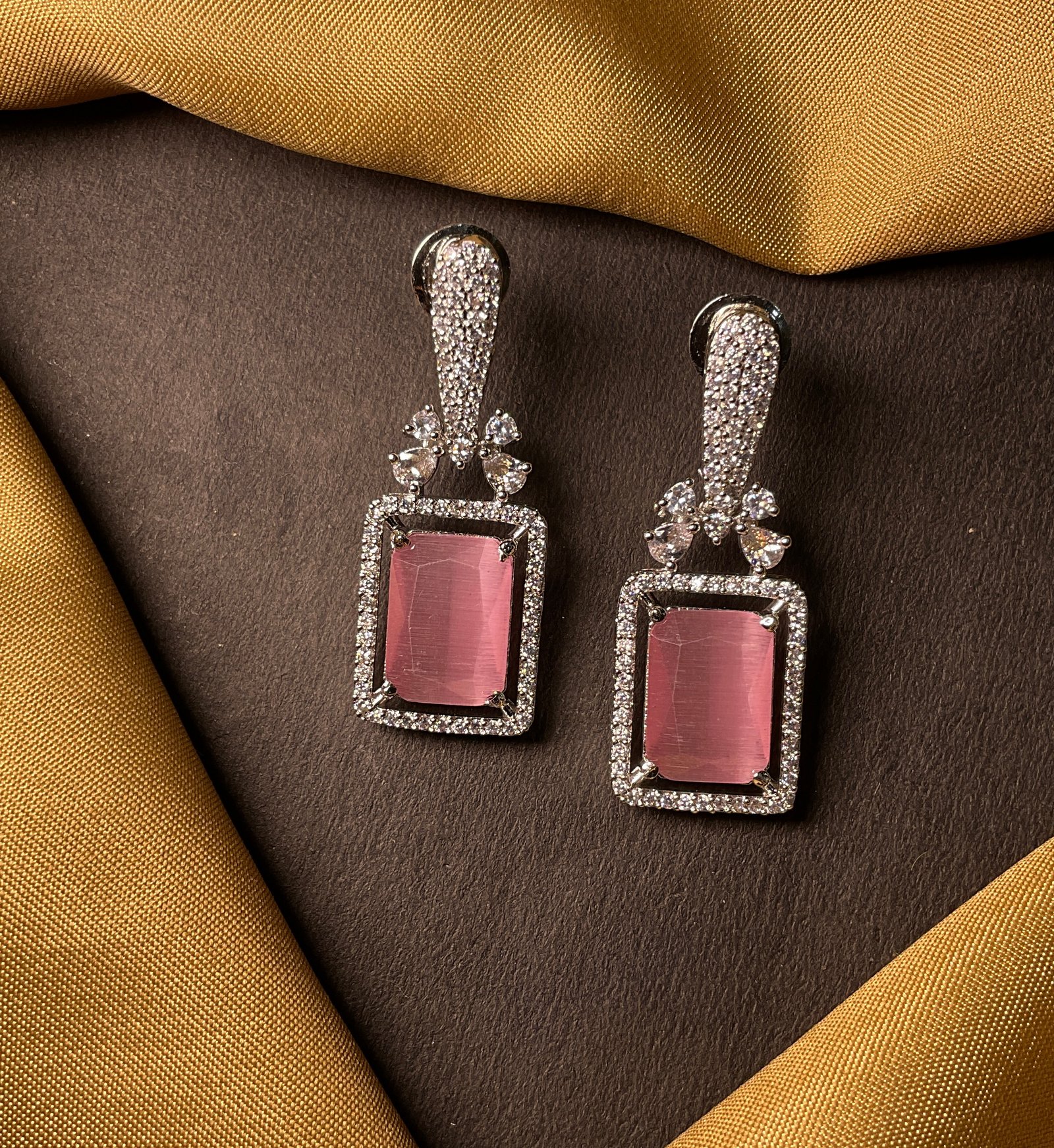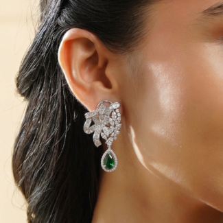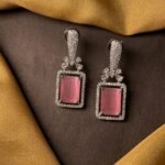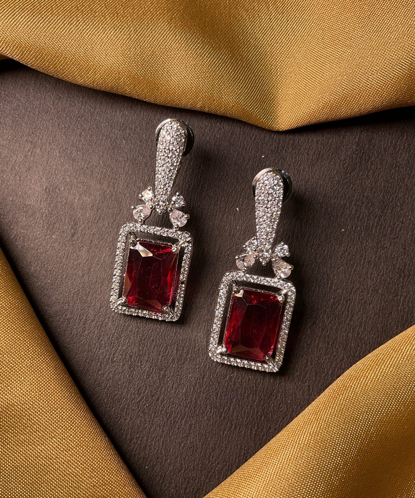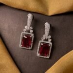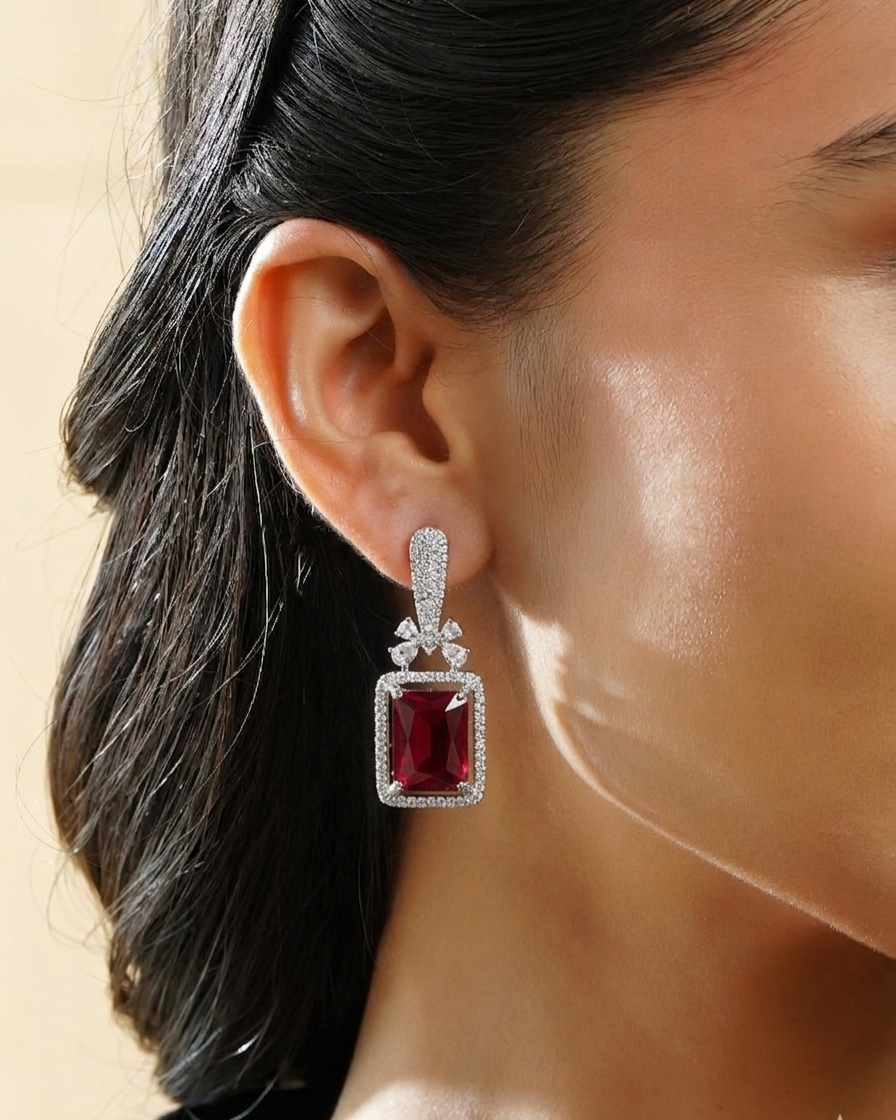 Above the red stone, there is a delicate floral design made with clear American diamonds. This small flower-like detail adds a soft and feminine touch and connects the lower stone to the top part of the earring.