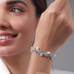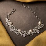 The design features delicate flower shapes connected in a row, giving it a soft and feminine feel. Each flower is decorated with tiny, shiny stones that catch the light from every angle. Between the floral patterns, there are teardrop-shaped stones and smooth pearl-like beads that add a classy and stylish touch.
