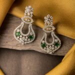 The base of the earring has a gold-toned finish, which complements the sparkle of the stones and the deep green accents perfectly. The overall look is polished, detailed, and elegant, making it suitable for traditional as well as modern outfits.