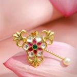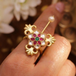 This beautiful ring features a classic and elegant design inspired by traditional royal jewelry. At the center, there is a lovely flower motif made with bright pink stones arranged like petals, giving it a rich and vibrant look. In the middle of the flower, a small green stone adds a fresh contrast and enhances the overall beauty of the design.