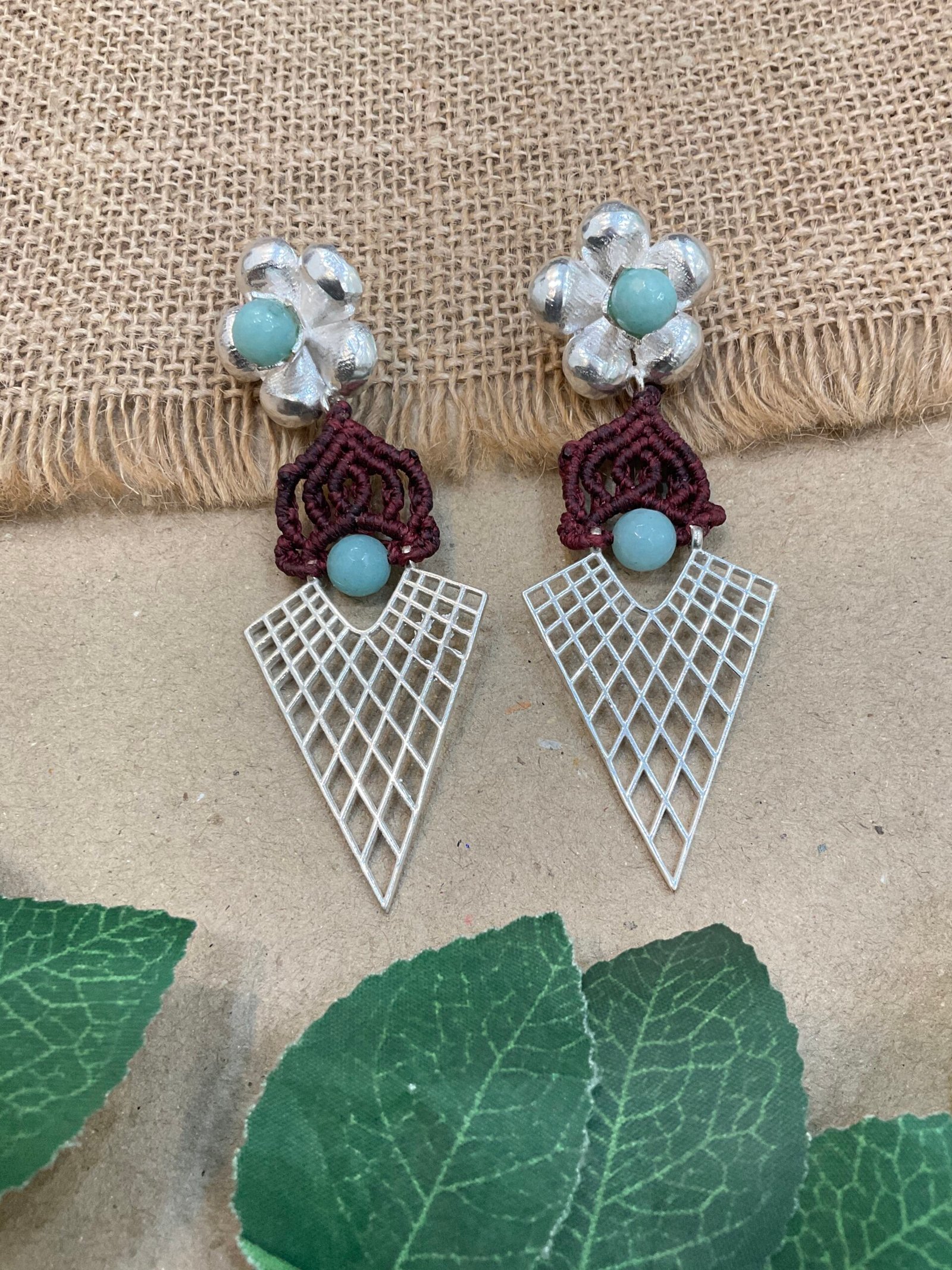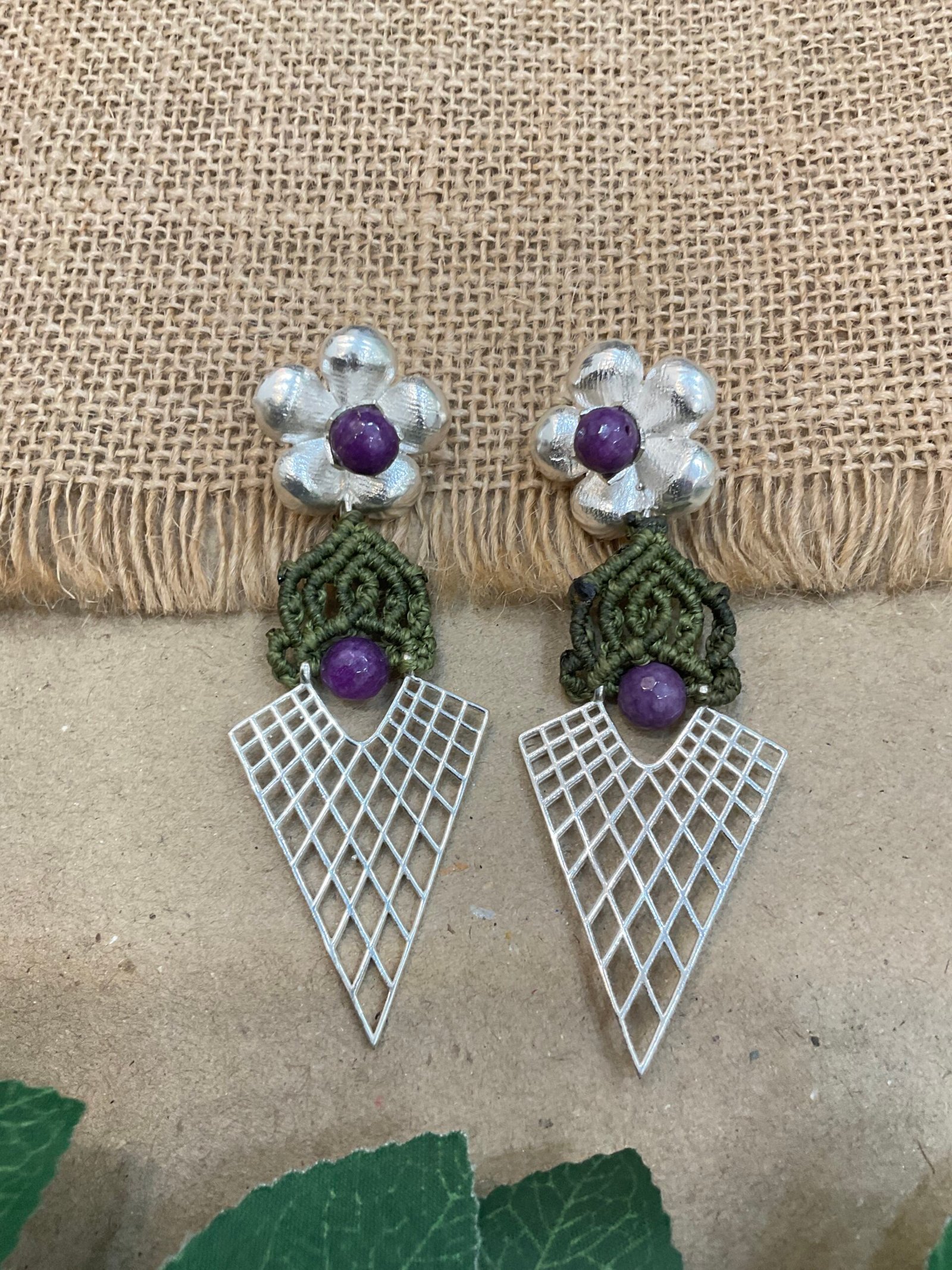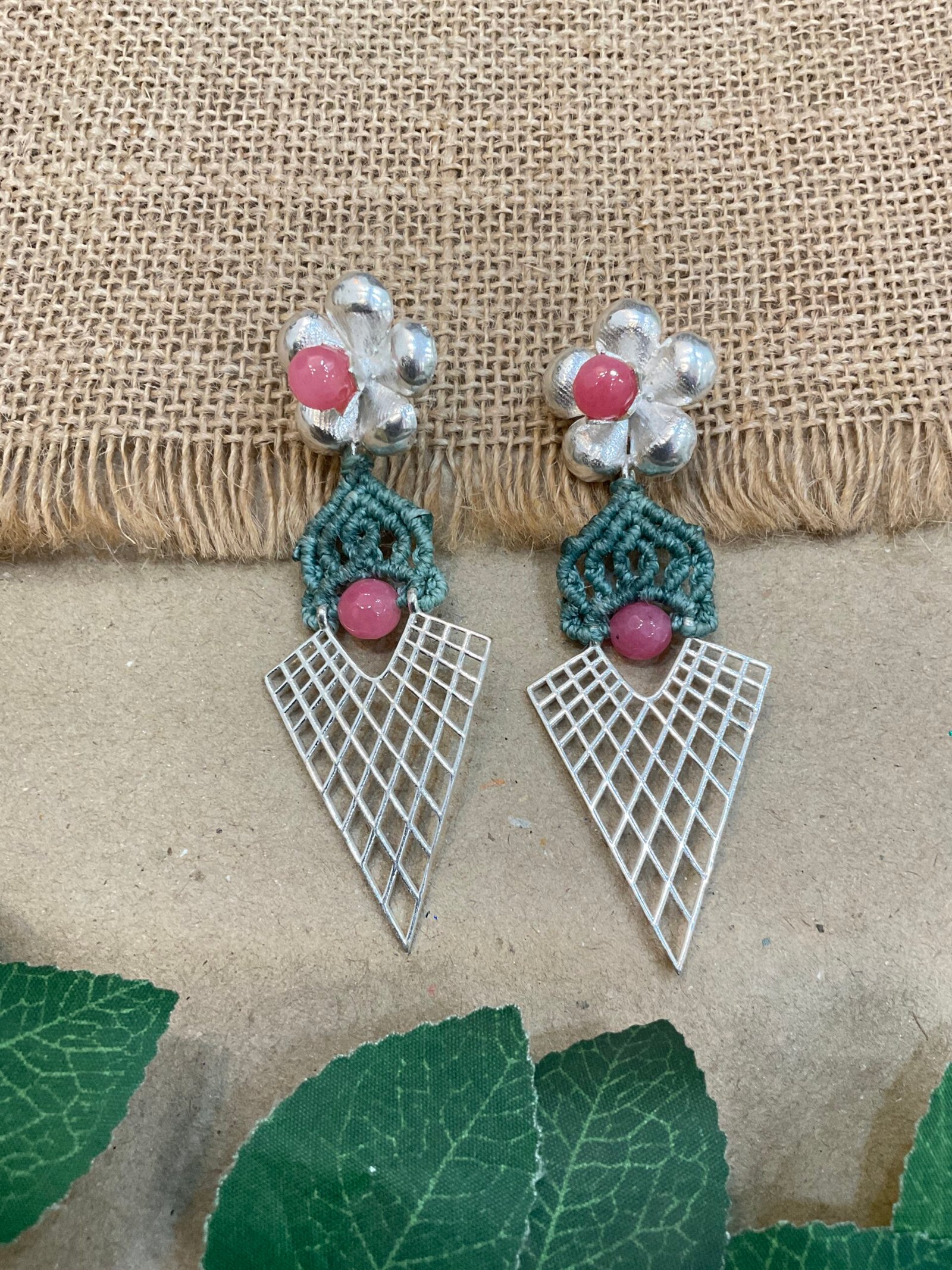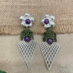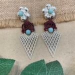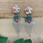 Below the floral stud, fine thread work is carefully woven into a small decorative pattern that gives the earring a handmade and unique appeal. A matching round bead in the center creates a lovely connection between the upper and lower parts of the design. The bottom section features a lightweight silver mesh pendant in a sharp geometric shape, adding a modern style to the traditional handcrafted look.