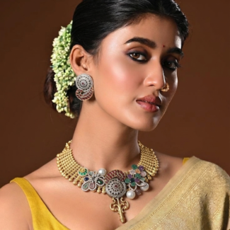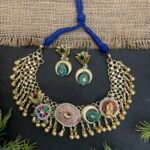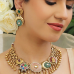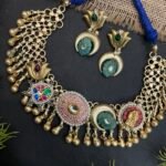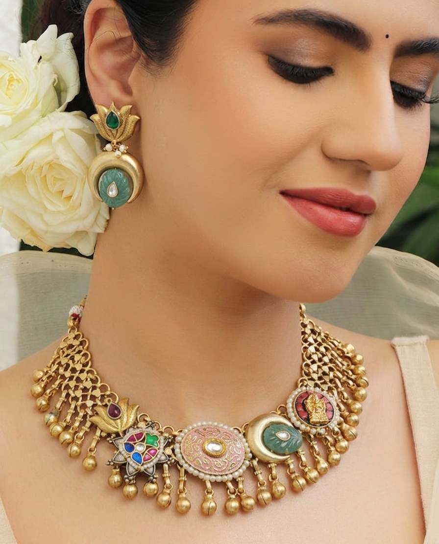 Soft pastel pink enamel work in the middle adds a gentle feminine touch, while the green carved stones bring freshness and contrast to the warm gold finish. Small pearl-like bead borders around selected motifs enhance the overall beauty and make the design look more luxurious. Tiny hanging golden drops at the bottom create gentle movement and give the necklace a classic ethnic style.