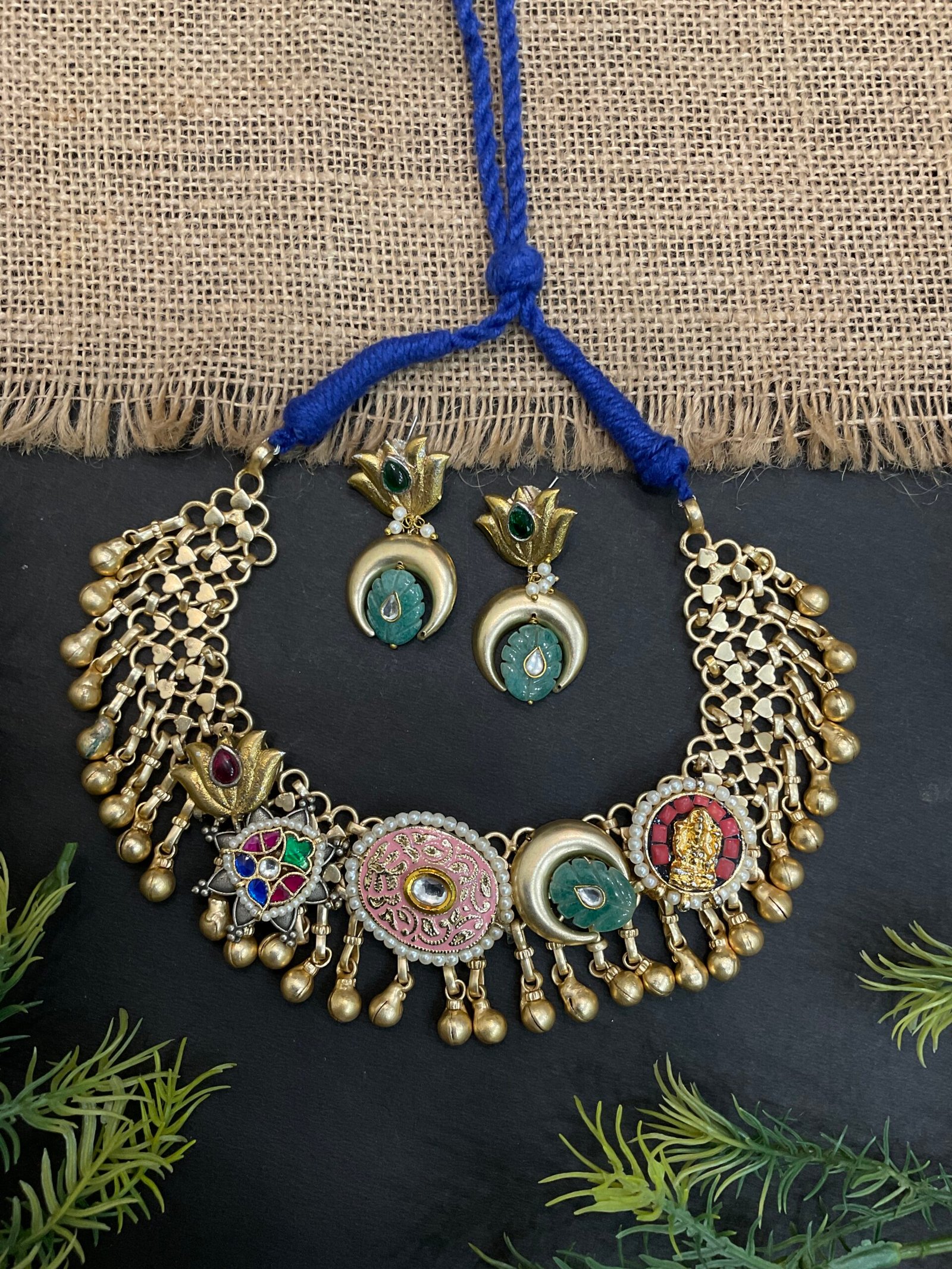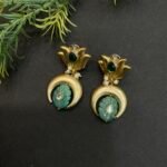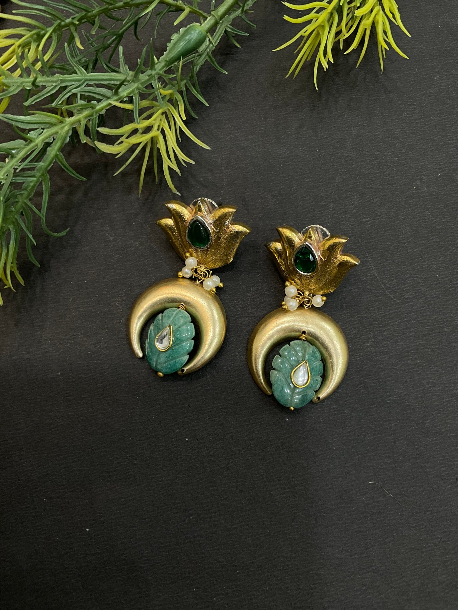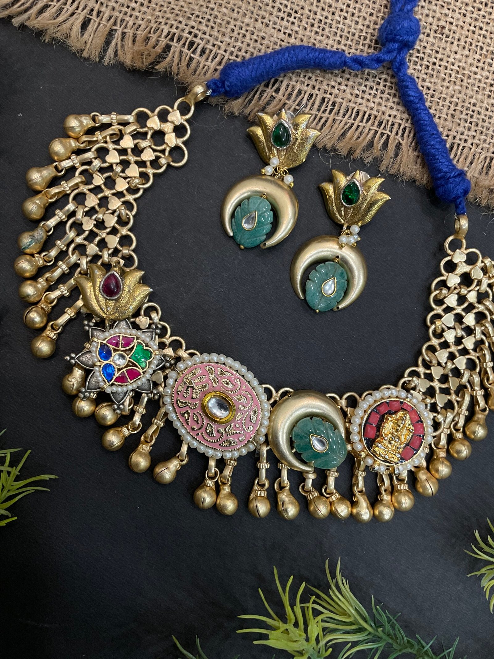 The matching earrings complement the necklace perfectly with a floral lotus-inspired top, green stone detail, and crescent-shaped hanging design. Together, the necklace and earrings create a coordinated statement set that feels both traditional and stylish.