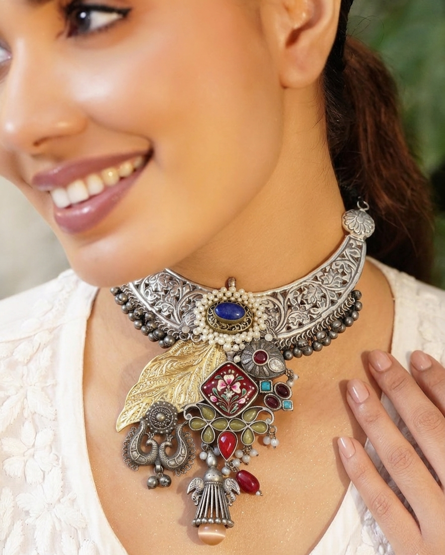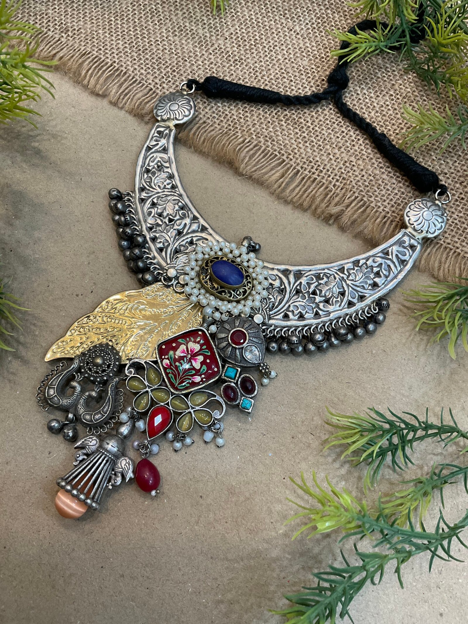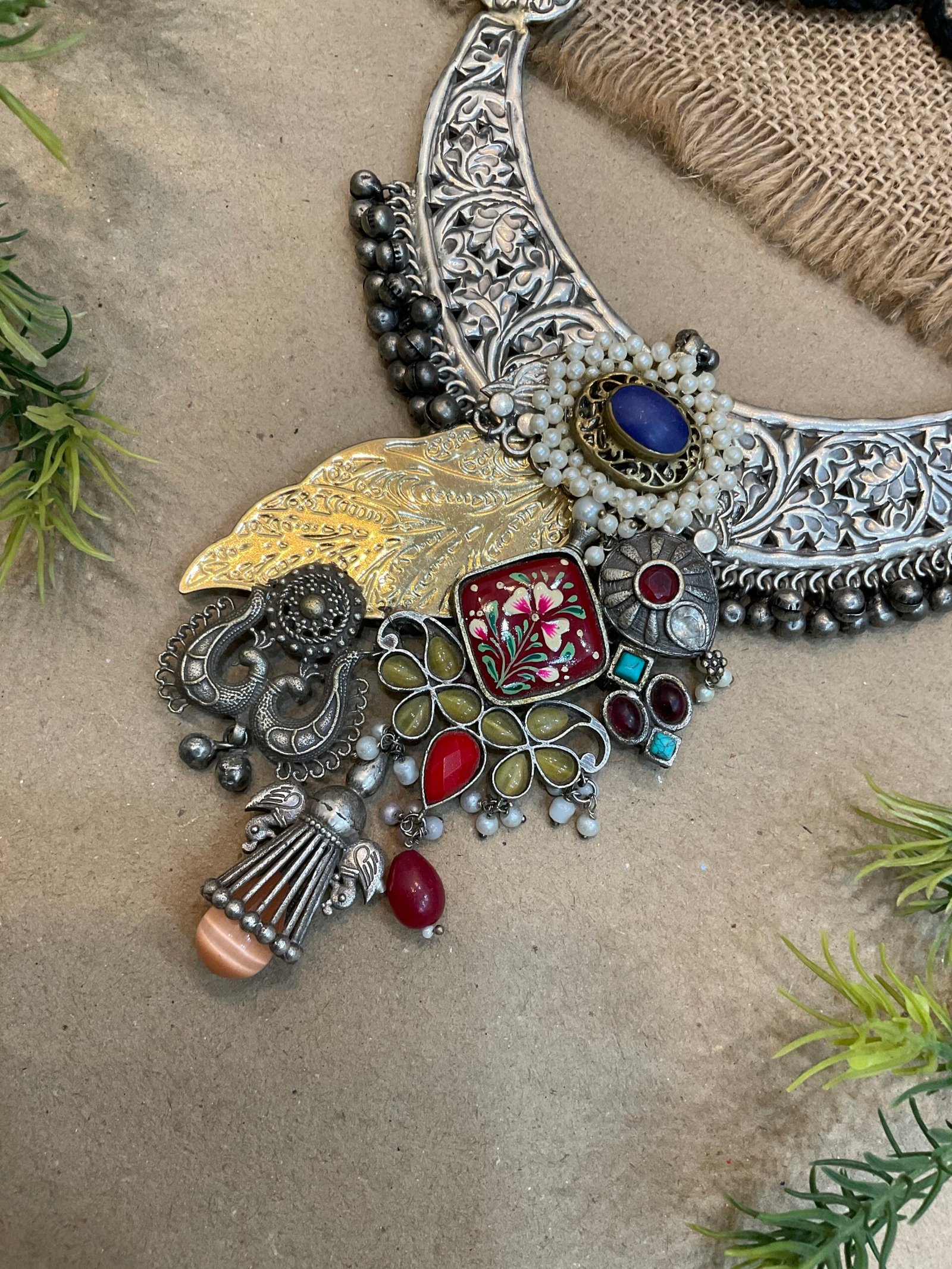 At the center, the necklace showcases a stunning arrangement of decorative elements that create a layered and artistic look. A prominent stone sits in the middle, surrounded by tiny pearl detailing that enhances its beauty. On one side, a beautifully engraved golden leaf design adds contrast and richness to the piece. The lower section is filled with a mix of traditional motifs, including enamel work, stone settings, and small handcrafted elements that give the necklace a unique character.