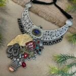 The Royal Heritage Carved Hasli is a beautifully crafted statement necklace that reflects traditional artistry with a bold and elegant design. The hasli is made in an antique silver finish and features detailed carved patterns all along the curved frame. These intricate floral engravings give the piece a rich handcrafted feel and make it look timeless and classic. The black thread closure at the top adds a simple and comfortable touch while keeping the focus on the detailed design.