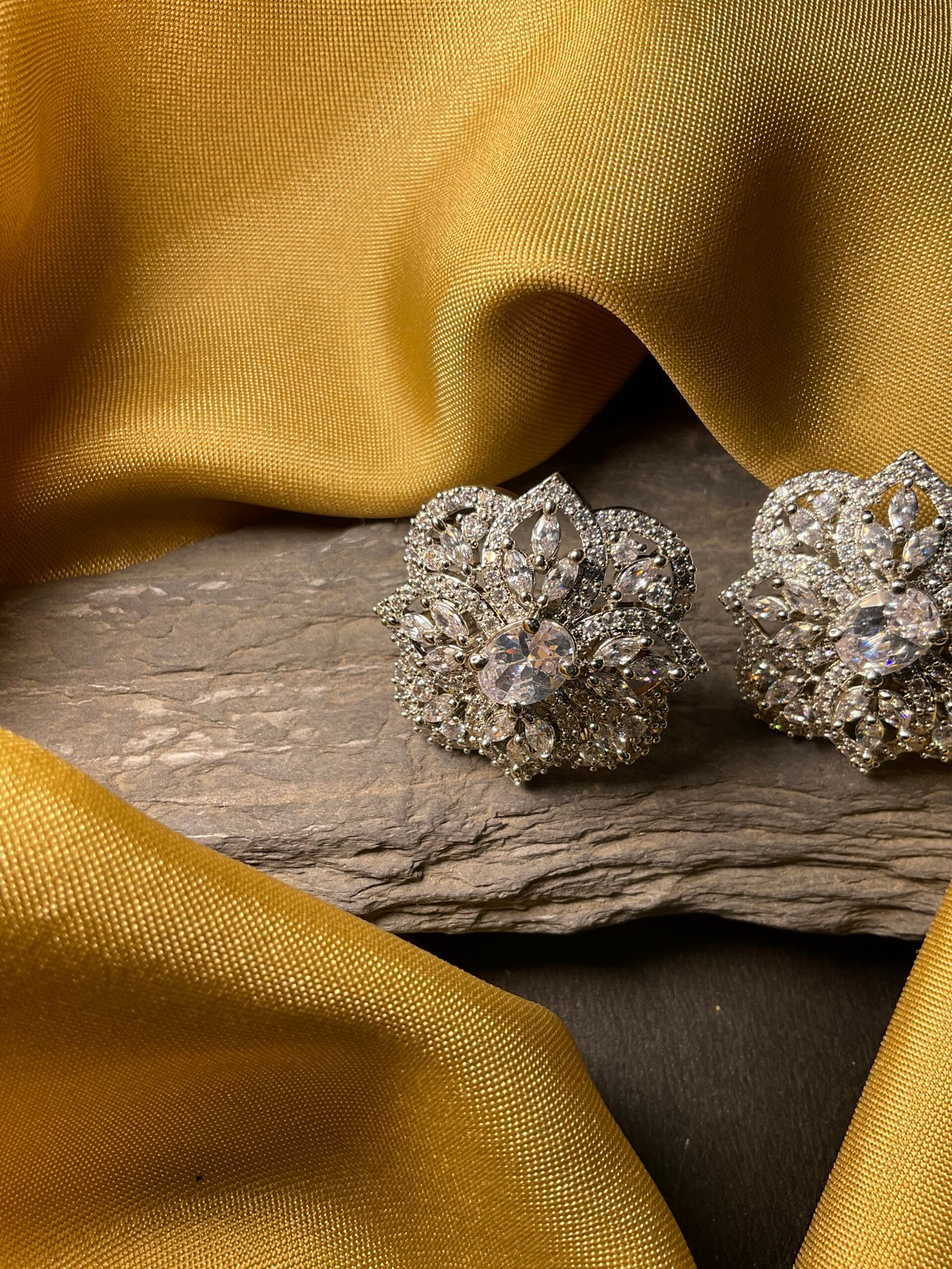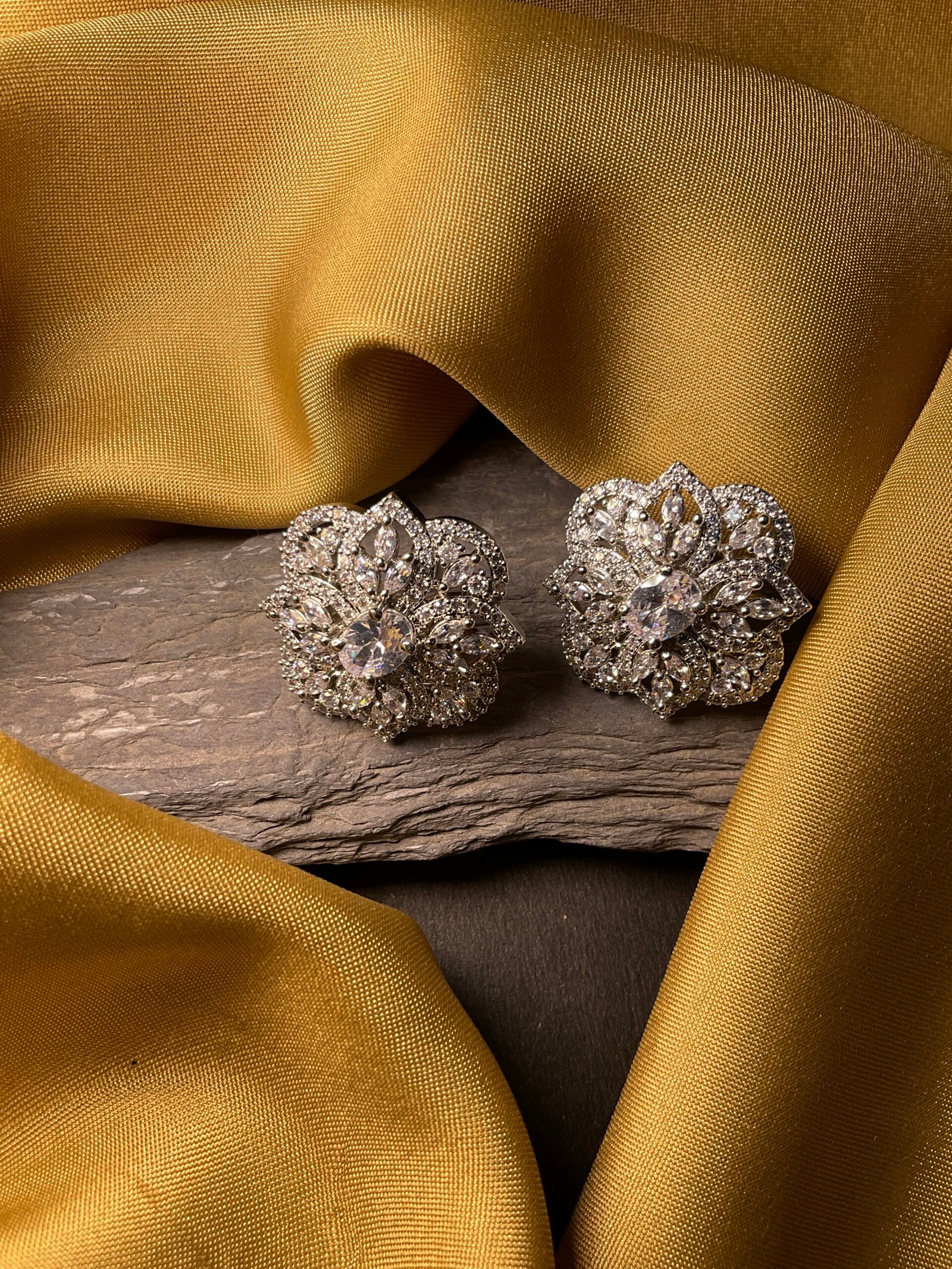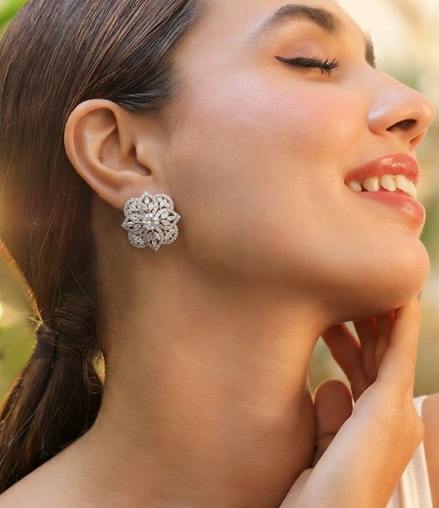 Each petal is finely outlined with tiny shimmering stones that add extra brilliance and make the design look more detailed and luxurious. The layered arrangement creates depth, allowing the earring to sparkle from every angle. The silver-tone finish enhances the shine of the stones and gives the piece a polished and refined look that feels timeless and stylish.