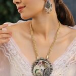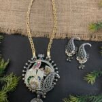 The centerpiece is further enhanced with tiny silver bead drops around the border, giving the necklace a soft movement and elegant finish. A decorative silver hanging charm at the bottom adds extra beauty and makes the design look more artistic and regal. The blend of silver and gold tones makes this necklace stand out while keeping it versatile enough to pair with many ethnic outfits.