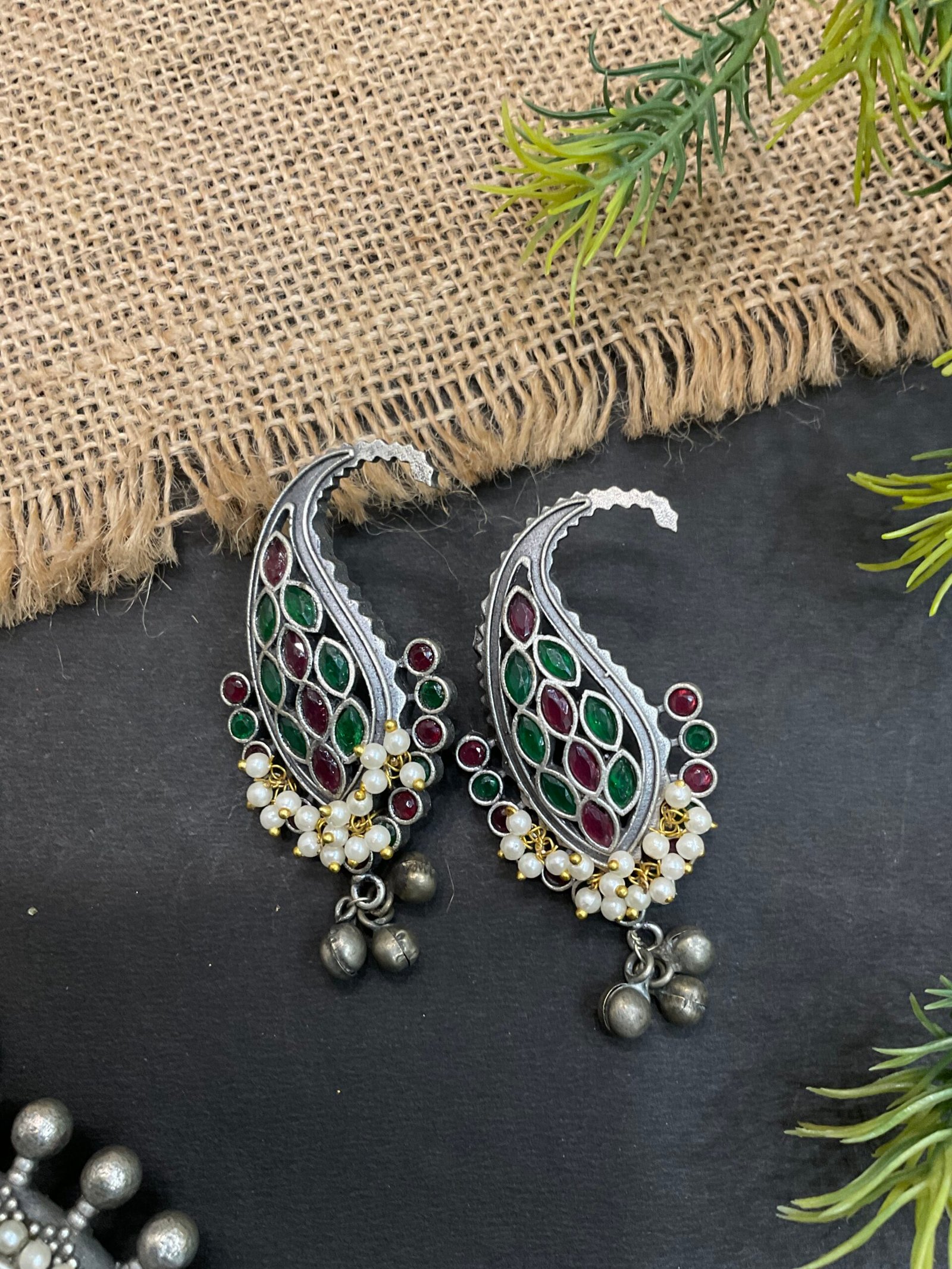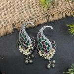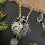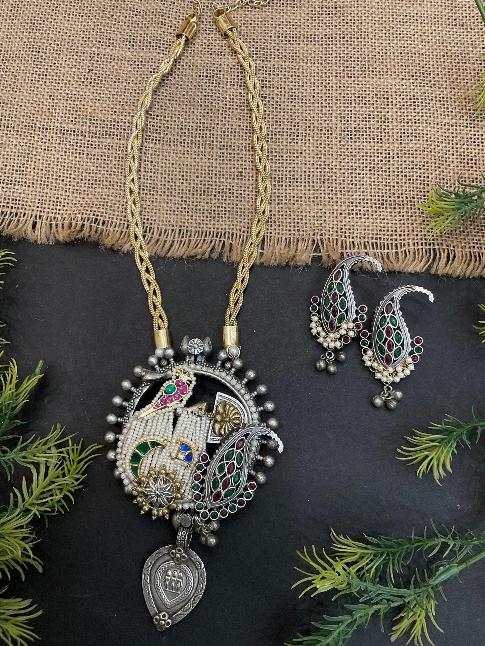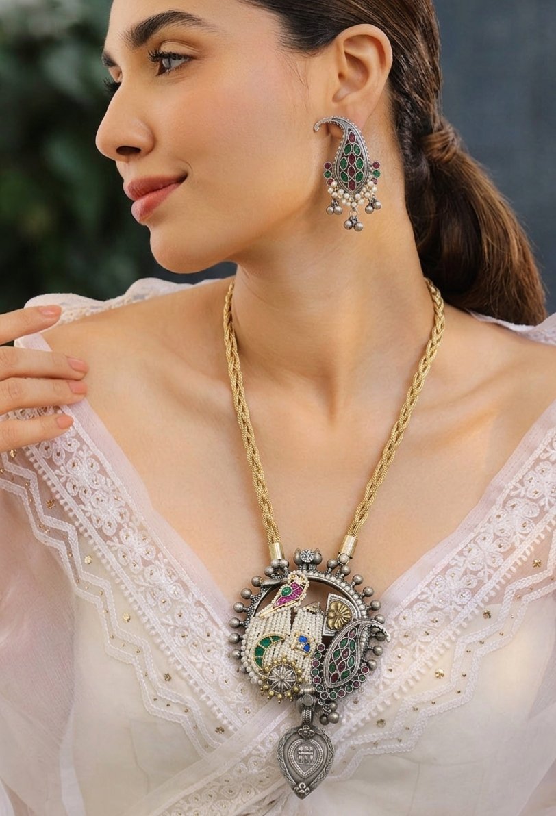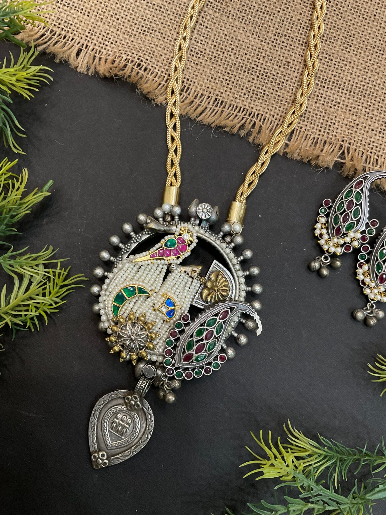This stunning silver necklace set features a unique long necklace design beautifully paired with a rich golden braided chain that creates a striking contrast. The necklace centerpiece is crafted in an antique silver finish and decorated with intricate detailing that gives it a traditional handcrafted look. The pendant showcases graceful peacock-inspired patterns with red and green stone work, delicate white pearl strings, and small enamel accents in blue and green that add a vibrant touch to the design.
