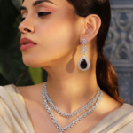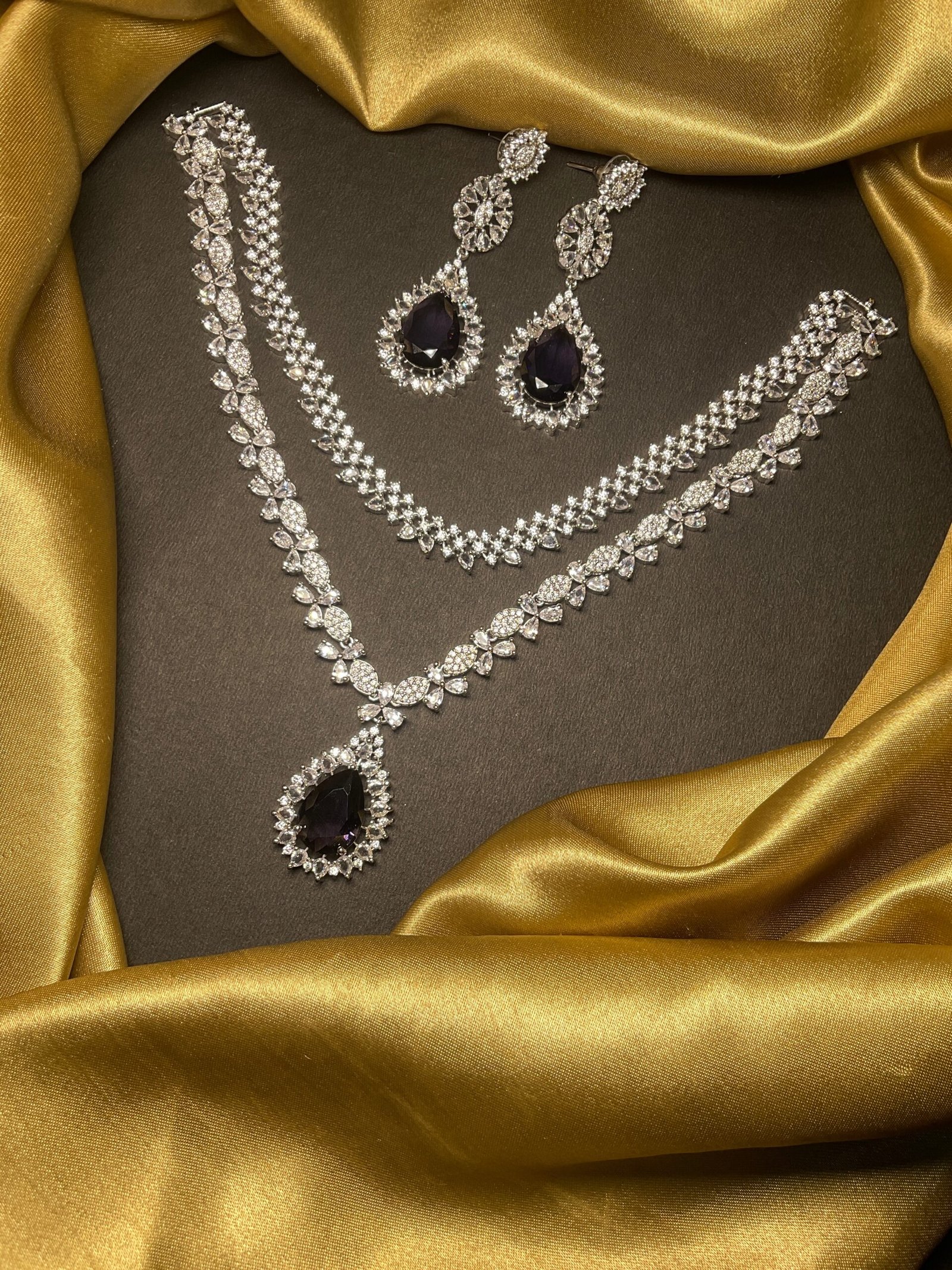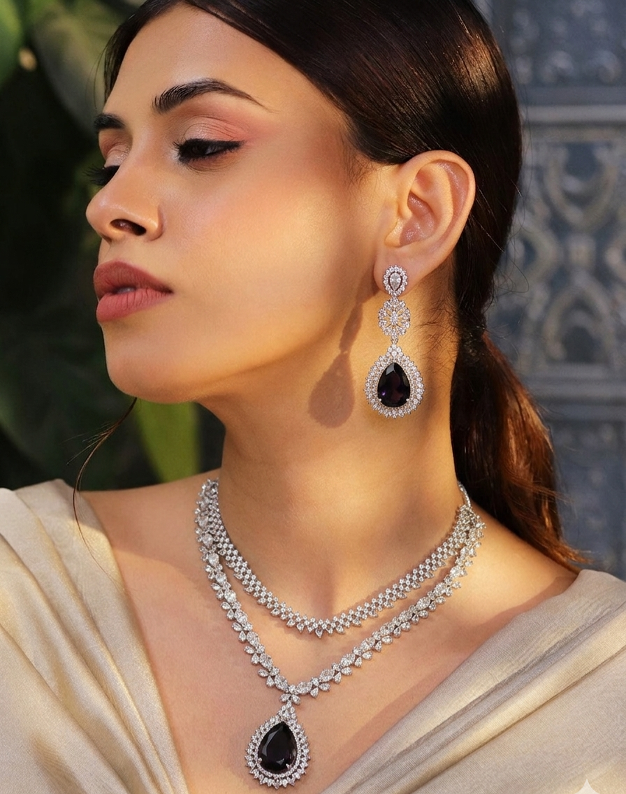 This beautiful American diamond necklace set has a very graceful and classy look. It is designed with fine white stones that shine like real diamonds, giving it a rich and elegant feel. The necklace has a double-layer style, where one layer sits close to the neck and the second layer falls slightly lower, creating a soft and stylish pattern.