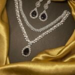 The main highlight of the set is the stunning teardrop-shaped black stone pendant at the center. This deep, dark stone adds a bold contrast to the sparkling white diamonds around it, making the design stand out beautifully. The pendant is surrounded by tiny shining stones that enhance its overall glow.