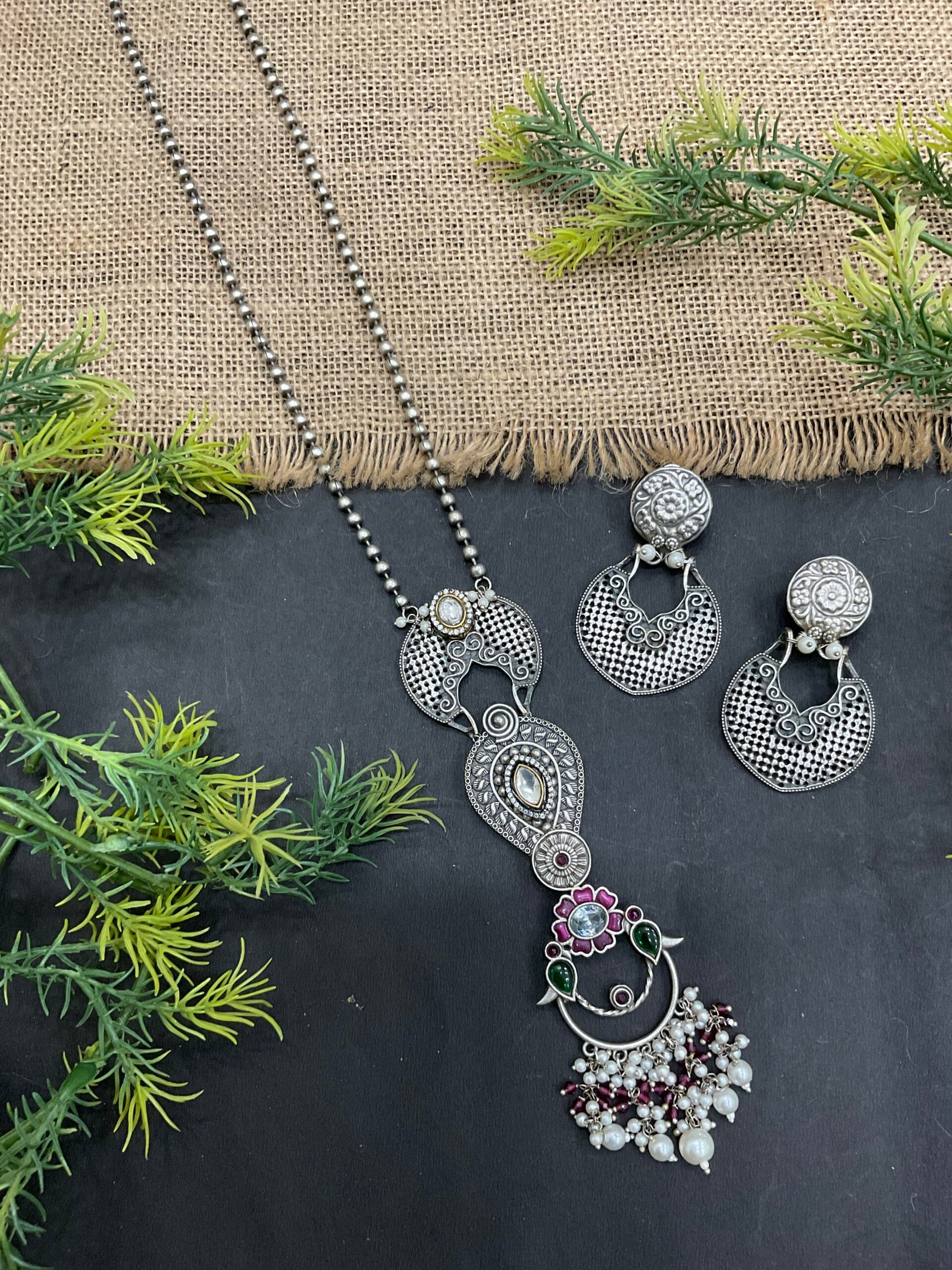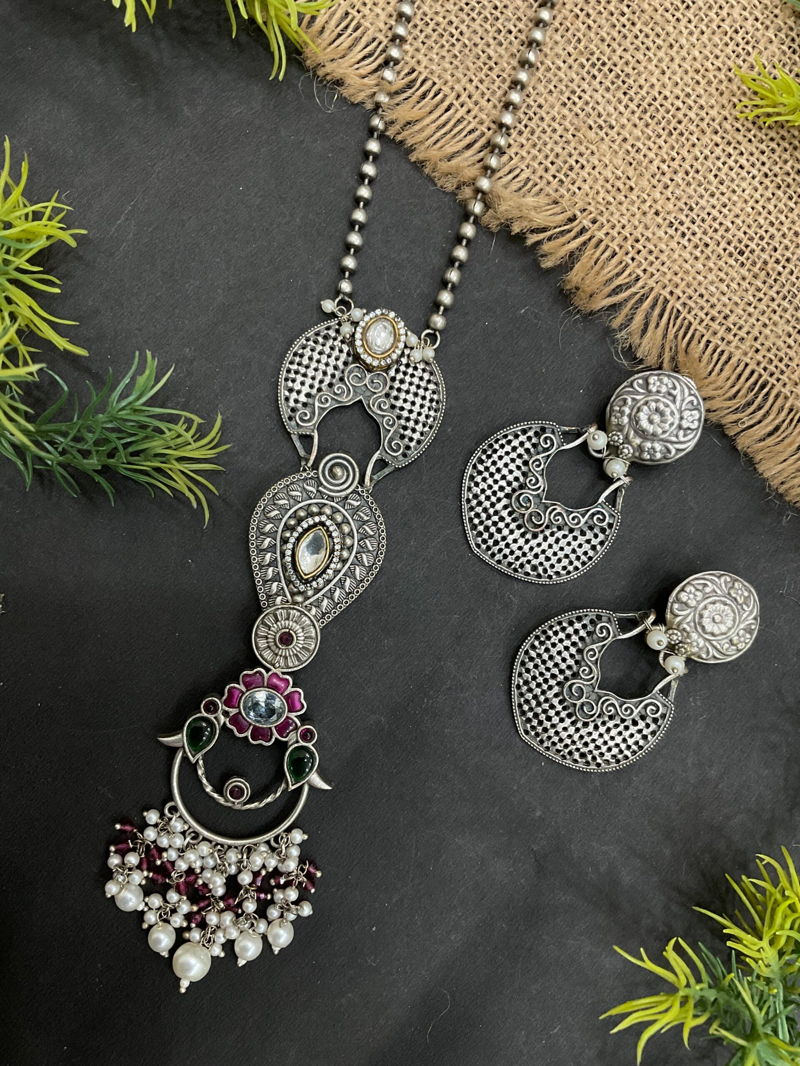 This silver necklace set is ideal for festive occasions, family gatherings, traditional events, and casual ethnic styling. It pairs beautifully with sarees, kurtis, salwar suits, and Indo-western outfits. With its elegant silver finish, colorful stone details, and pearl accents, this set adds charm and sophistication to any jewelry collection.