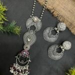 This silver look long necklace set is a graceful piece that beautifully combines traditional design with a stylish modern touch. The necklace features a sleek silver-tone ball chain that gives it a simple yet elegant base. The highlight of the set is its artistic layered pendant that creates a rich and eye-catching look.