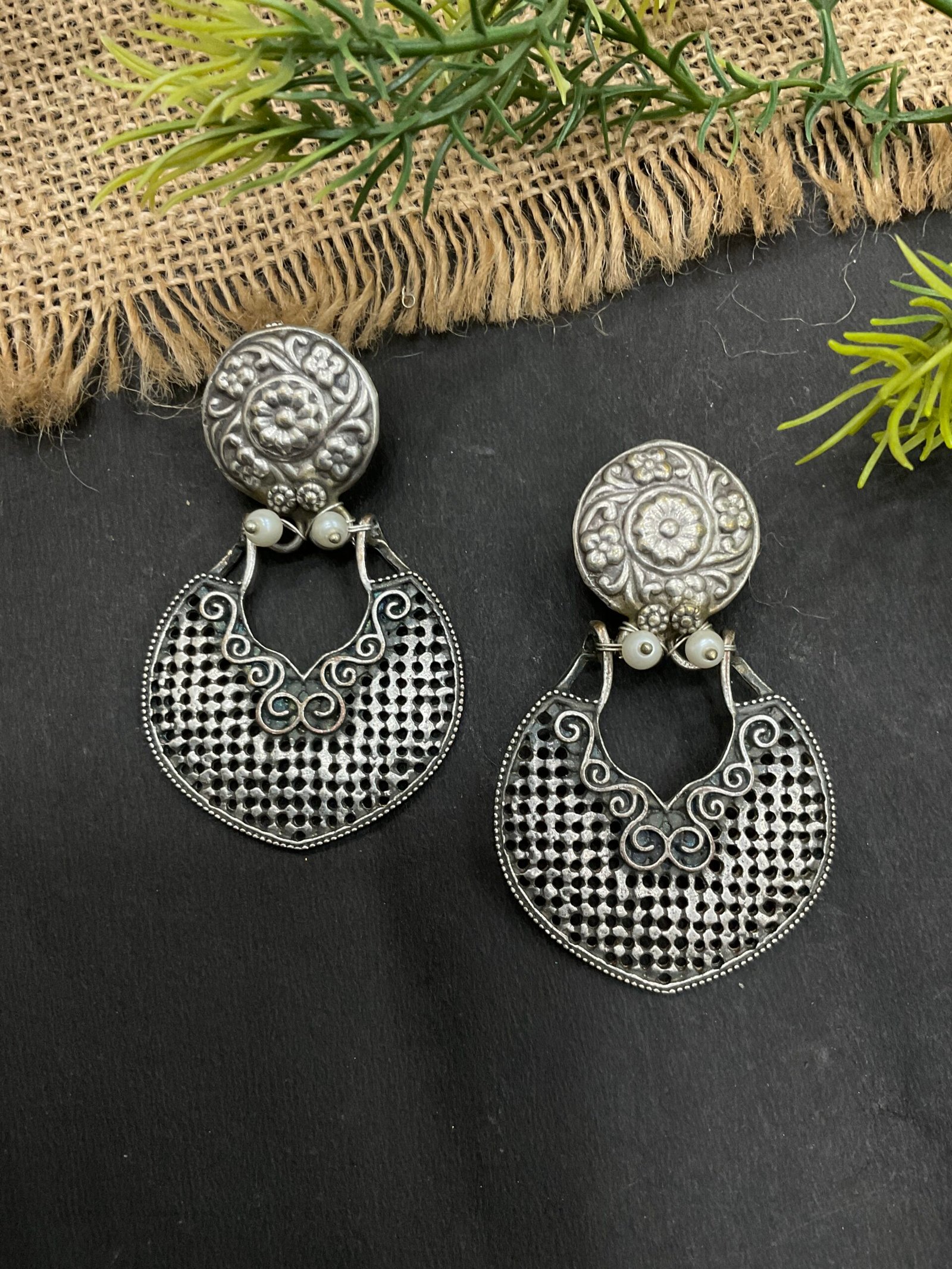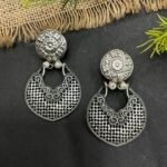 The matching earrings are designed with round floral tops and open circular drops featuring fine cutwork patterns. Their lightweight design makes them stylish while still being comfortable to wear. The earrings perfectly complement the necklace and complete the set with a balanced look.