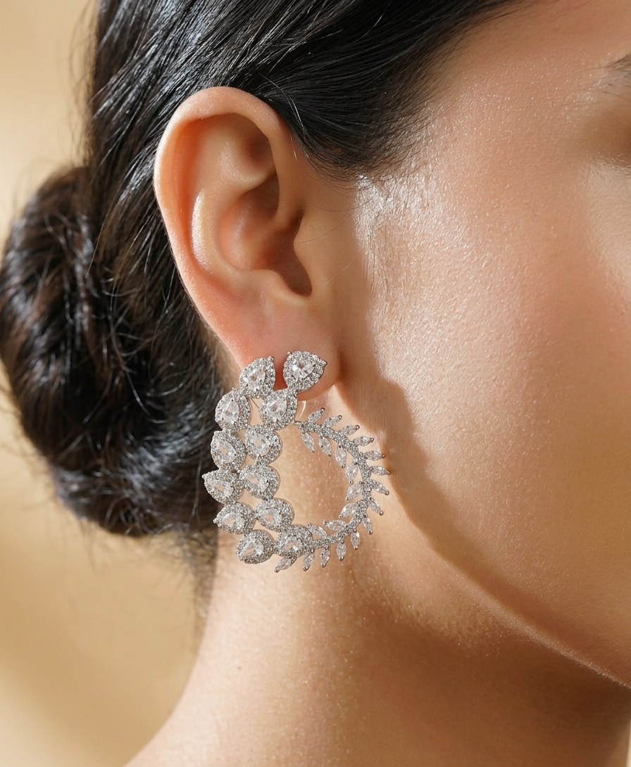 The lower side of the earring is detailed with fine leaf-like branches covered in tiny shimmering stones, adding a natural and artistic touch to the design. The open circular shape gives the earring a modern style, while the intricate diamond arrangement keeps it timeless and feminine. Its silver-tone finish enhances the brilliance of every stone and gives the piece a luxurious appearance.
