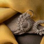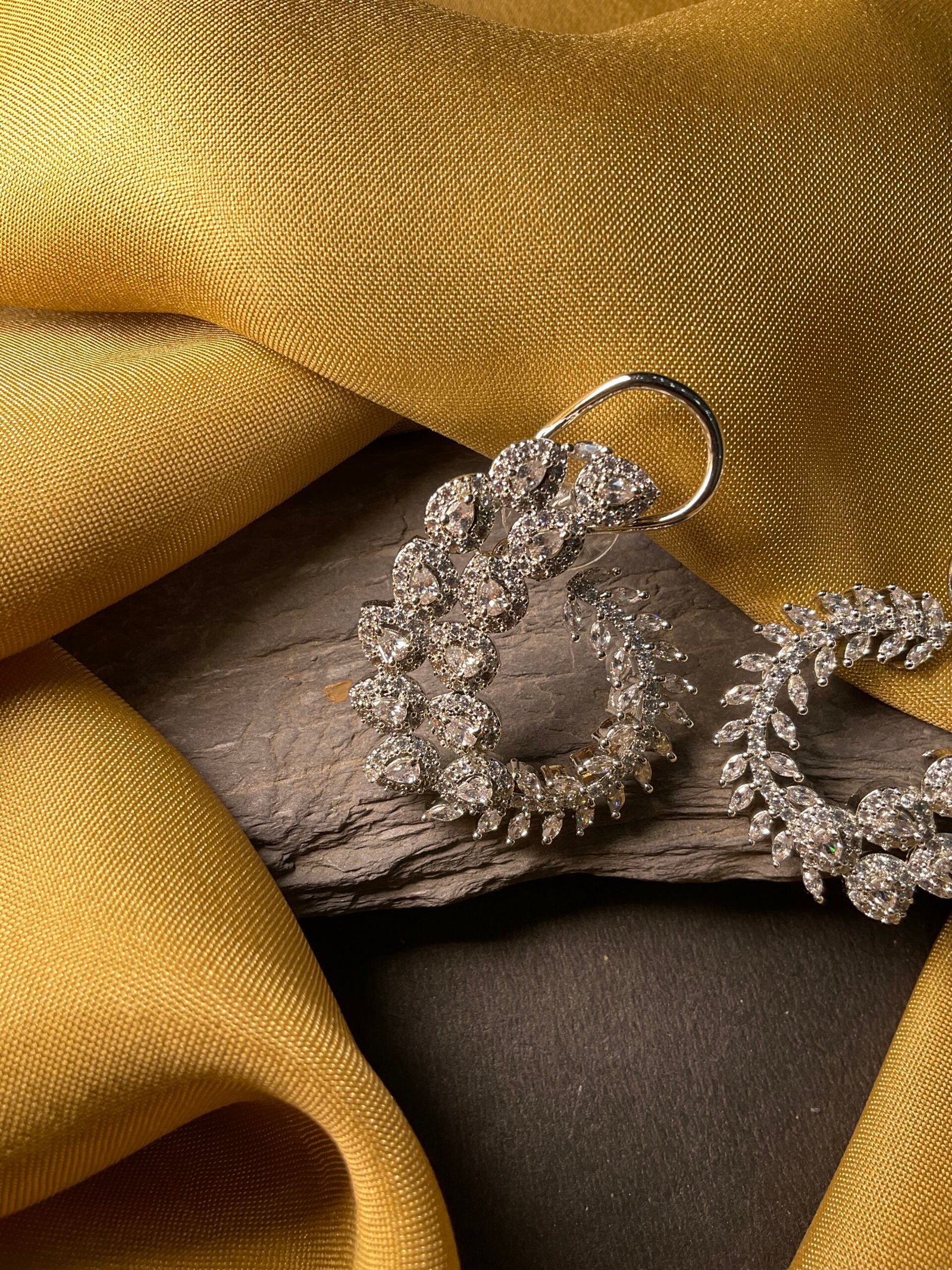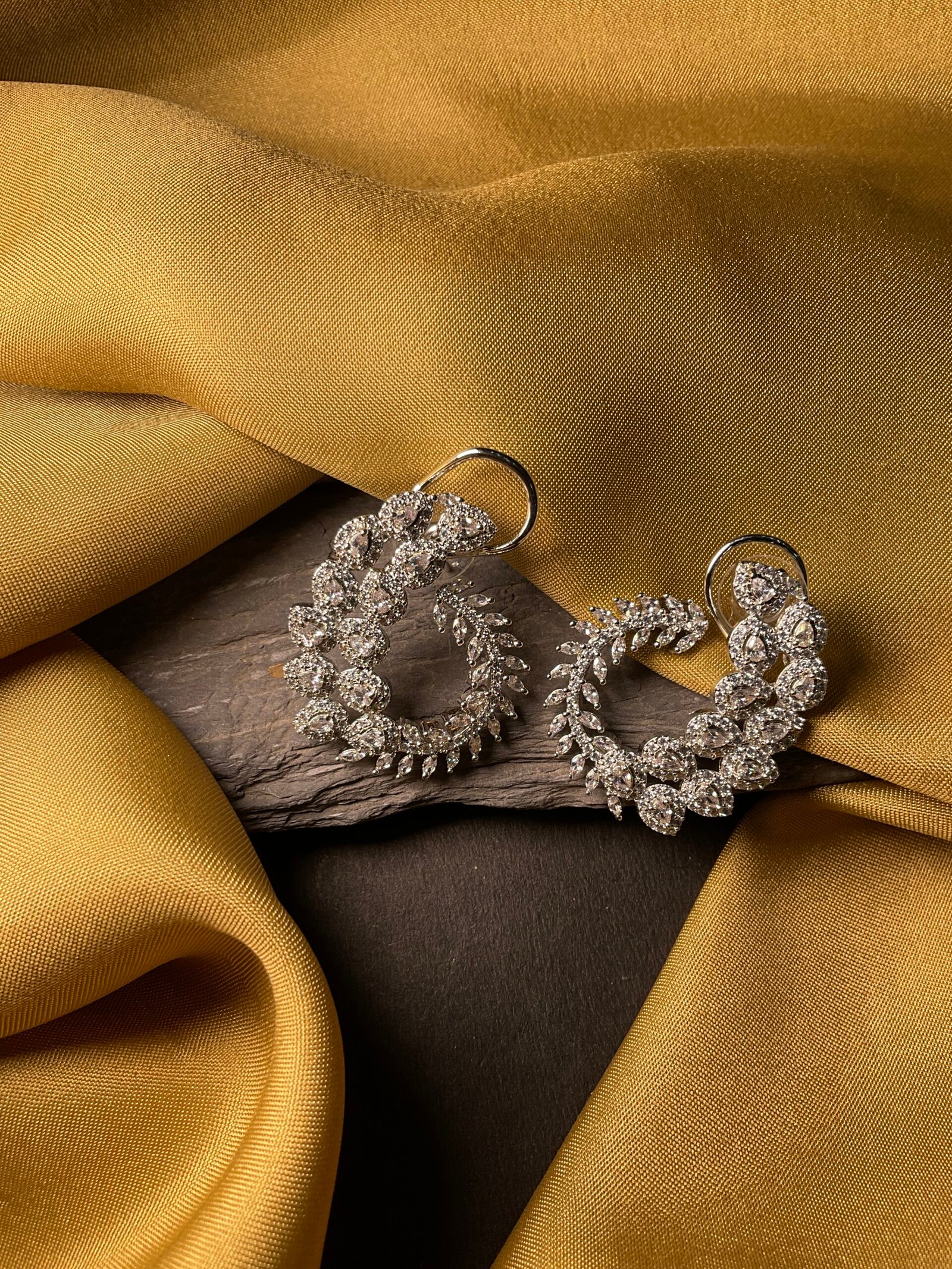 This graceful American diamond earring features a unique half-hoop design inspired by delicate vines and blooming leaves. The curved shape is beautifully decorated with pear-shaped and round American diamonds that create a soft floral pattern along the outer edge. Each stone is carefully placed to give the earring a rich sparkle, making it look elegant and eye-catching from every angle.