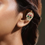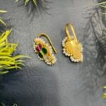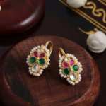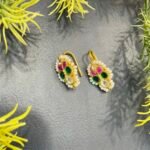 These beautiful Bugdi earrings are designed with a traditional and royal touch, perfect for adding elegance to any ethnic look. The base has a rich gold-tone finish that gives a classic and timeless feel. In the center, the design forms a floral pattern made with colorful stones. You can see deep green stones, bright pink stones, and a clear white stone placed neatly to create a balanced and eye-catching look.