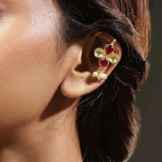 These beautiful Bugdi earrings are designed with a traditional and royal touch, perfect for adding elegance to any ethnic look. The base has a rich gold-tone finish that gives a classic and timeless feel. In the center, the design forms a floral pattern made with colorful stones. You can see deep green stones, bright pink stones, and a clear white stone placed neatly to create a balanced and eye-catching look.