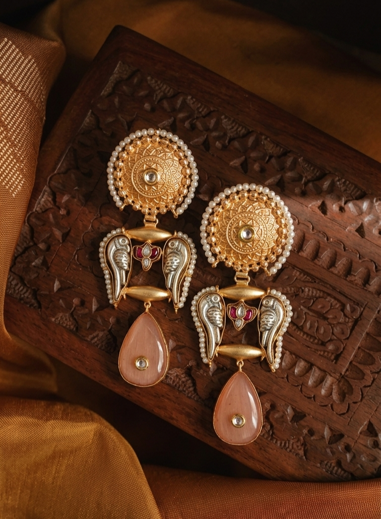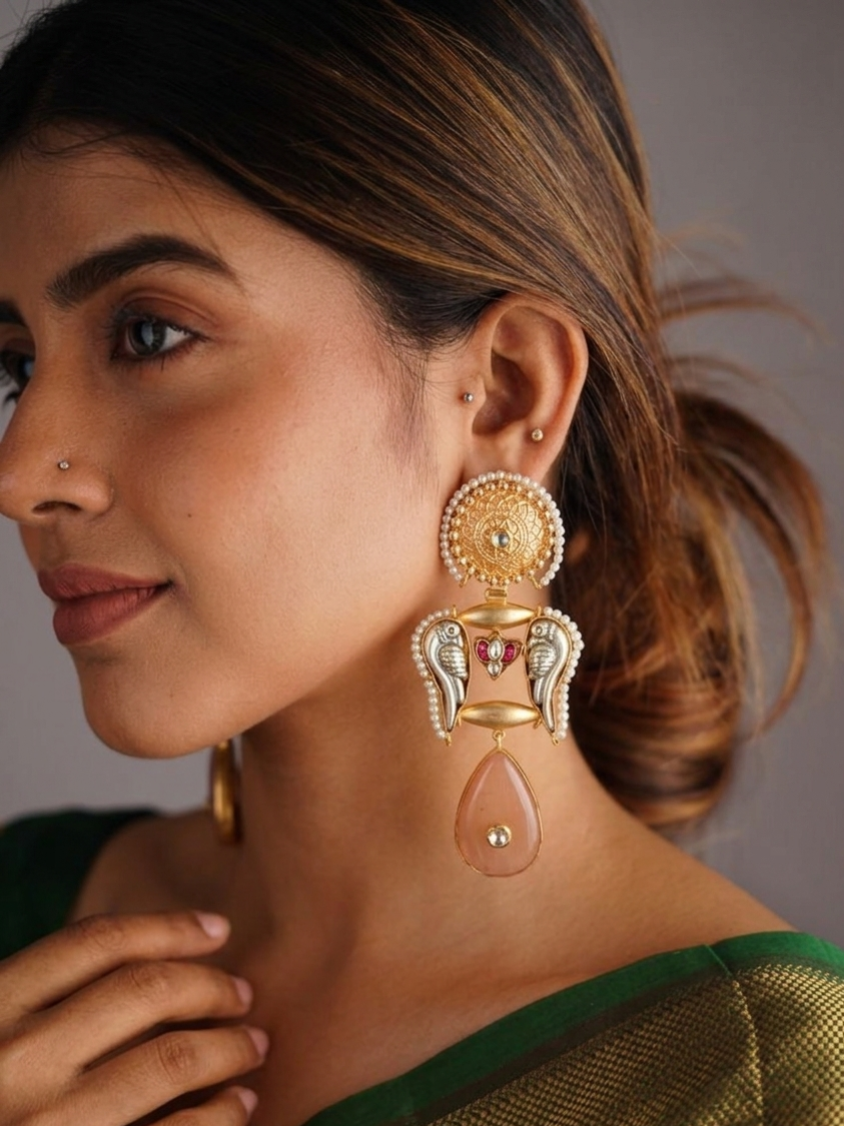 These beautifully crafted earring showcase a rich blend of traditional artistry and elegant detailing. Designed in a warm gold tone, they feature a striking combination of engraved textures, pearl borders, and soft peach stone drop. The intricate parrot-inspired elements add a regal touch, while the 4.5-inch length gives them a graceful, elongated silhouette—perfect for festive and ethnic wear.