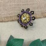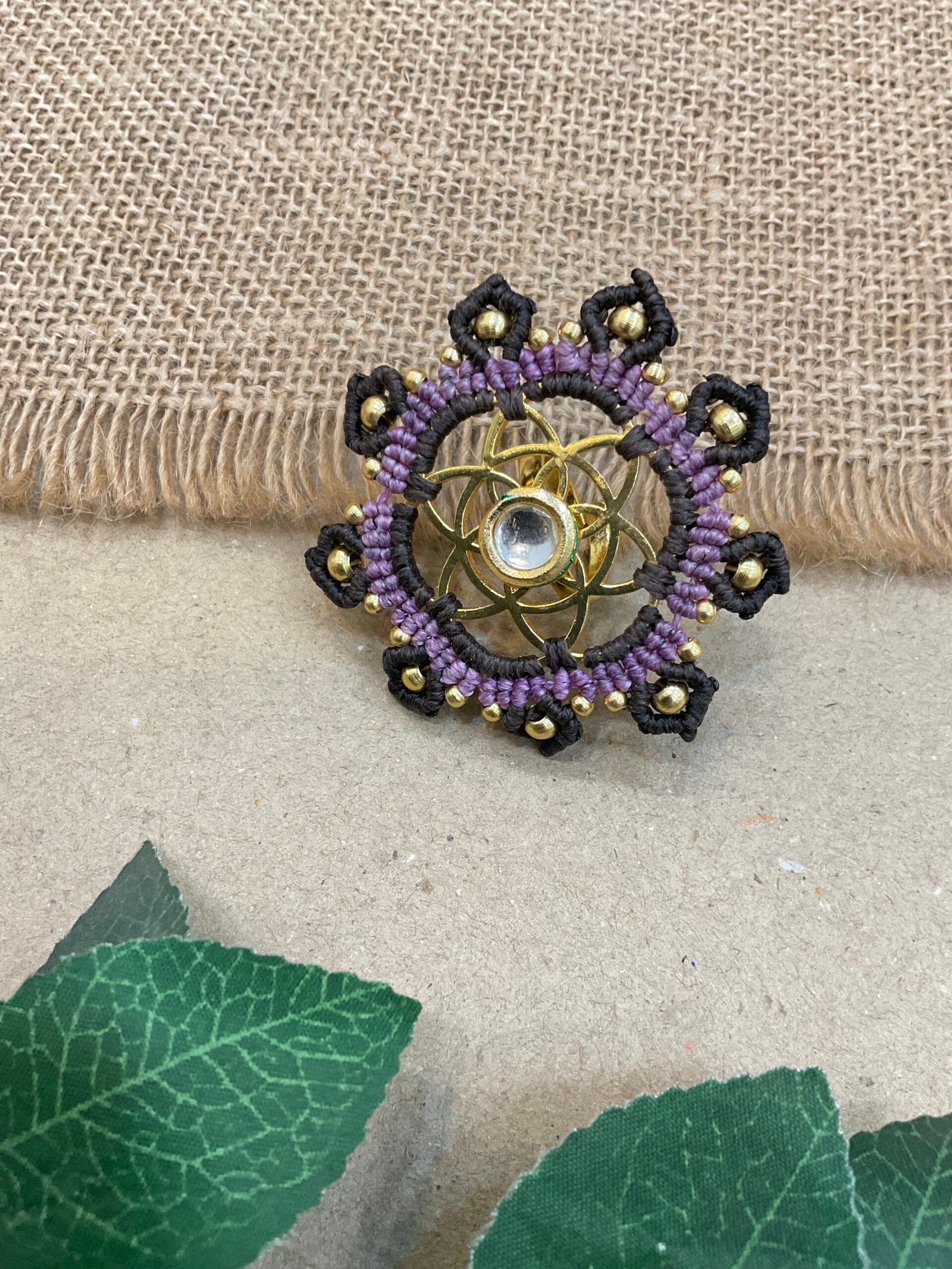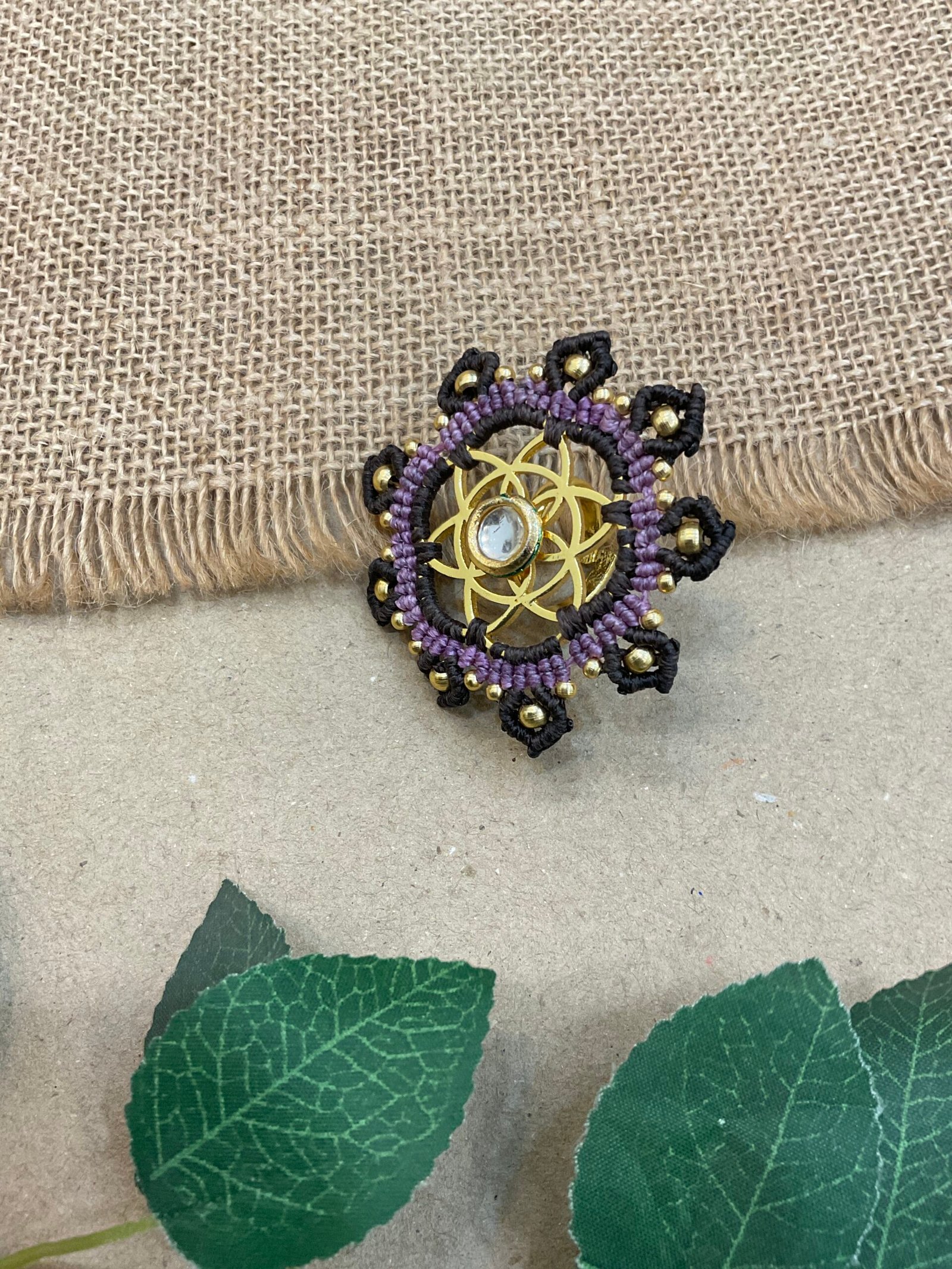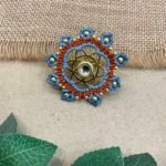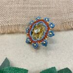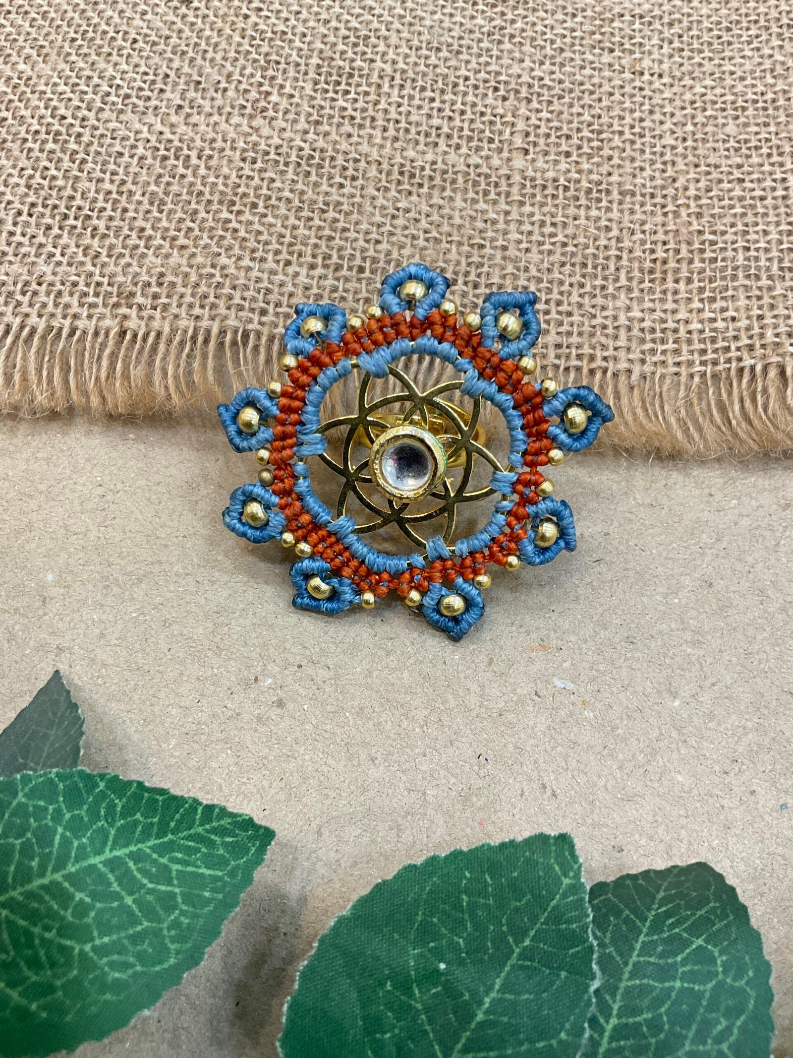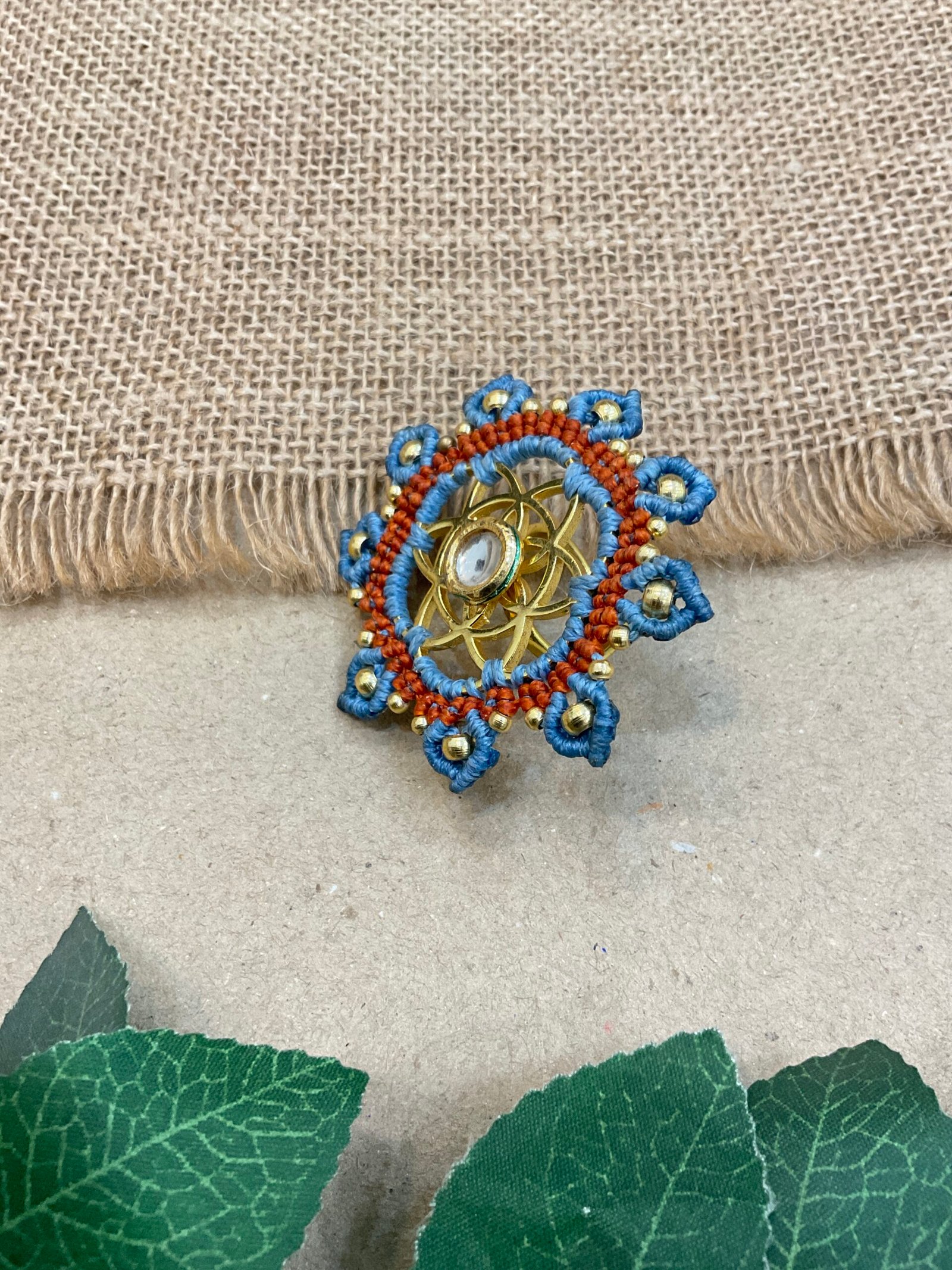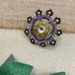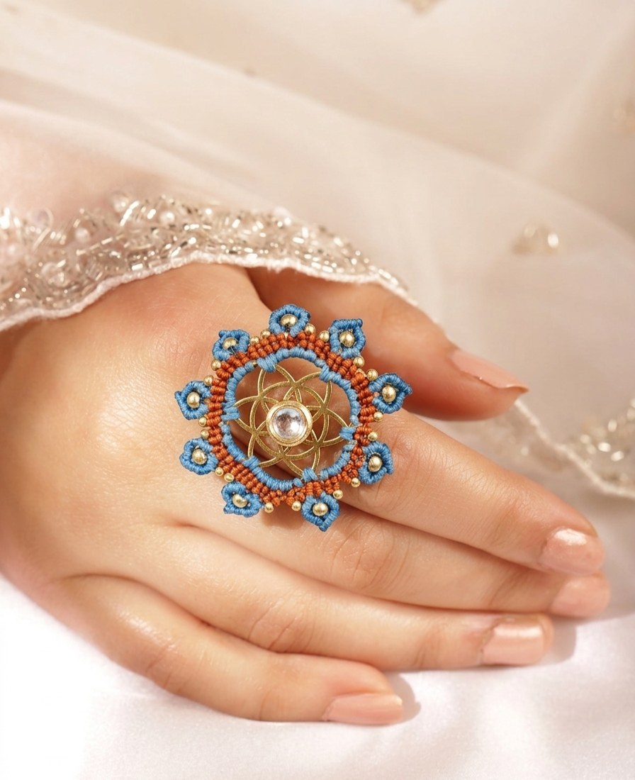 The surrounding design is carefully made with fine thread weaving that adds texture and depth to the ring. Small metallic bead accents are placed along the outer edge, bringing subtle shine and highlighting the detailed handmade craftsmanship. The combination of thread work and metal elements creates a unique balance between traditional artistry and contemporary style.