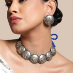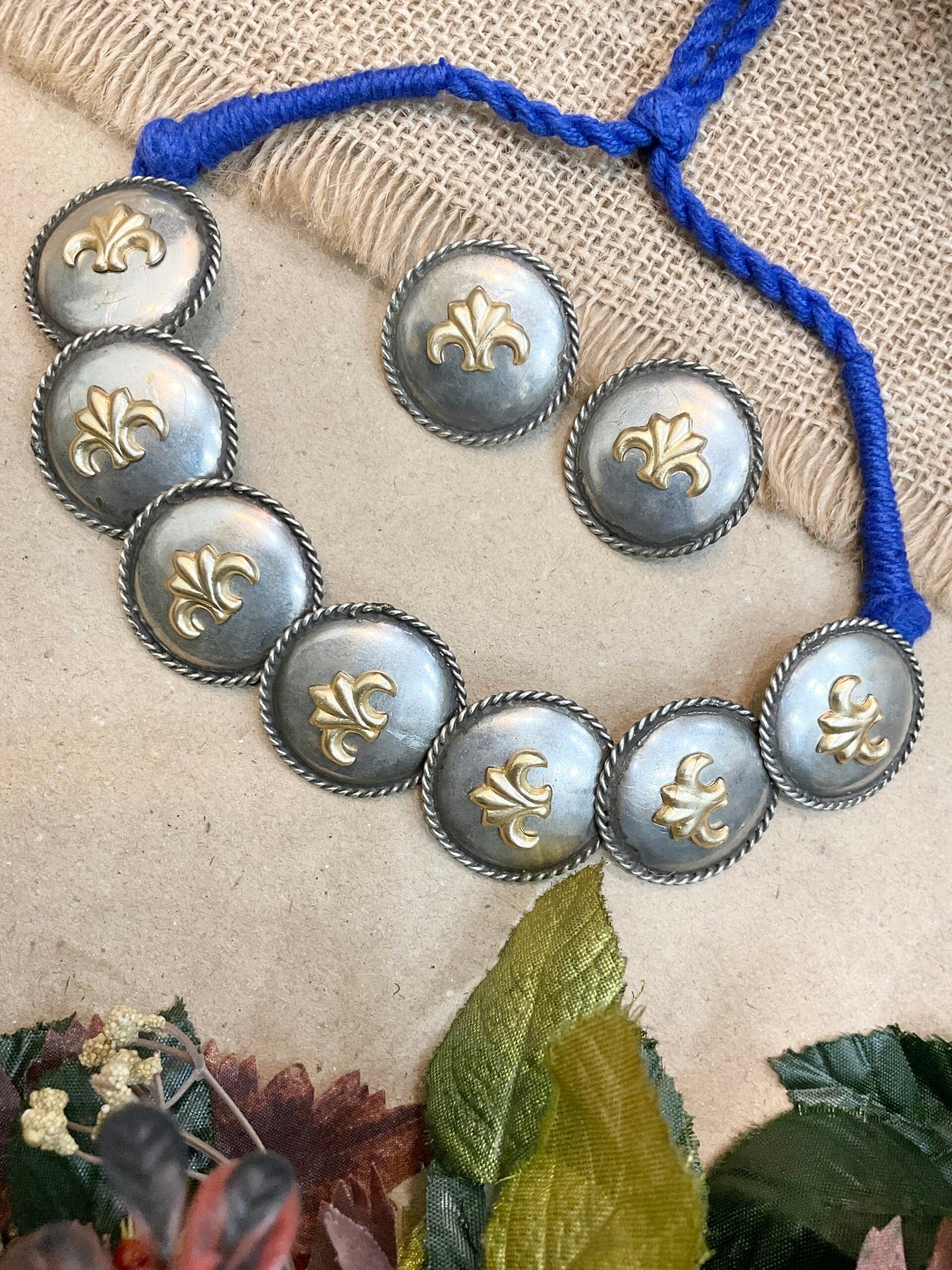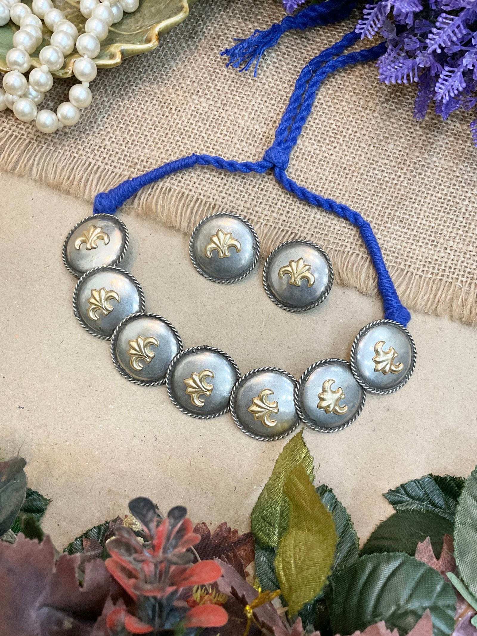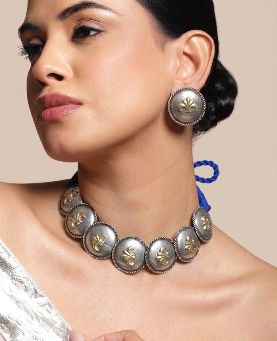 The Regal Coin Charm Necklace Set is a bold and elegant jewelry set designed for those who appreciate traditional style with a modern touch. The necklace features a striking row of round medallion-shaped pieces placed closely together to create a graceful choker design. Each circular piece is decorated with a raised floral-inspired motif in the center, giving the set a rich handcrafted look. The twisted border around every medallion adds texture and detail, making the design more attractive and unique.