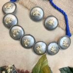 The necklace is finished with a soft thread tie at the back, allowing for an adjustable and comfortable fit around the neck. This design sits beautifully on the neckline and creates a statement look without feeling too heavy. The matching earrings mirror the same round medallion pattern, creating a perfectly coordinated set that enhances the overall beauty of the design.