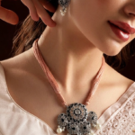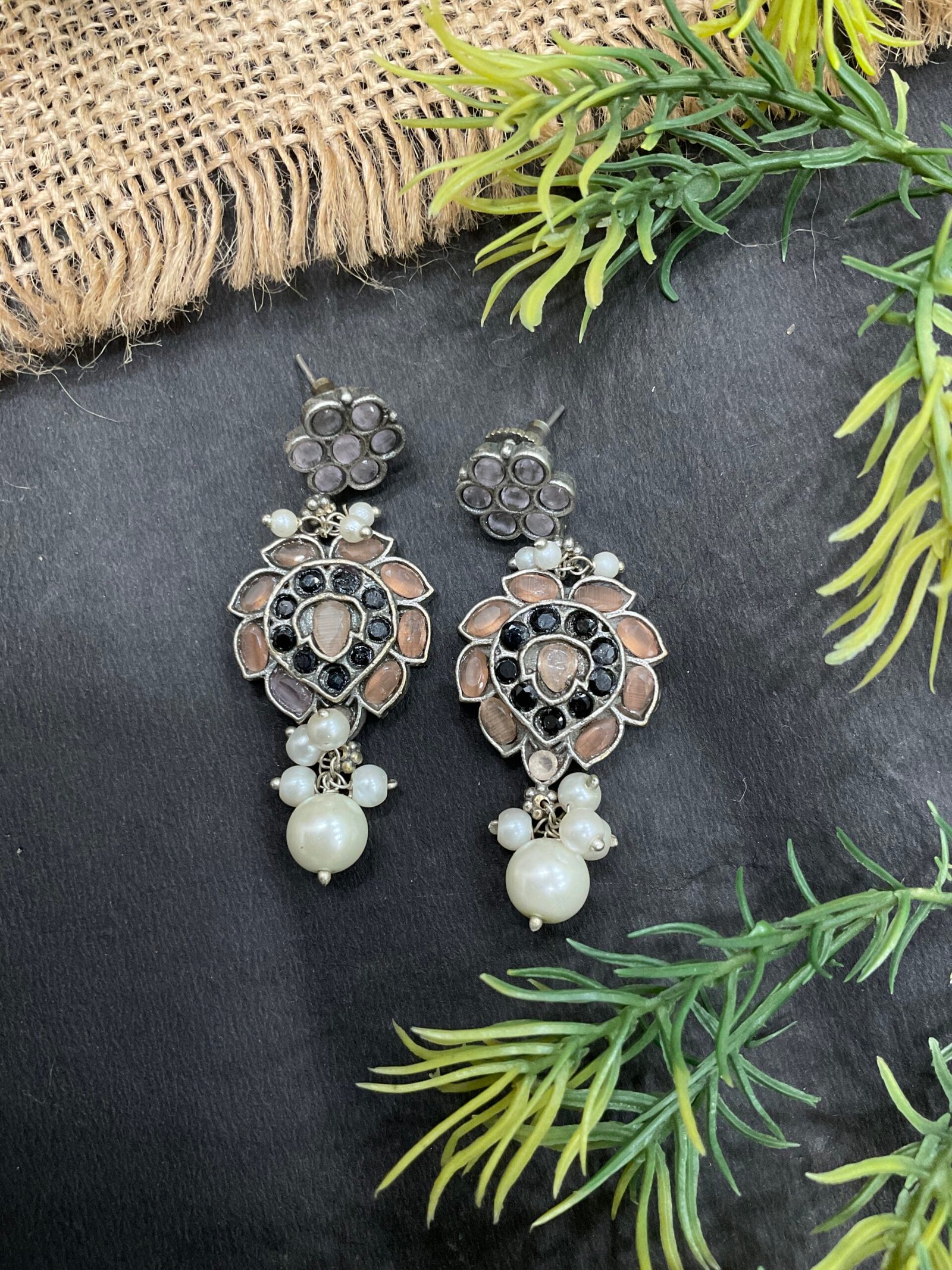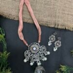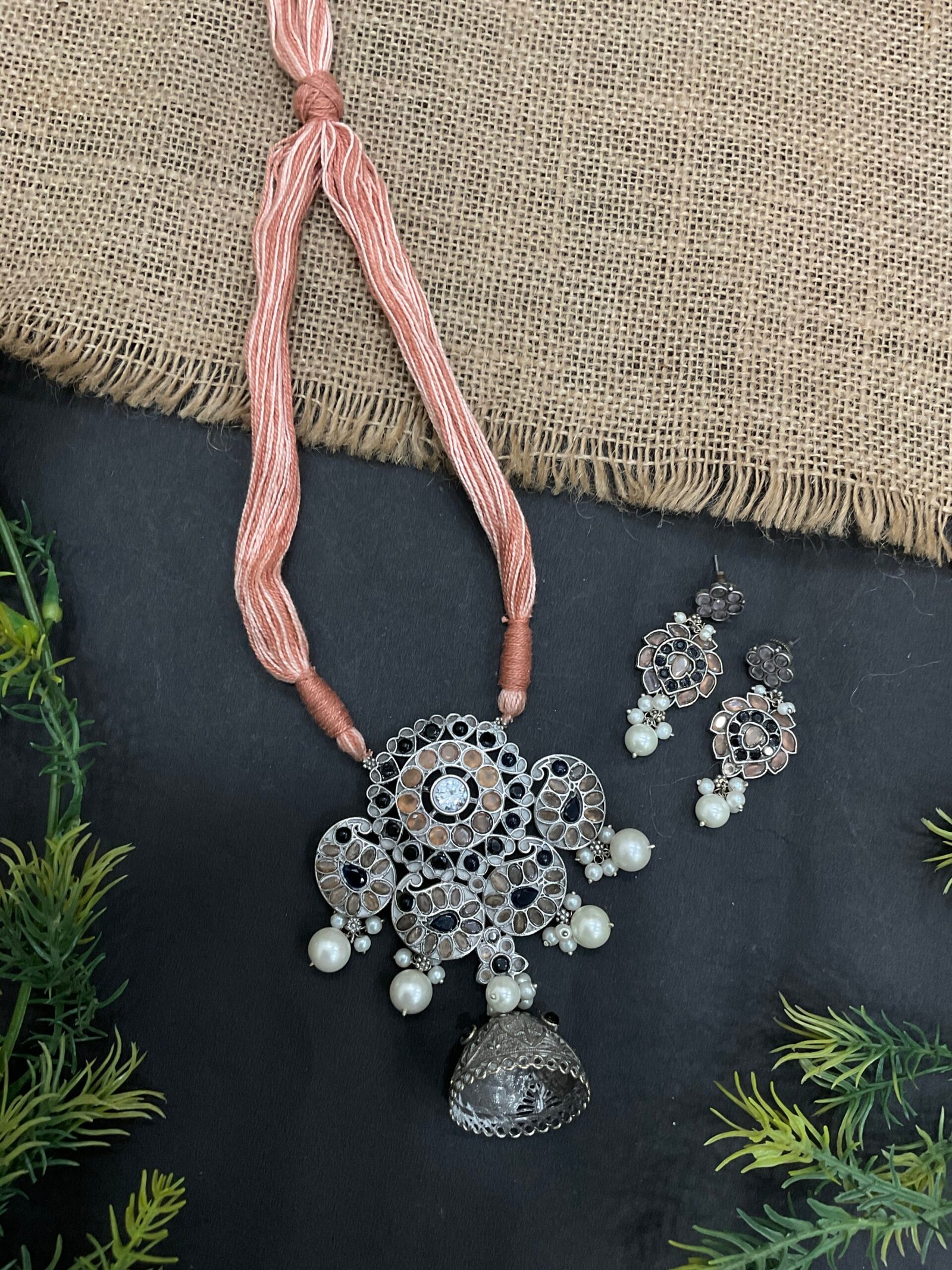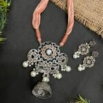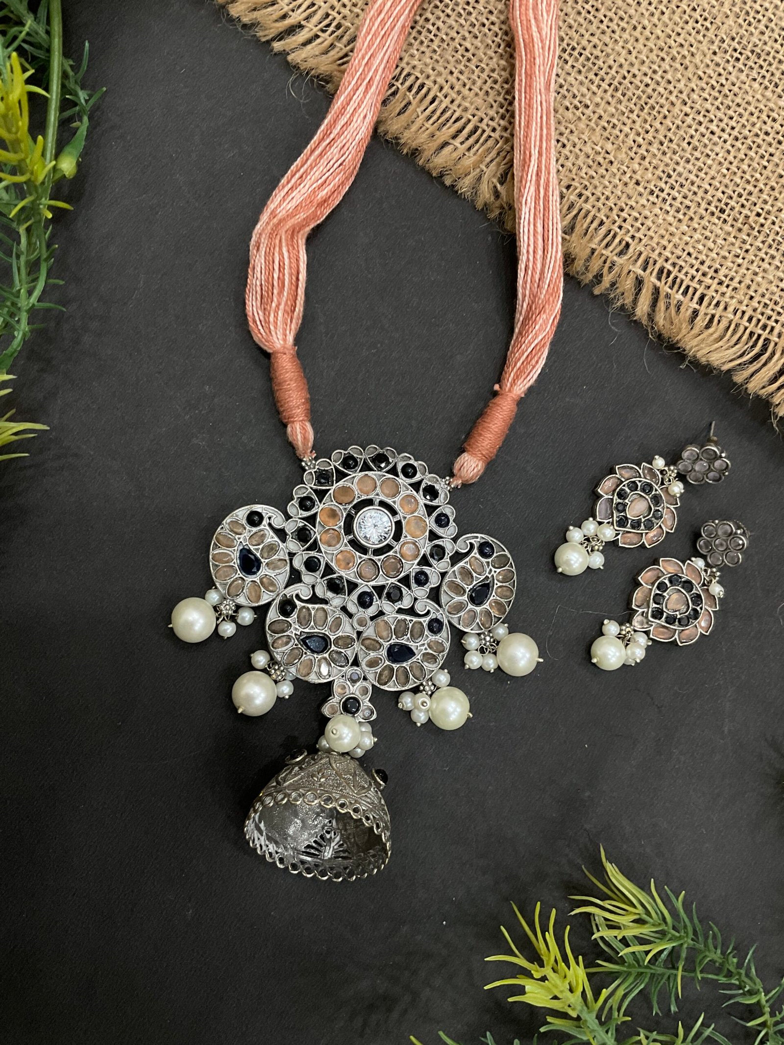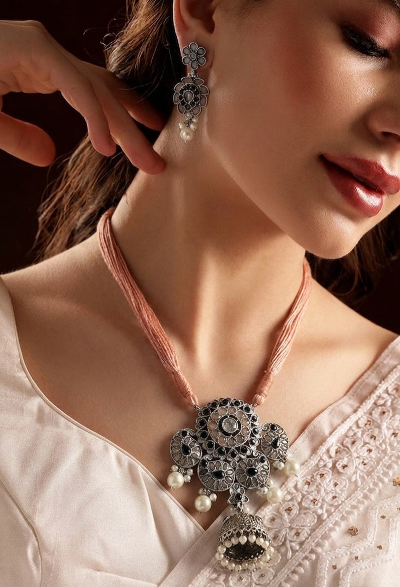 The centerpiece of the necklace is crafted in a circular floral-inspired pattern with delicate stone detailing. The pendant is decorated with soft peach-toned and black stones arranged in layered round motifs, creating a rich and artistic design. Small pearl drops placed around the pendant add a graceful movement and enhance the feminine beauty of the necklace. At the bottom, a silver jhumki-style dangler gives the piece a classic ethnic finish and makes it even more eye-catching.
