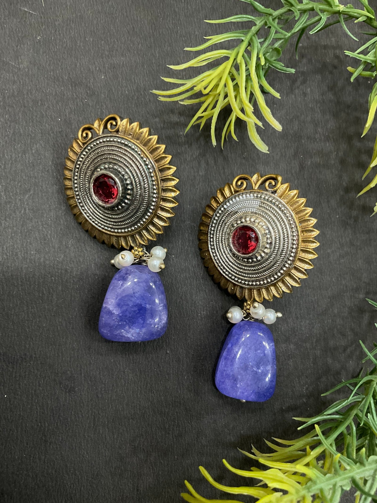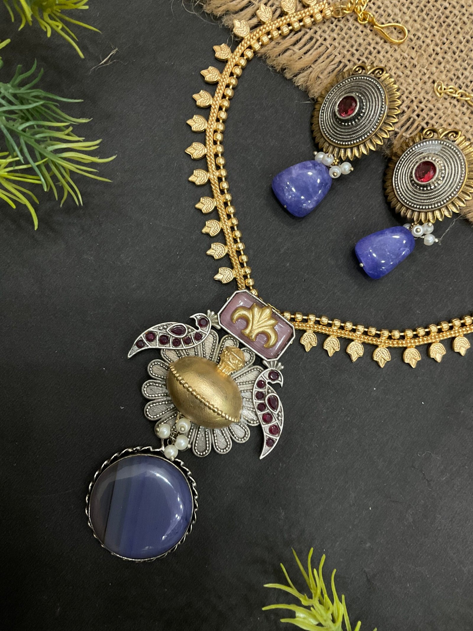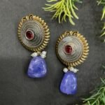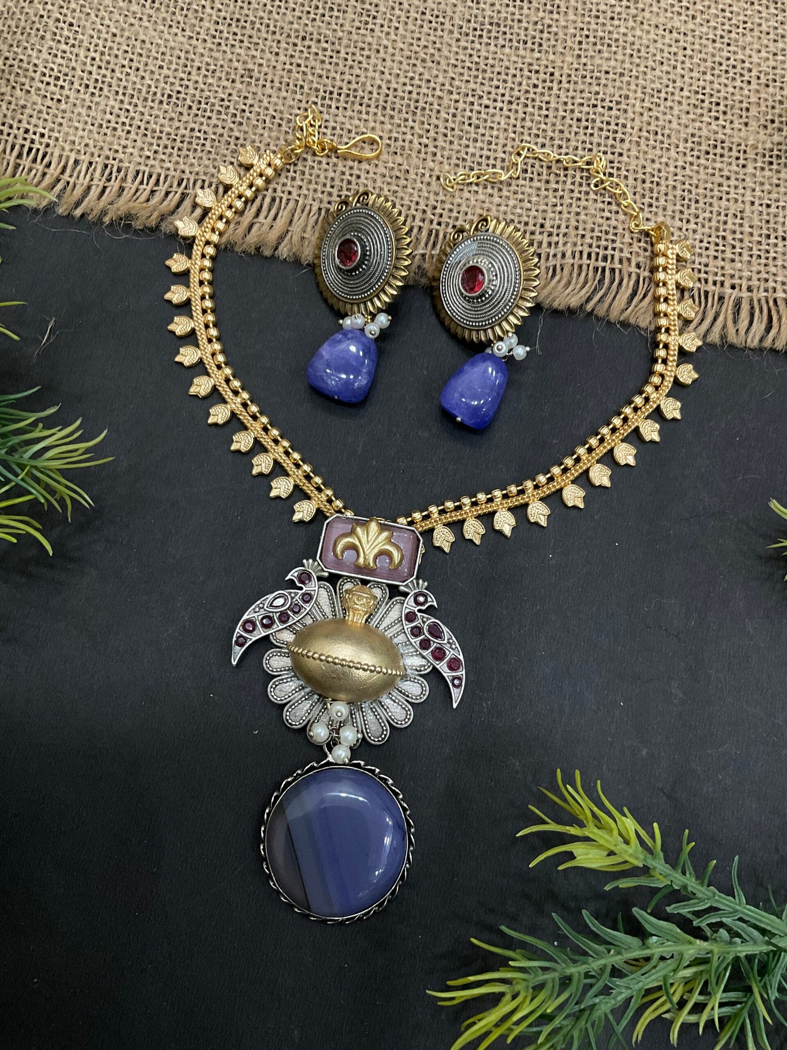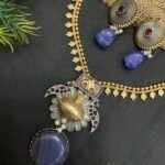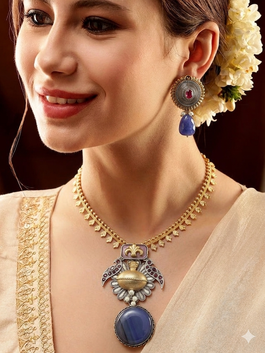 The matching earrings complement the necklace perfectly with antique circular tops, red center stones, and smooth blue stone drops that create a balanced and sophisticated look. The combination of blue, gold, silver, and pearl detailing makes this set ideal for festive wear, wedding functions, family gatherings, and special occasions.