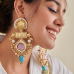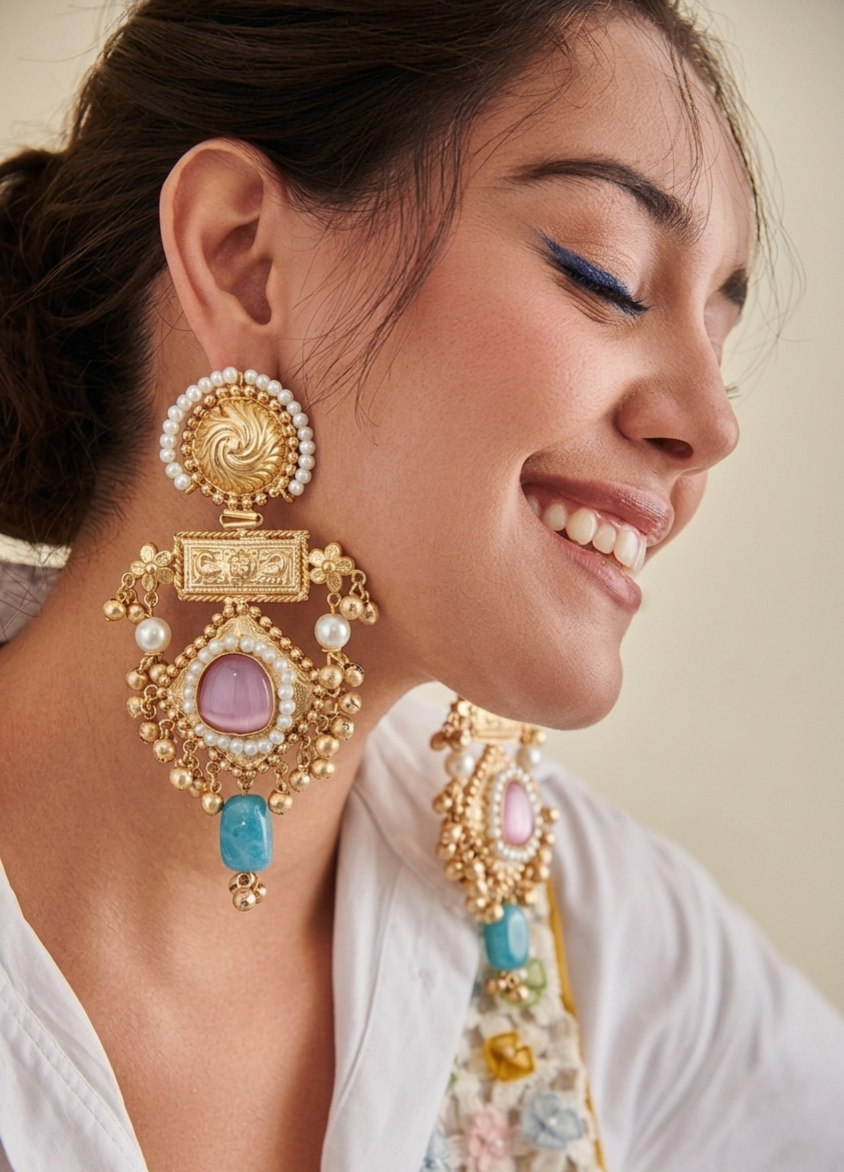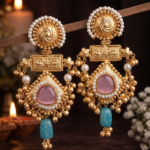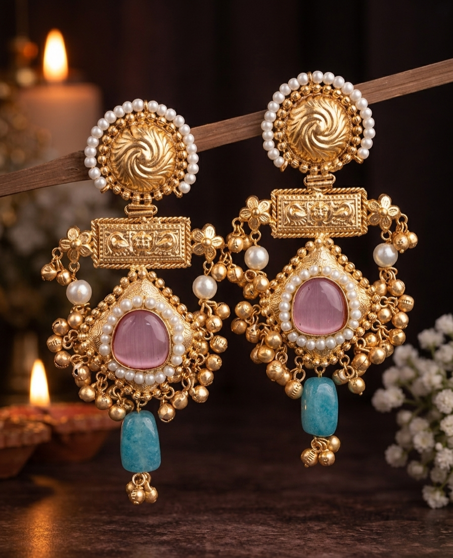 These elegant statement earrings feature a rich gold-tone finish with intricate handcrafted detailing. The design blends traditional charm with a regal touch, highlighted by soft pink center stones, delicate pearl accents, and a soothing turquoise drop at the bottom. With a graceful length of 4.5 inches, they create a bold yet refined look, perfect for festive and occasion wear.