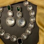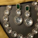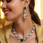 The necklace is designed in a symmetrical pattern, meaning both sides look the same, which makes it look neat and balanced. The matching earrings follow the same design style — they also have green stones on top and a large oval drop at the bottom, making them perfectly complement the necklace.