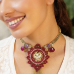 This hasli beautifully combines gold, ruby red, soft pink, purple, and white tones, making it perfect for festive occasions, weddings, or traditional outfits. It is a statement piece that adds a bold yet graceful touch to any look.