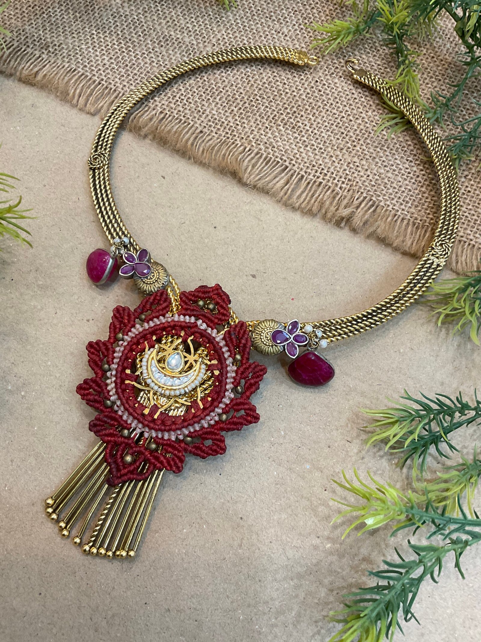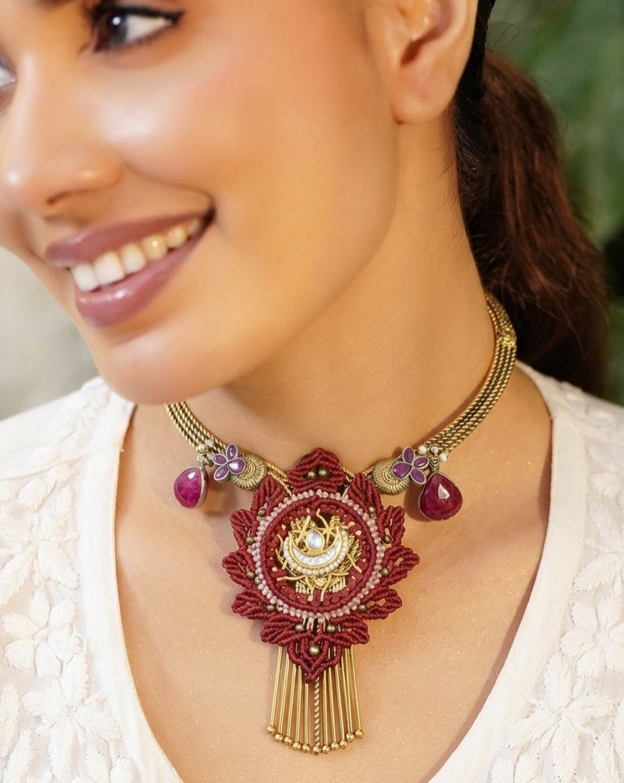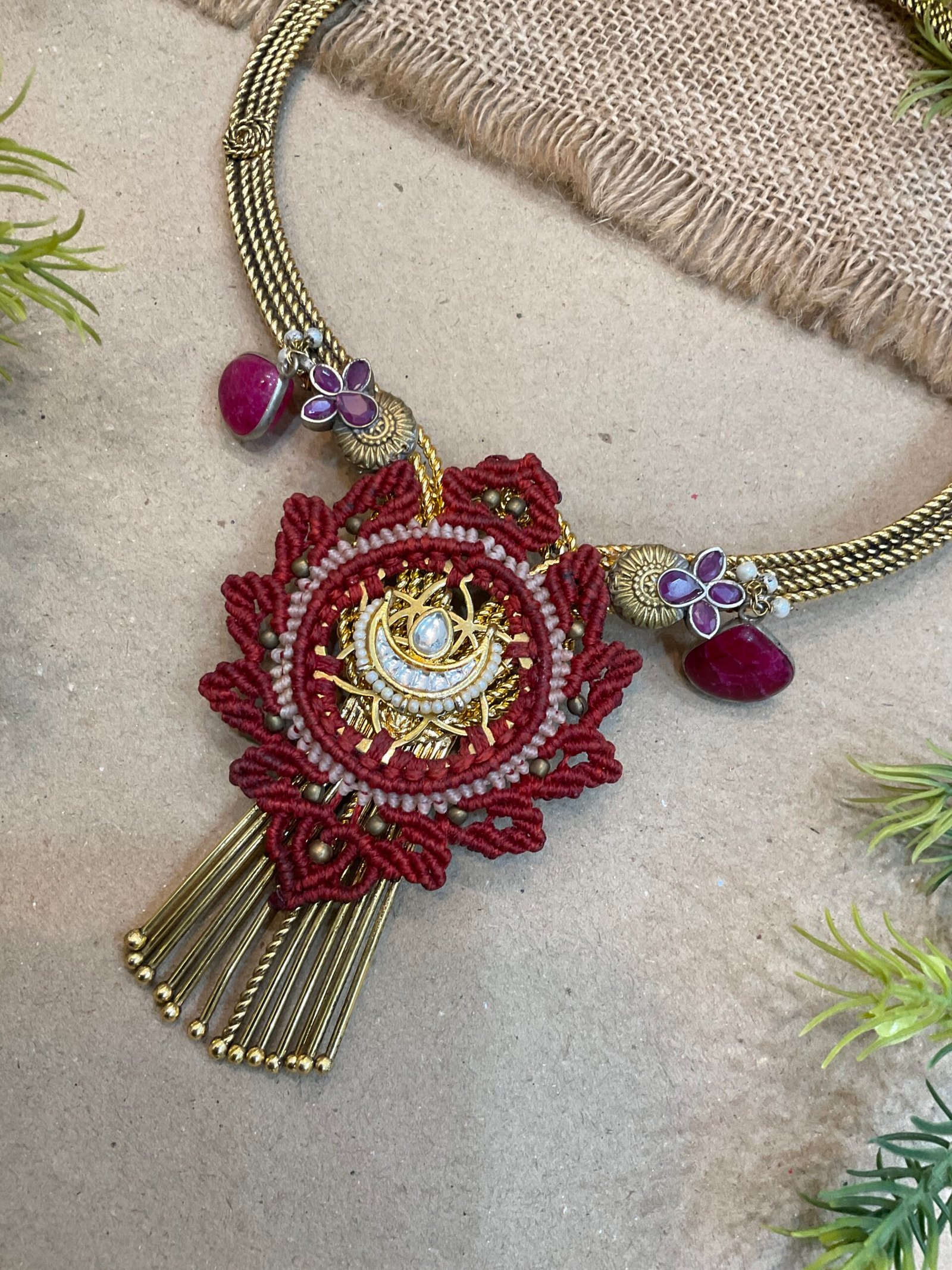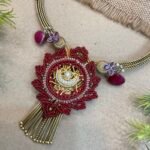 The main highlight of this piece is the large floral pendant in a deep ruby red colour, created with detailed threadwork. The flower design looks bold and eye-catching, with layers that give it a full and textured appearance. Around the center, tiny beadwork in soft pink and gold colour adds a delicate touch and enhances the beauty of the pendant.