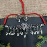 This silver look alike choker set is a striking blend of traditional artistry and graceful detailing. The choker features a beautifully braided silver-tone base that gives the piece a rich handcrafted appearance. The bright red thread tie at the back creates a bold contrast against the antique silver finish, adding a vibrant touch that makes the design stand out beautifully.