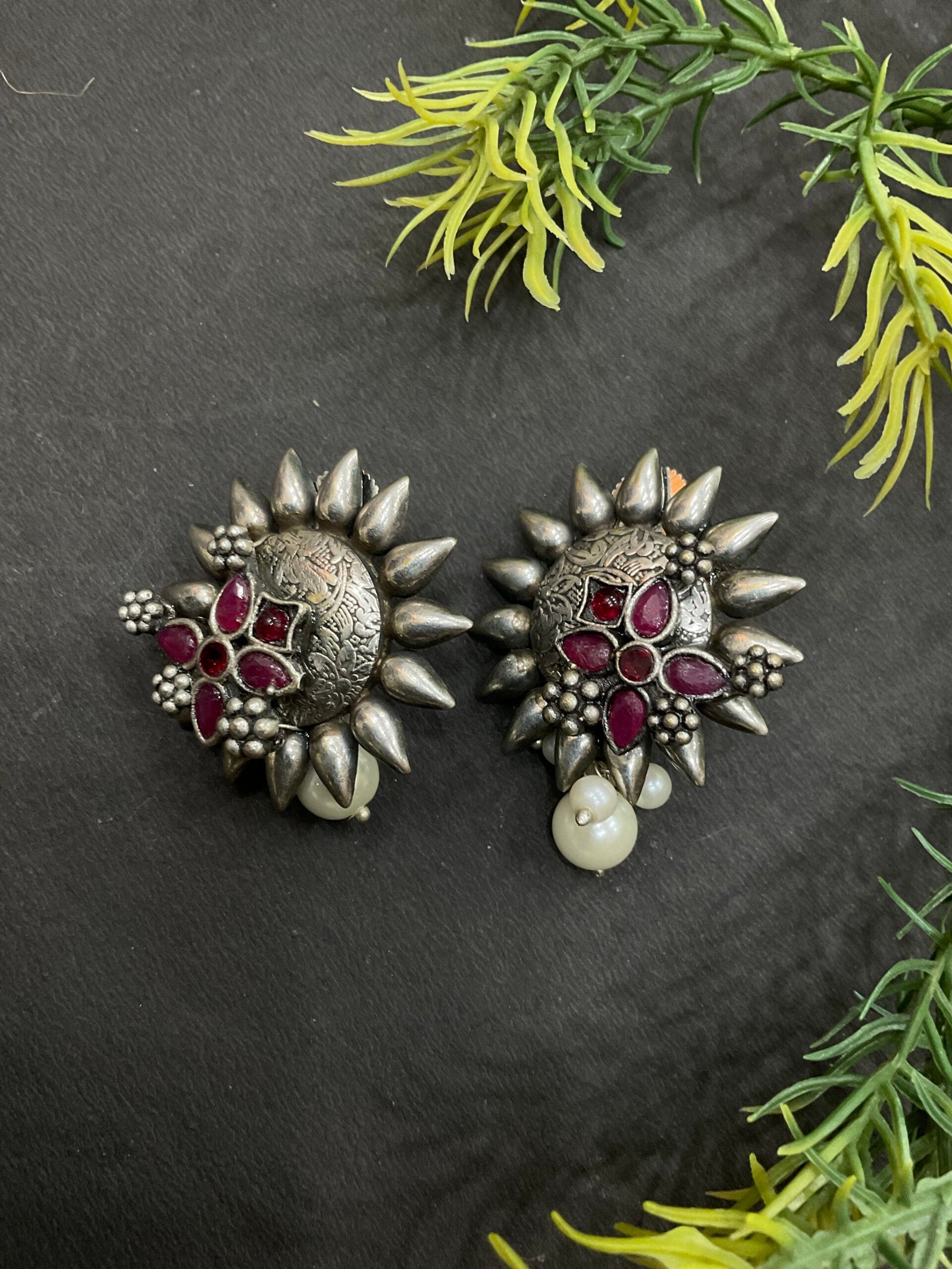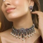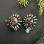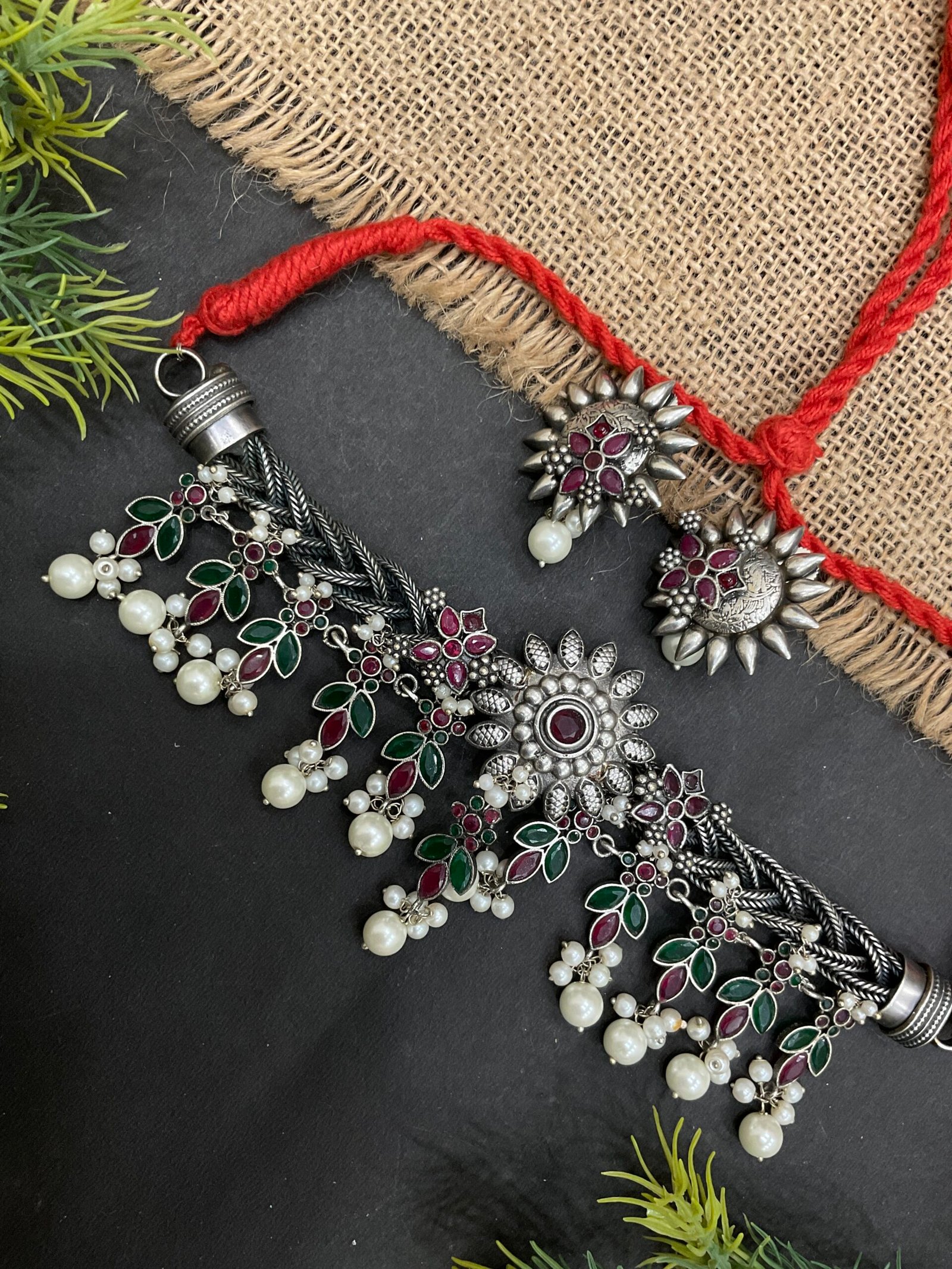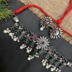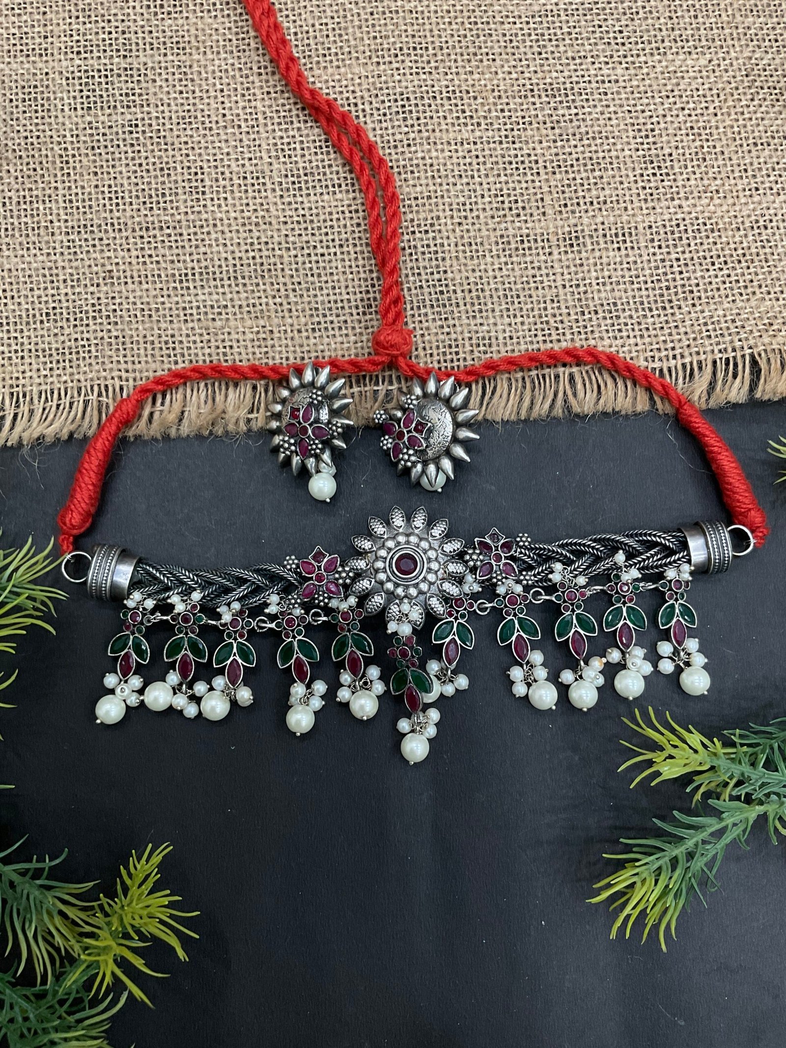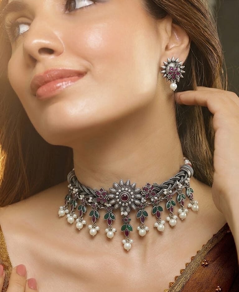 The lower part of the choker is decorated with soft pearl drops that add gentle movement and a feminine finish. These pearl clusters bring softness to the bold silver design, making the necklace look both festive and elegant. The matching earrings mirror the floral style of the necklace with ruby-toned stones, antique silver detailing, and a single pearl drop that completes the coordinated look.