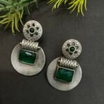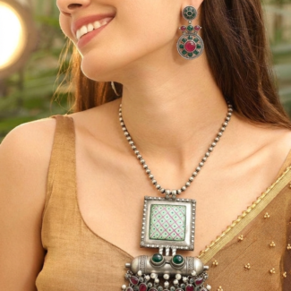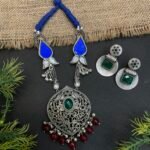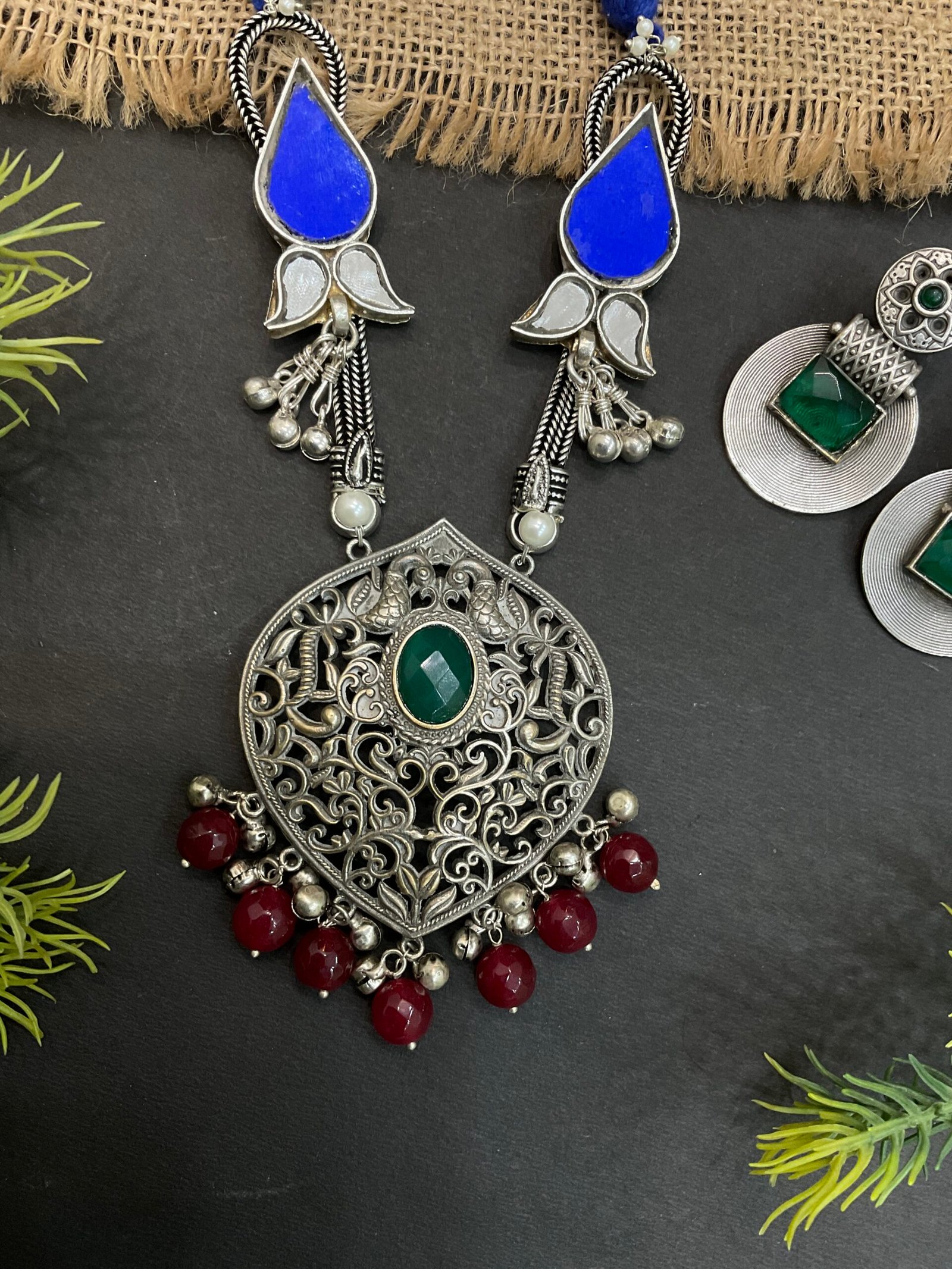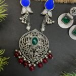 The centerpiece of the necklace is a large round pendant with intricate openwork detailing that creates a rich vintage look. Delicate floral and vine-inspired patterns are carved throughout the silver-style surface, making the pendant appear elegant and detailed. At the center, a deep green oval stone adds a beautiful contrast against the silver base and blue upper stones. The lower part of the pendant is finished with rich maroon bead drops and tiny silver charms that bring color, movement, and a statement finish to the design. The combination of blue, green, maroon, and silver tones makes this necklace truly eye-catching.