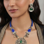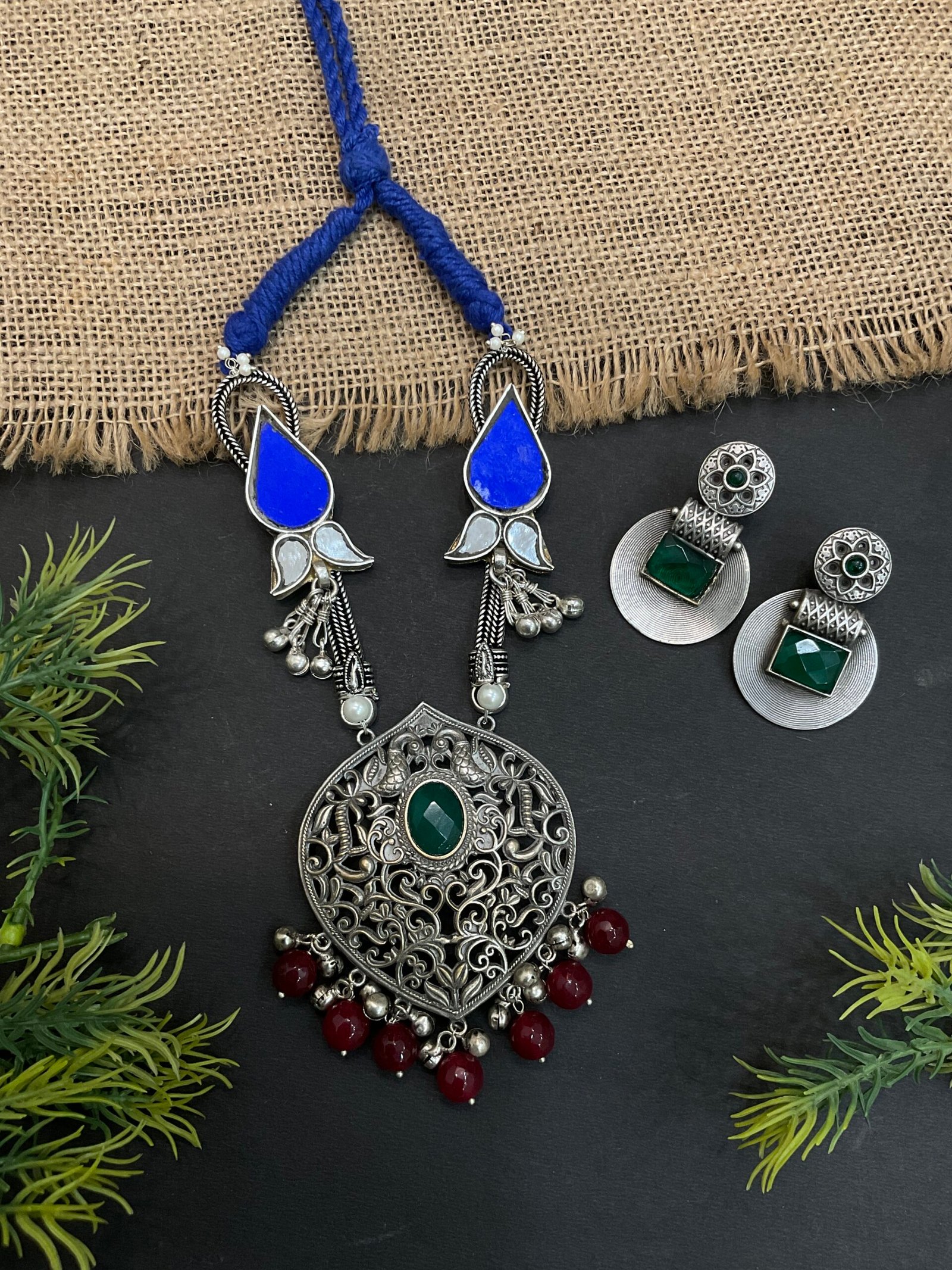 This silver lookalike necklace set is a striking piece that beautifully combines bold color with traditional craftsmanship. The necklace features a unique adjustable blue thread design that adds a vibrant touch while making it comfortable to wear. The upper part of the necklace is decorated with deep sapphire blue stone accents placed in a graceful teardrop shape, giving the design a fresh and artistic appearance. Small silver bead tassels and pearl-style details hanging below add gentle movement and enhance the handcrafted charm of the set.