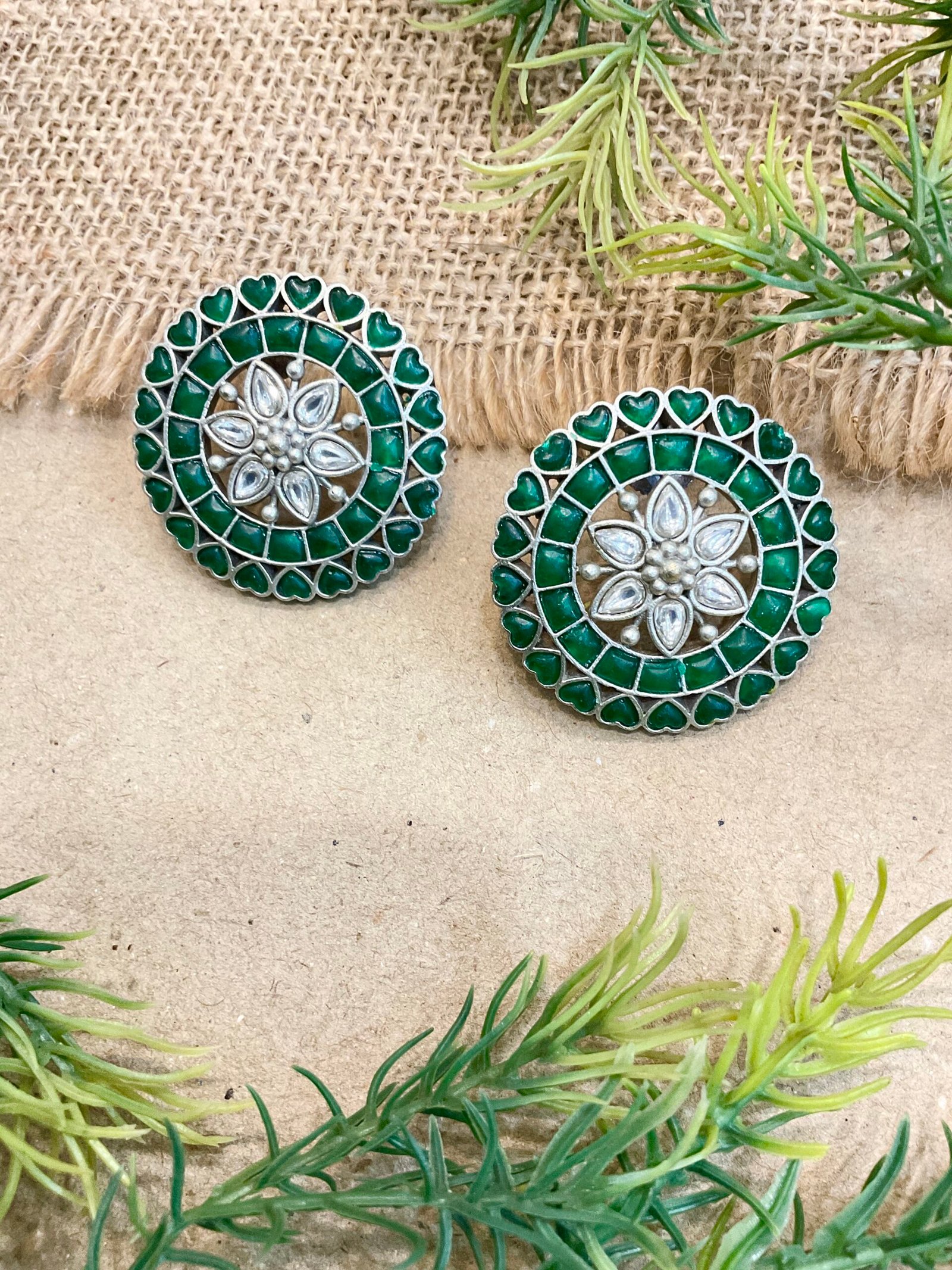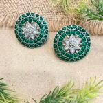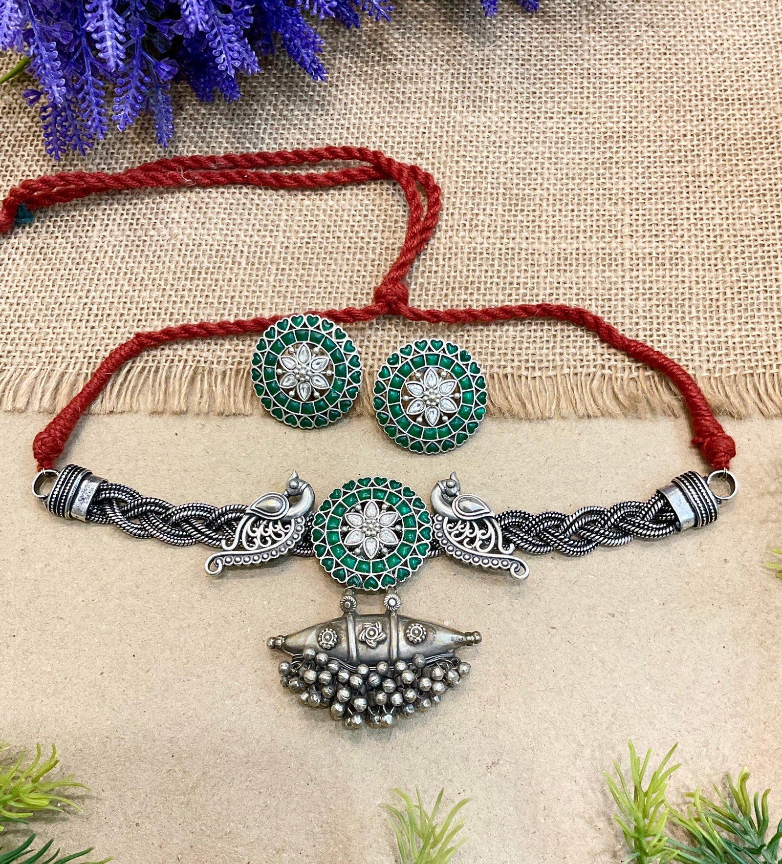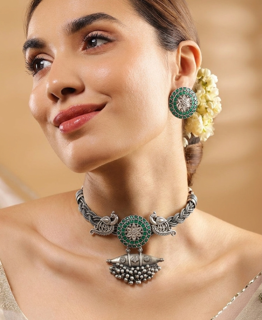 This beautiful choker set has a rich traditional look with a modern touch. The choker is designed in a silver tone with a braided-style band that sits neatly around the neck, giving it a bold yet elegant feel. In the center, there is a round green stone motif, carefully arranged in a circular pattern, with a delicate floral design in the middle that adds charm and detail.