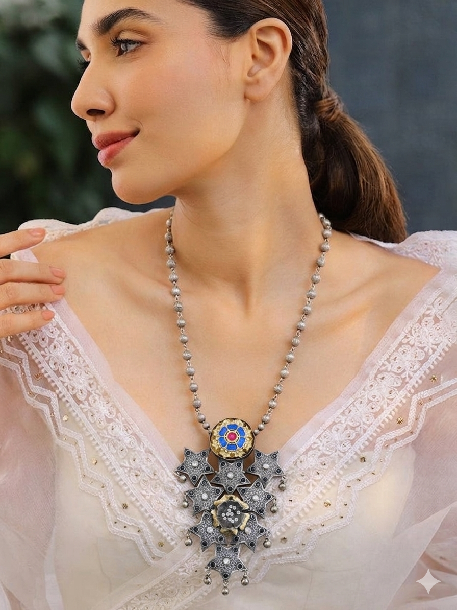 This silver look alike necklace is a striking piece that beautifully combines traditional artistry with a modern statement style. The necklace comes with a delicate silver-toned beaded chain that gives it a lightweight and graceful look. Its simple chain design allows the bold pendant to stand out while keeping the overall style elegant and easy to wear.