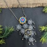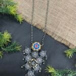 Small hanging silver beads attached to the lower edges of the pendant create gentle movement, making the necklace look graceful when worn. The mix of silver tones with blue and pink accents gives this piece a unique charm that can easily enhance both ethnic and fusion outfits. This necklace pairs beautifully with sarees, kurtis, and Indo-western dresses, making it a perfect choice for festive occasions, family gatherings, or special events. Its bold design makes it ideal for women who love distinctive silver-inspired jewelry with a creative traditional touch.