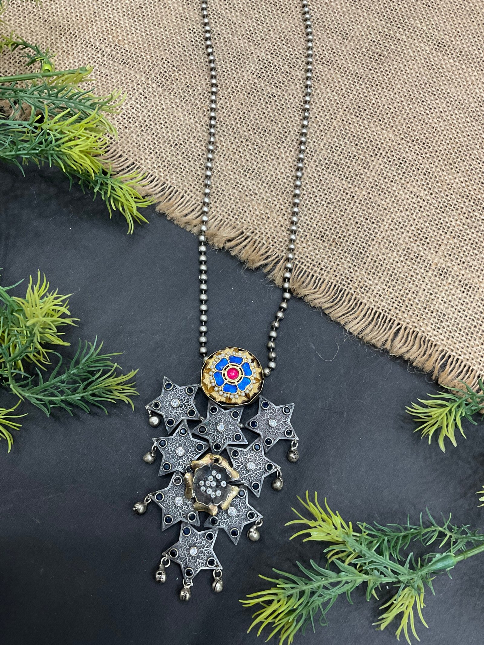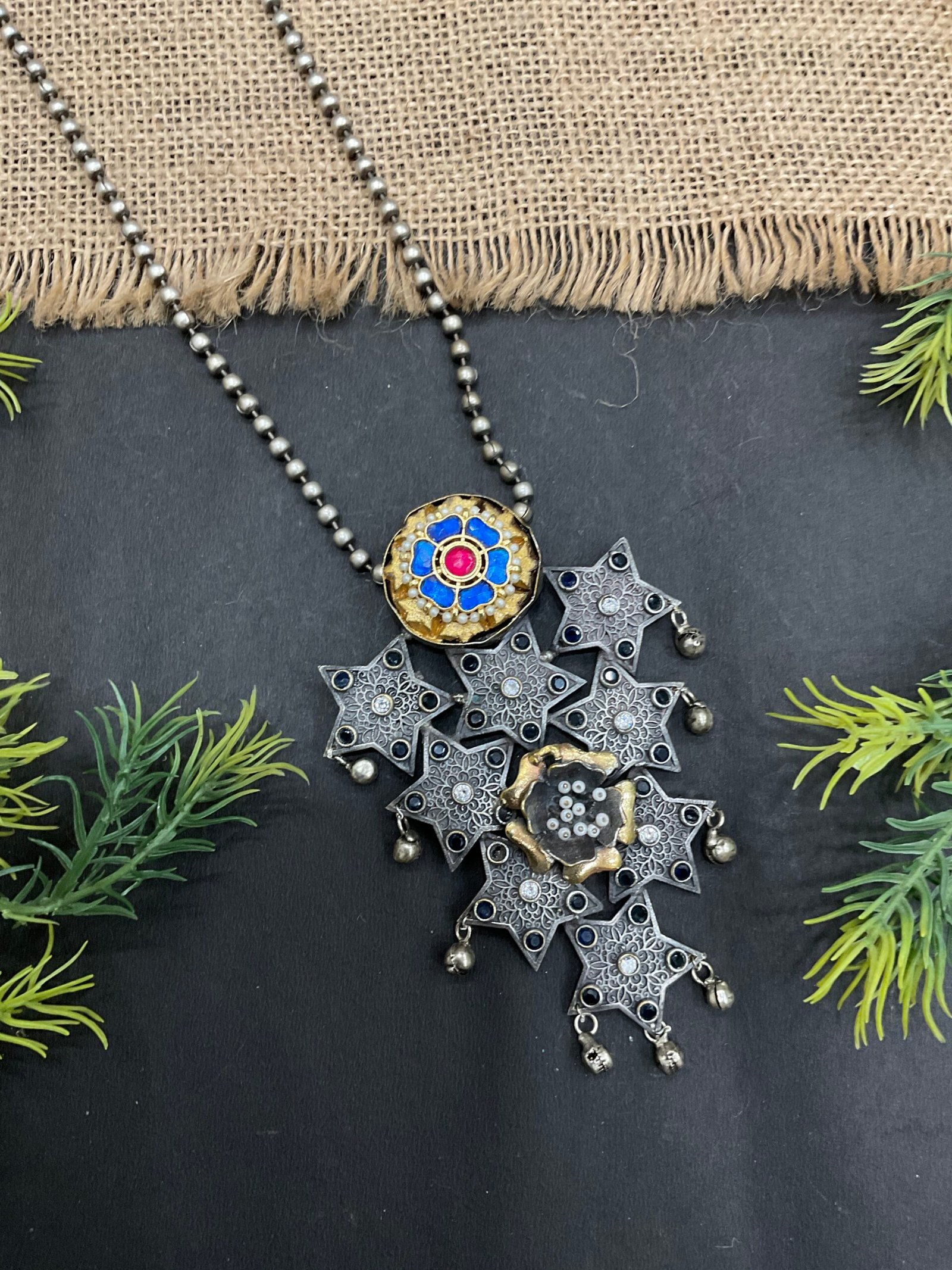 The pendant features a unique layered design with multiple star-shaped motifs arranged in a flowing pattern. Each silver-toned star is decorated with fine engraved detailing and tiny dark blue stone accents that add richness to the design. At the top of the pendant, a round floral element with blue petals and a bright pink center creates a beautiful contrast, adding a vibrant touch to the antique silver finish. In the center, a flower-inspired detail brings the entire design together and gives the necklace an artistic handcrafted appearance.