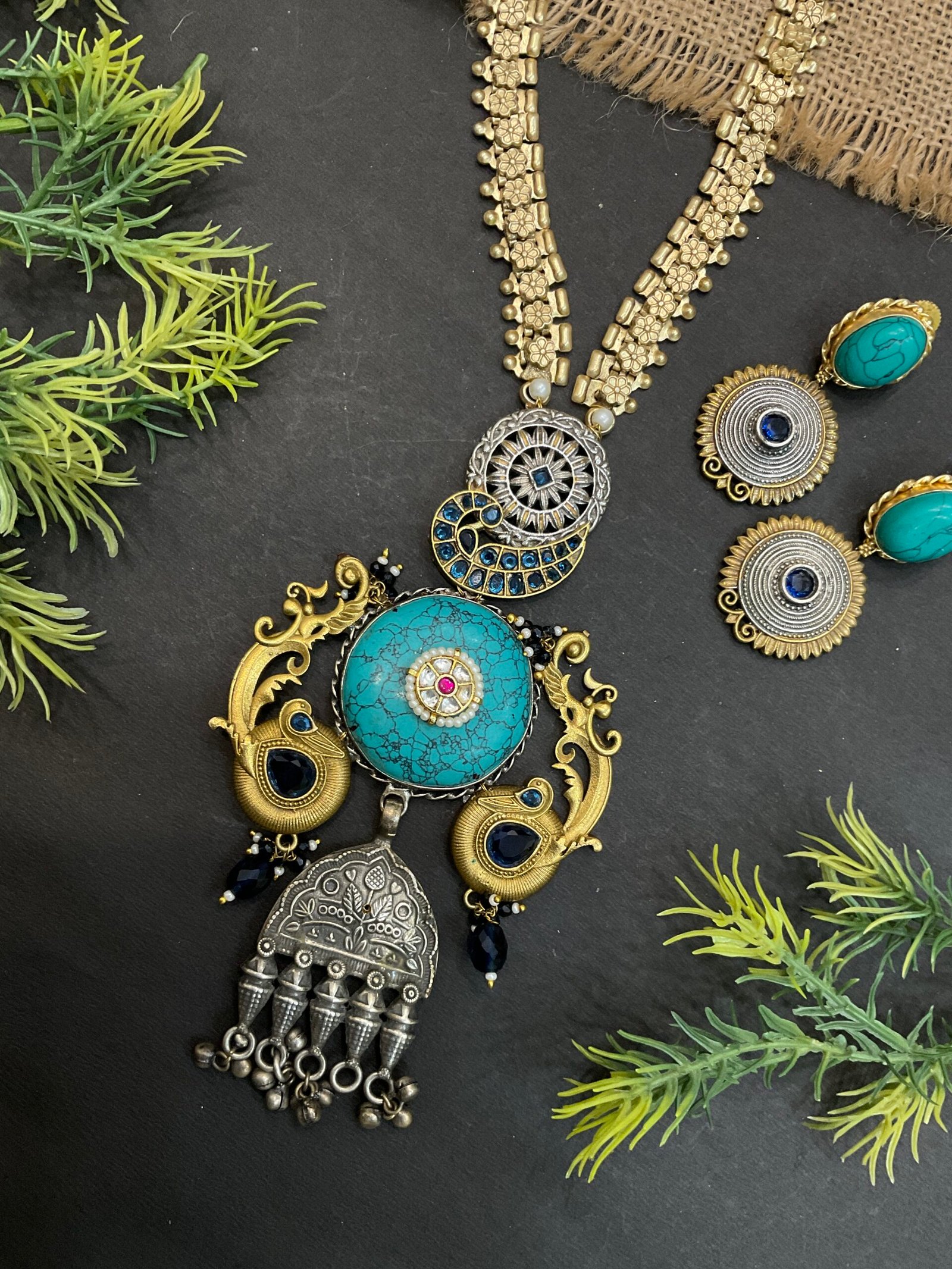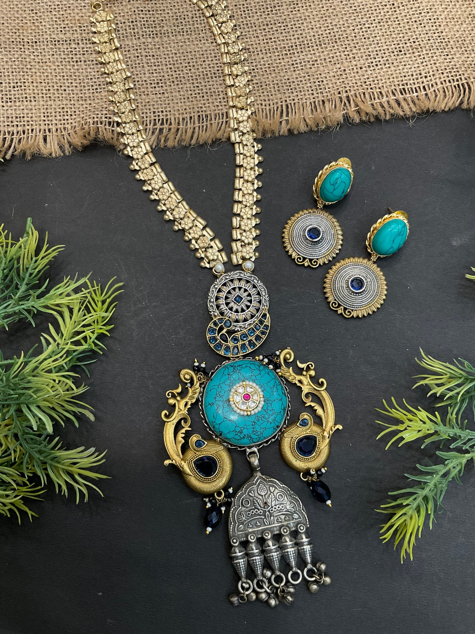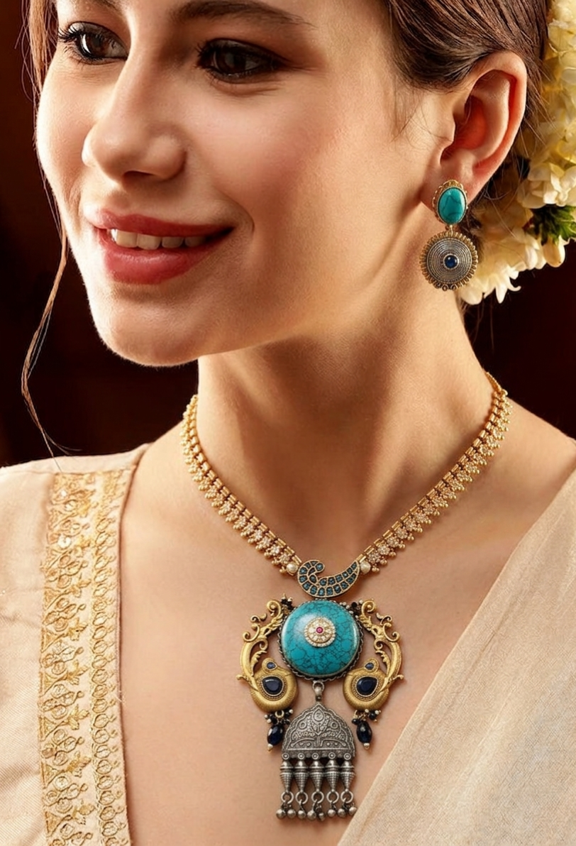 This striking two-tone necklace set is designed to create a bold and artistic statement. The necklace features a beautifully detailed gold-tone chain with floral-inspired links that give it a rich traditional look. At the center is an elaborate pendant crafted in both antique gold and silver finishes, creating a unique contrast that makes the design stand out. The pendant is adorned with a large turquoise stone in the middle, bringing a fresh and vibrant touch to the entire piece.