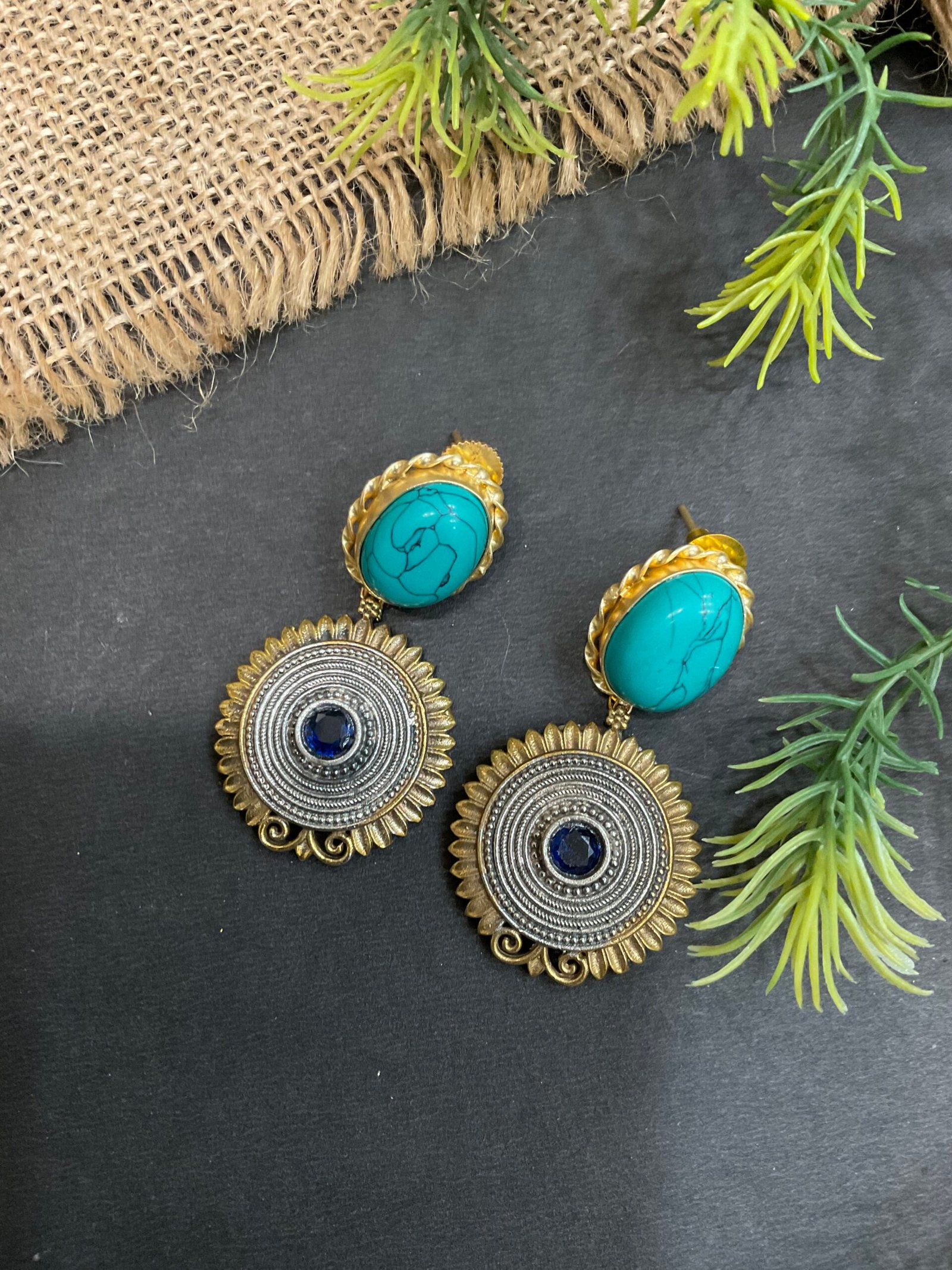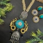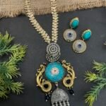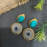 The matching earrings perfectly complement the necklace with turquoise oval stones at the top and circular two-tone drops below, finished with blue center stones for a coordinated look. This necklace set is perfect for festive occasions, weddings, cultural events, and special celebrations. It pairs beautifully with sarees, Indo-western outfits, and designer ethnic wear, adding elegance and a distinctive touch to your overall style.