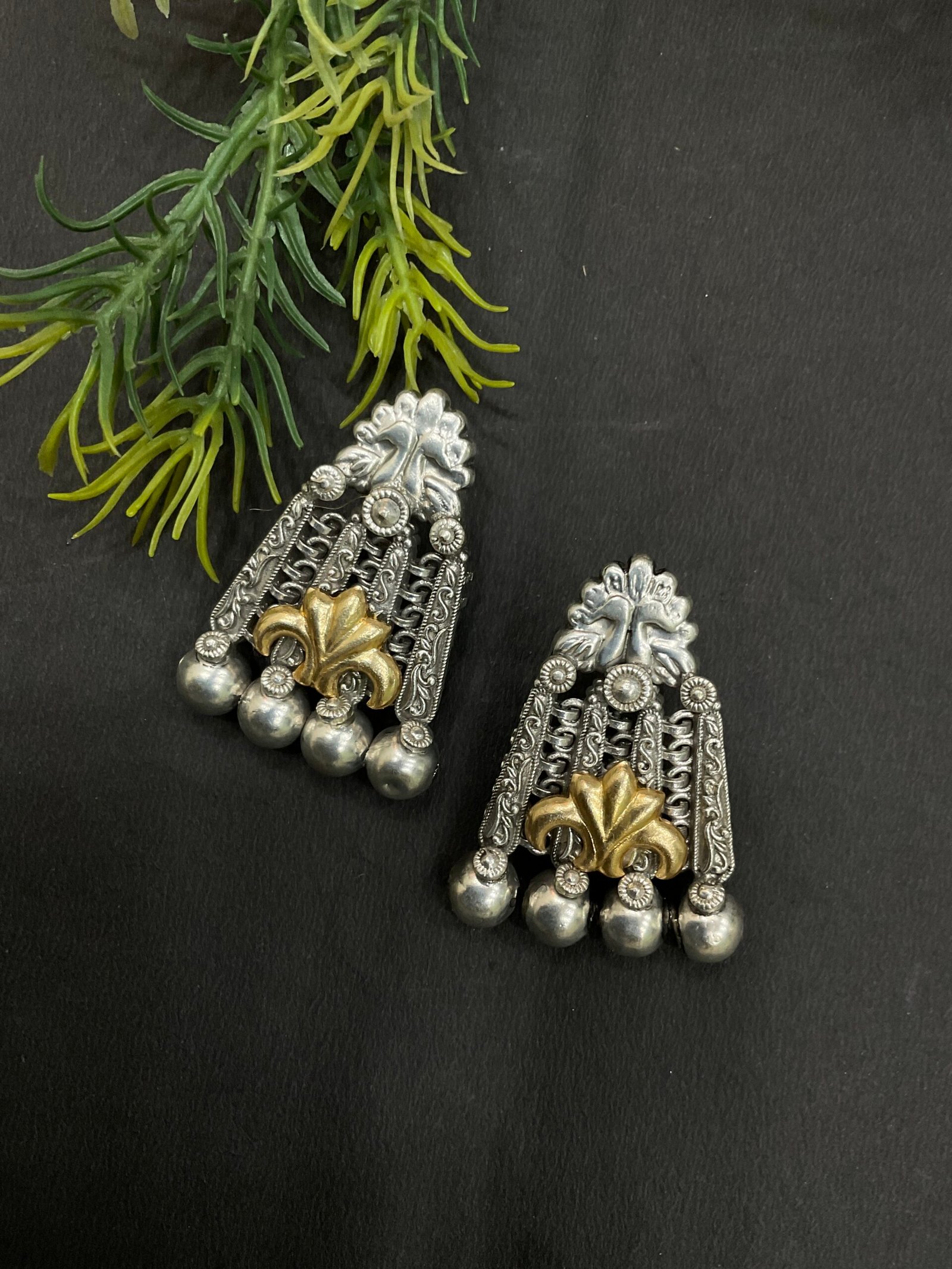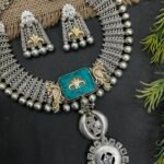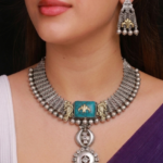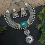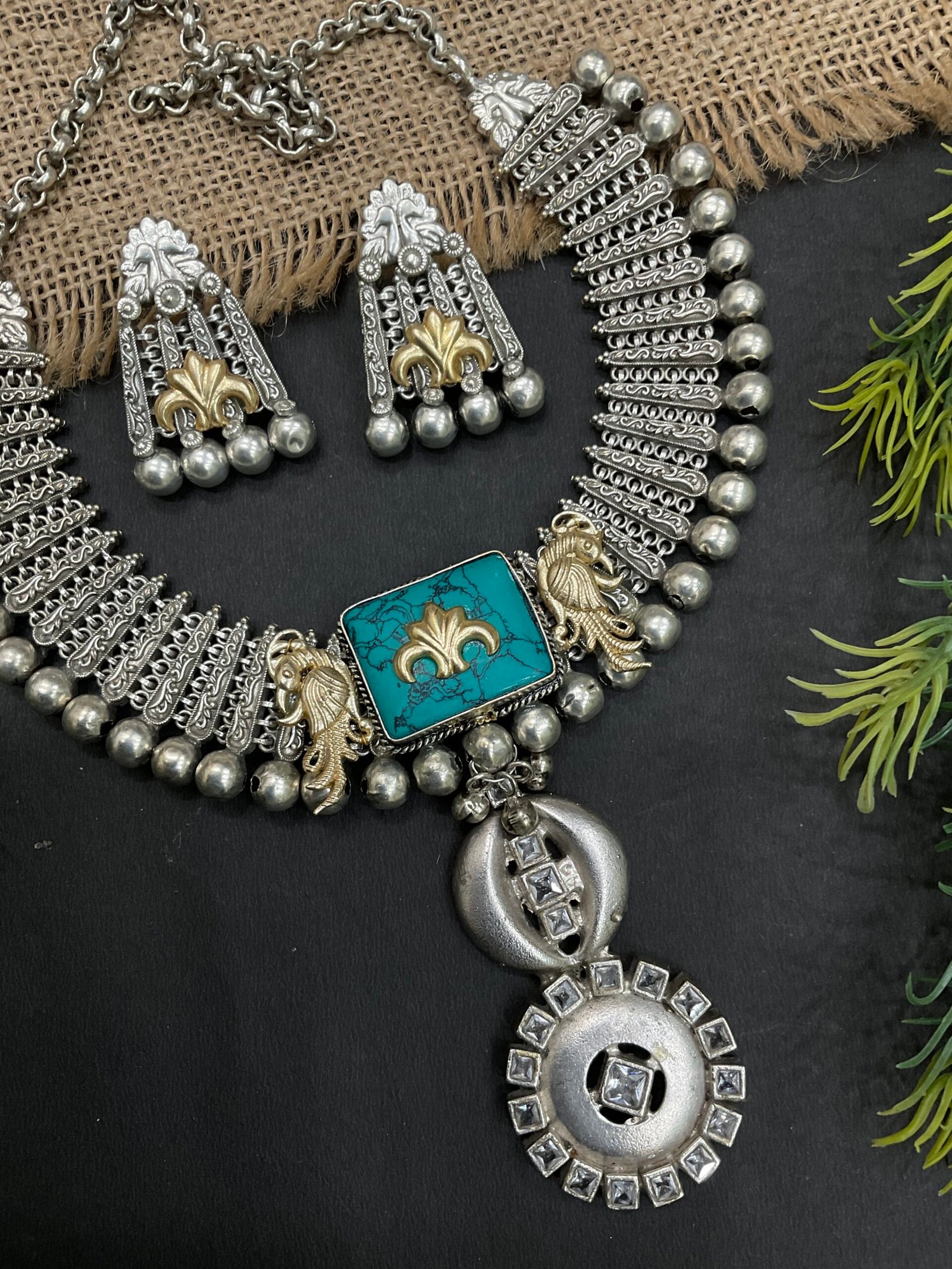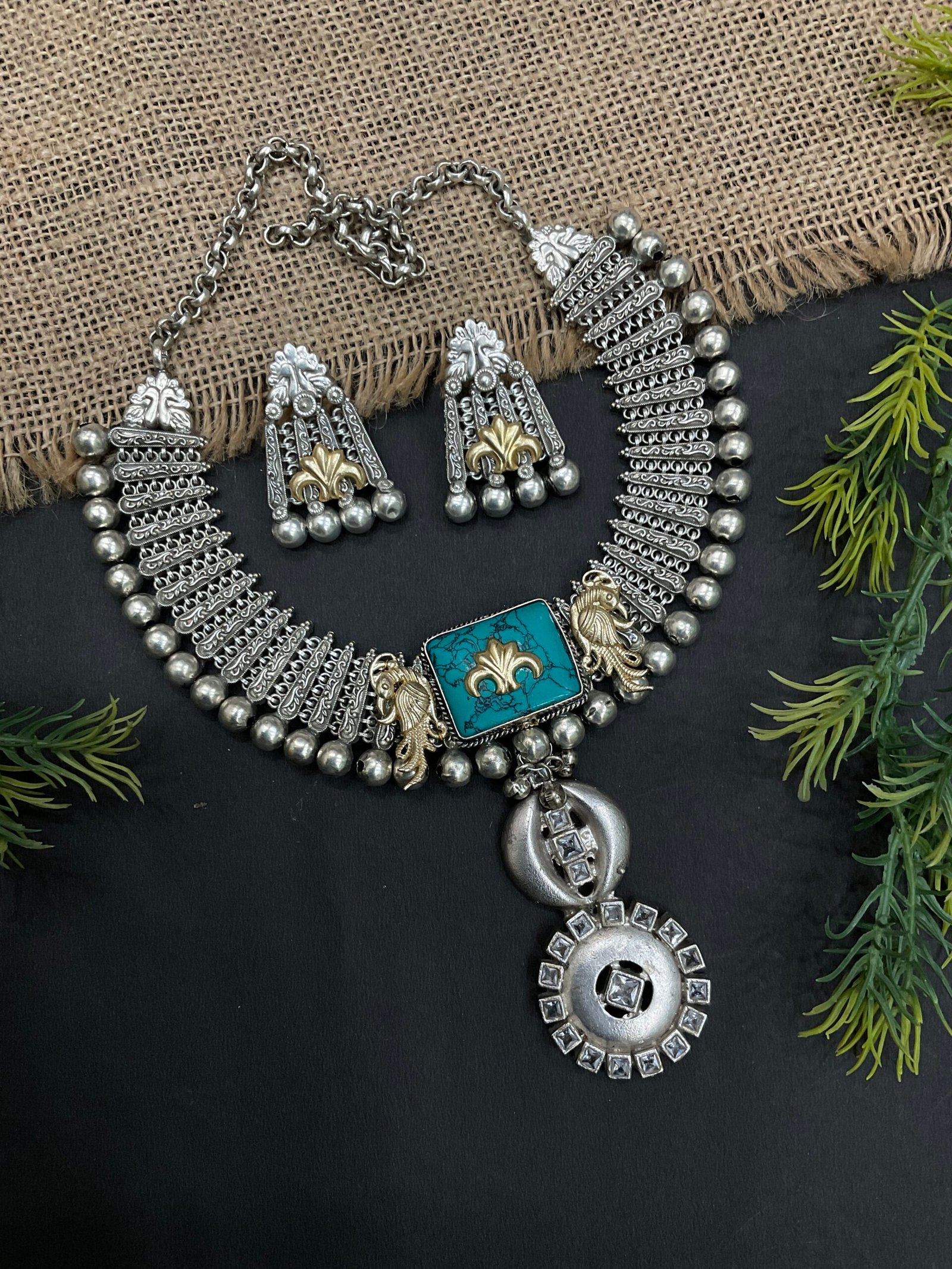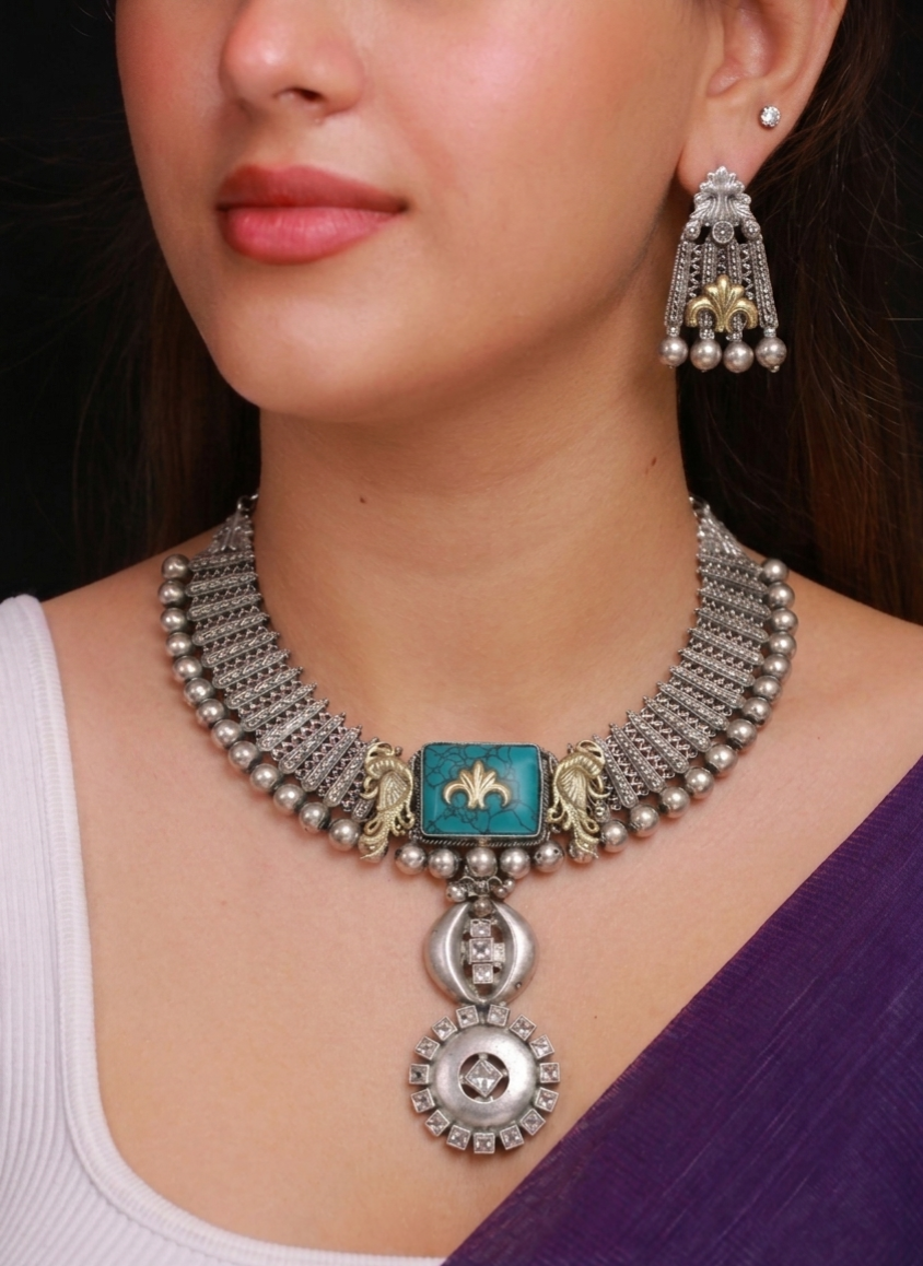 This beautiful silver necklace set has a traditional design with a bold and elegant look. The necklace is made with detailed silver-toned metal pieces arranged in a layered pattern that gives it a rich handcrafted feel. Small silver beads are placed all around the lower edge, adding soft movement and a graceful finish to the design. In the center, a bright turquoise blue stone creates a stunning contrast against the antique silver color, making the necklace stand out beautifully. Golden floral accents and delicate bird motifs on both sides of the stone add a unique artistic touch that enhances its ethnic charm.