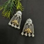 The matching earrings are designed in the same style, featuring silver detailing with small dangling beads and a golden floral pattern in the middle. The long pendant attached to the necklace adds extra beauty with its circular design and sparkling stone details, making the set look more festive and eye-catching. This silver necklace set is perfect for weddings, festive occasions, traditional outfits, or anyone who loves statement jewelry with a classic and stylish appearance.