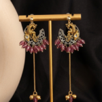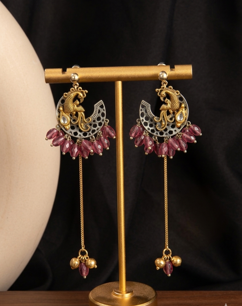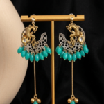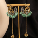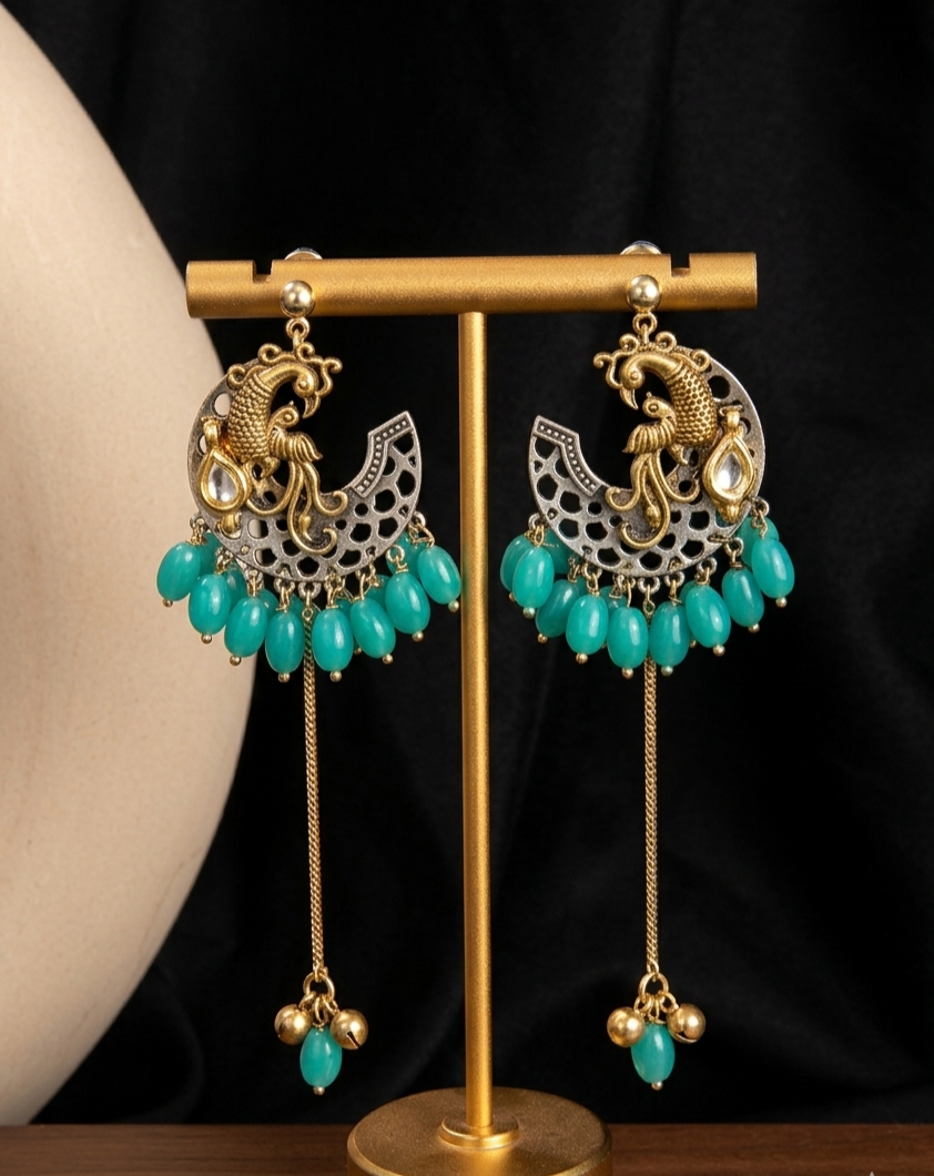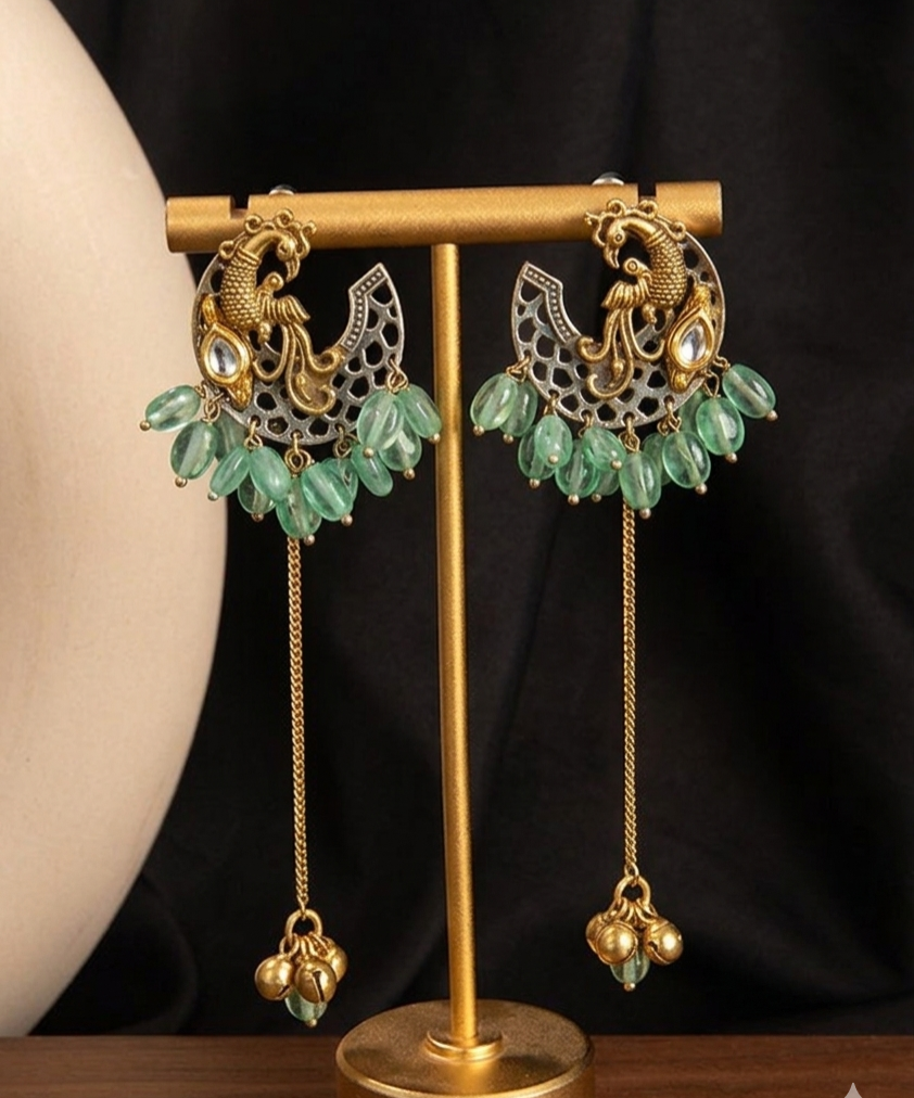 These elegant 4-inch earrings beautifully blend traditional charm with a modern touch. Featuring a detailed peacock motif on top, the design symbolizes grace and beauty. The antique gold finish pairs perfectly giving it a rich and artistic look. The soft mint-green beads add a refreshing pop of color, while the long chain drop at the bottom creates graceful movement, making these earrings perfect for festive and special occasions.